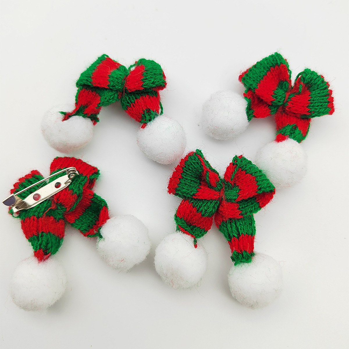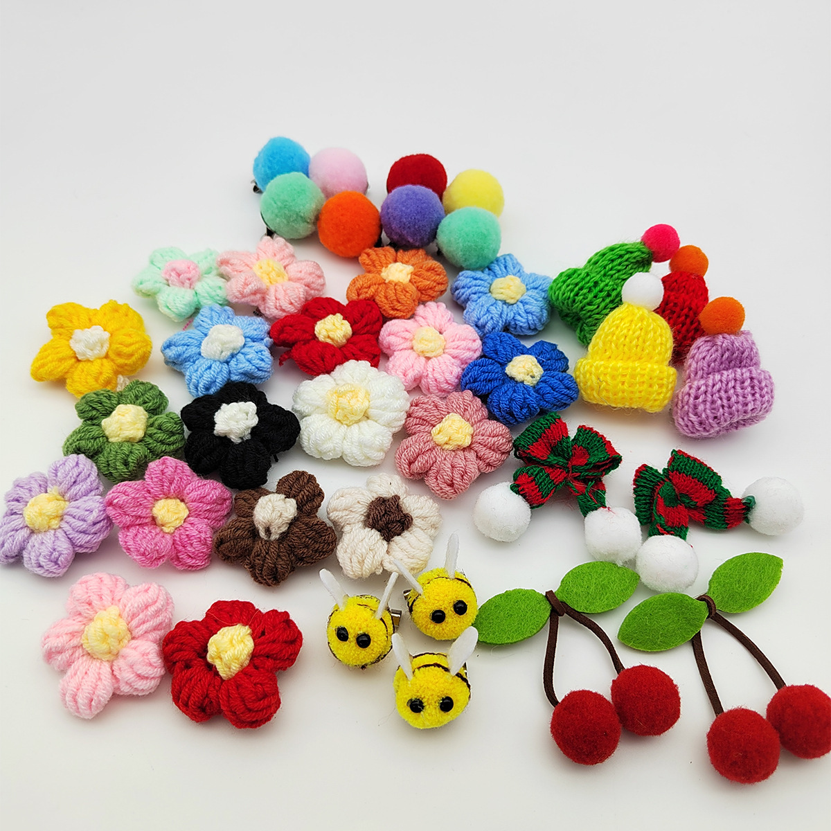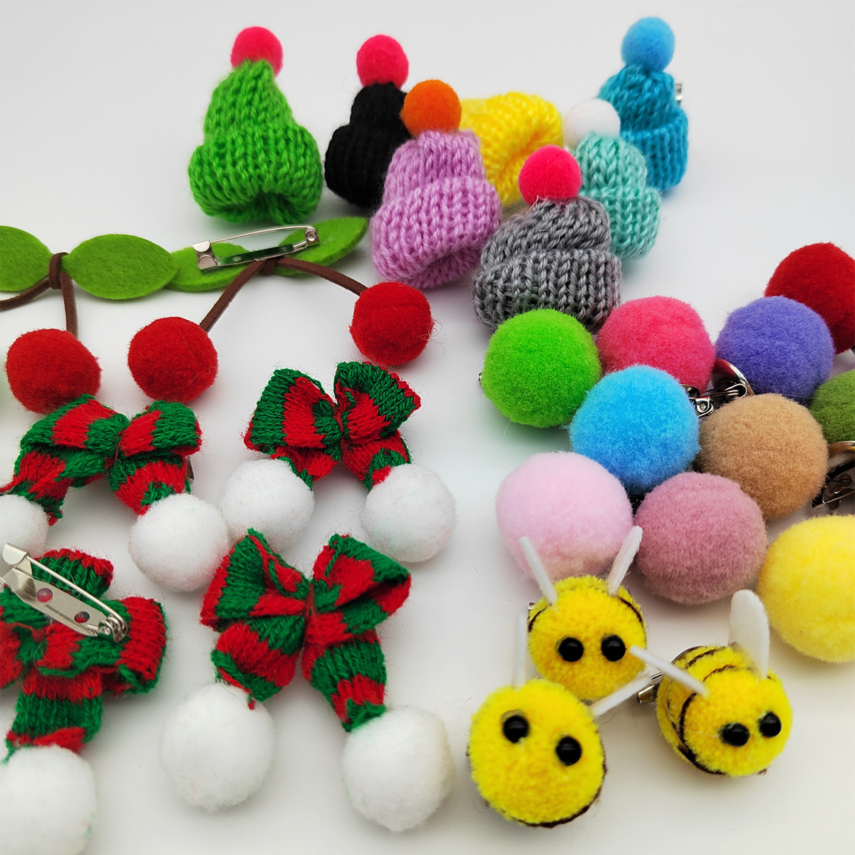 вязаная брошь с цветком; маленькая брошь вишня; брошка маленькая пчелка; брошь из мехового шара; маленькая шляпная брошь; Рождественская брошь-бантик