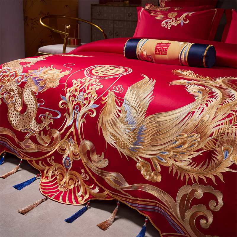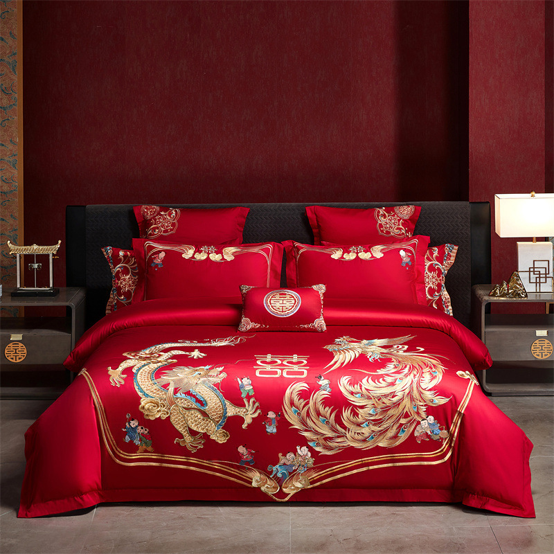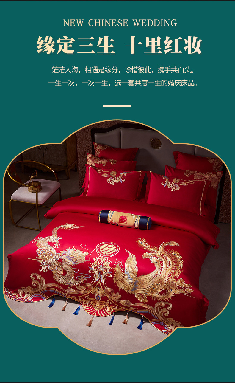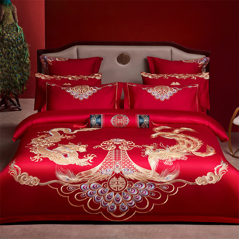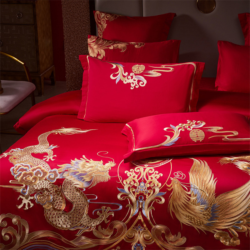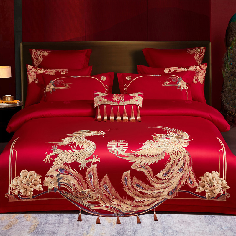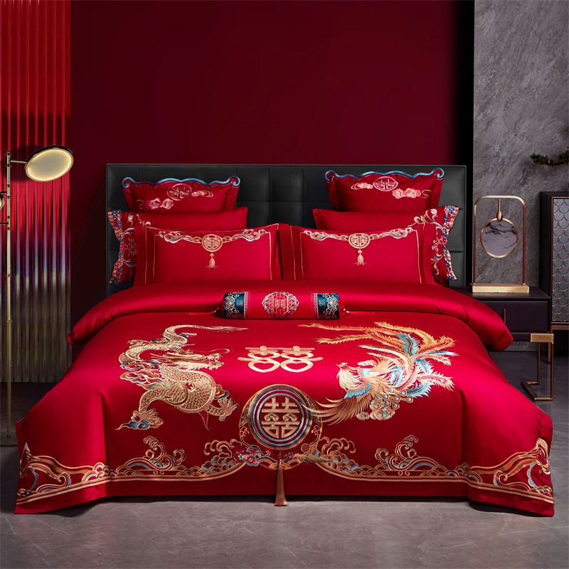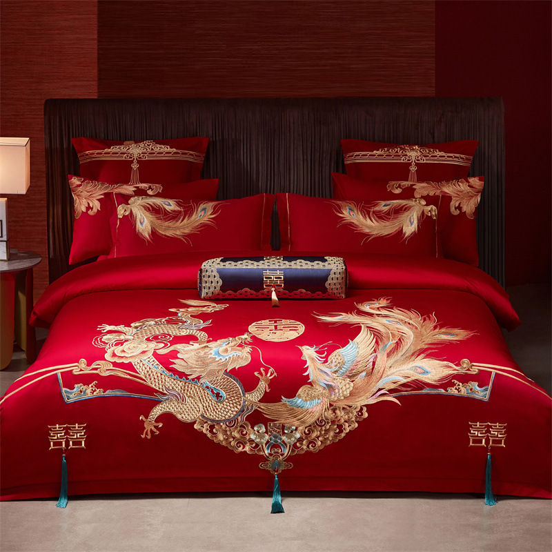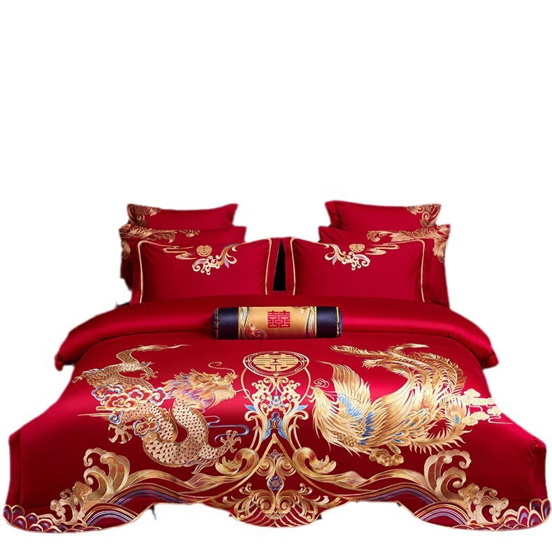 Свадебный комплект в новом китайском стиле с вышивкой дракона и феникса, из сатина 160S и длинноволокнистого хлопка, комплект из четырех предметов, легкая роскошь, высококачественный, для торжественных случаев с драконом и фениксом