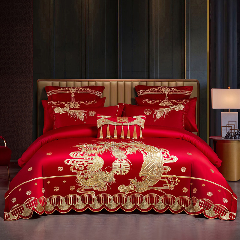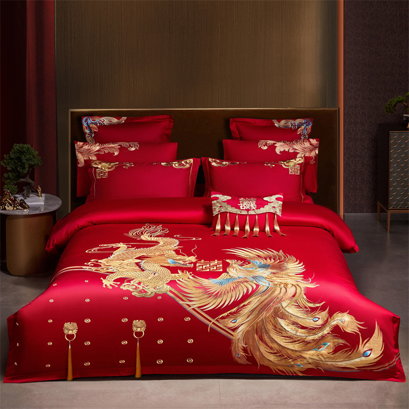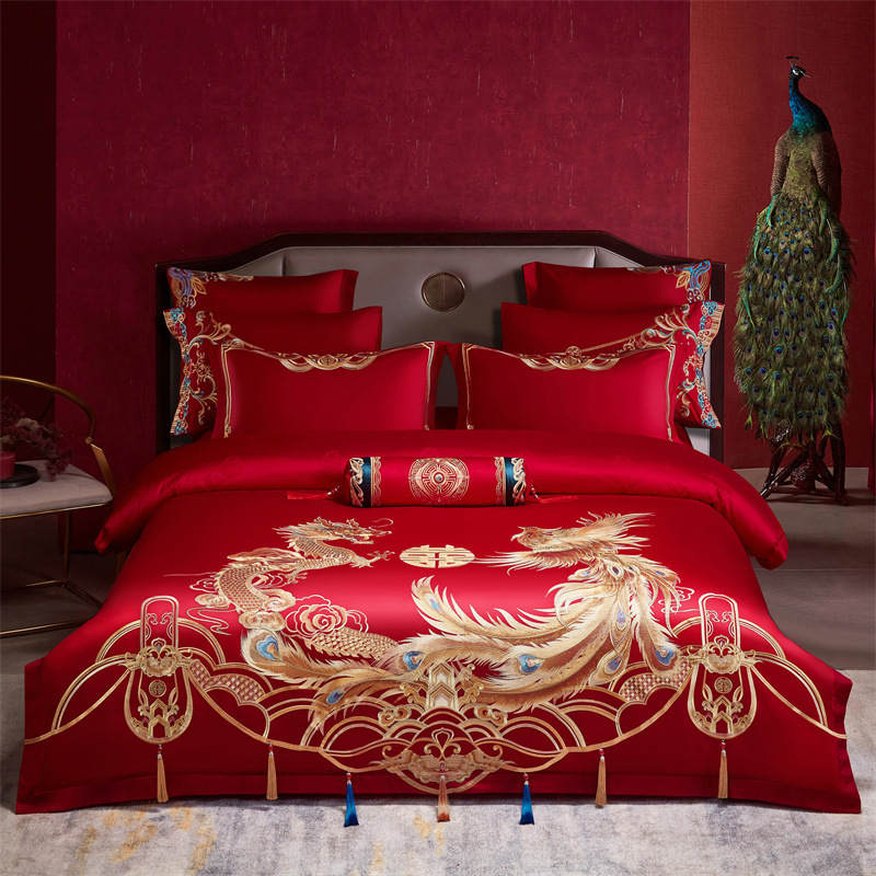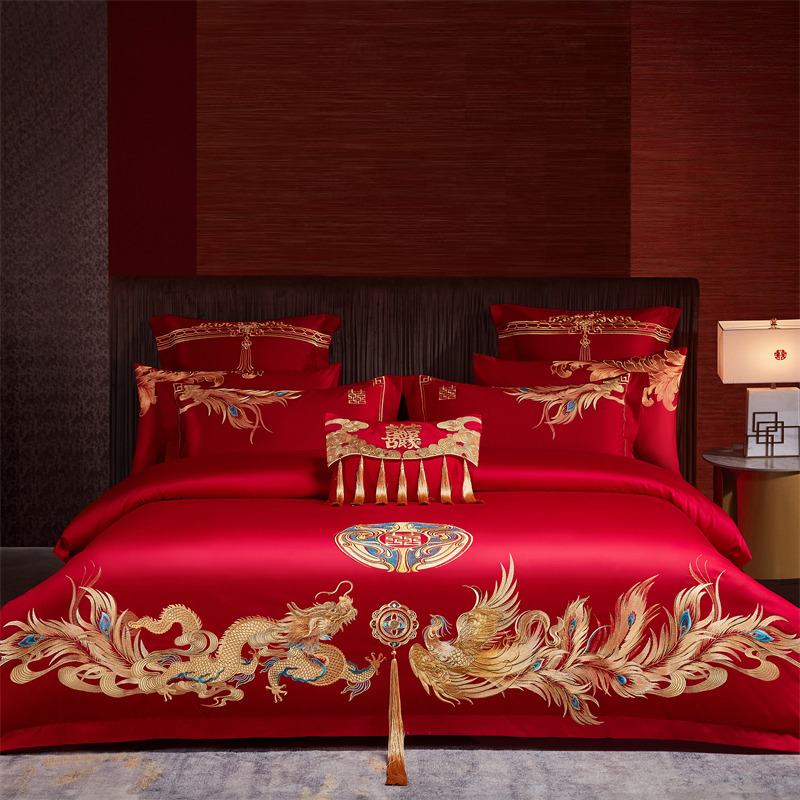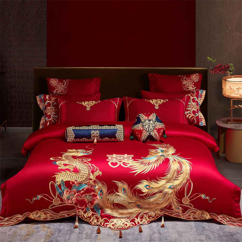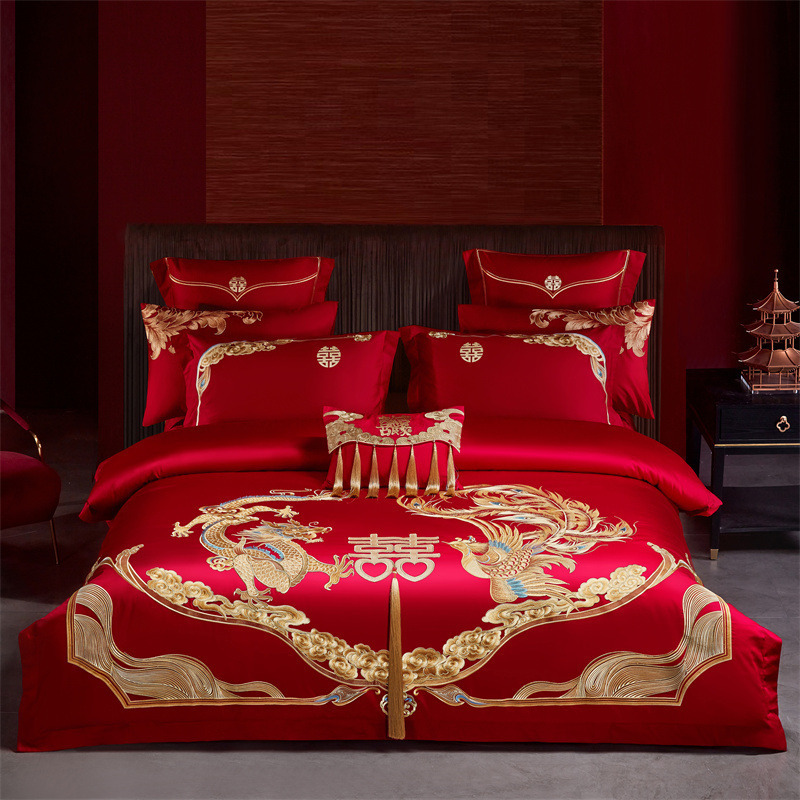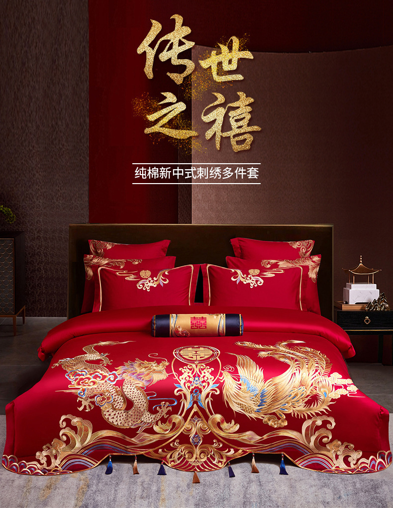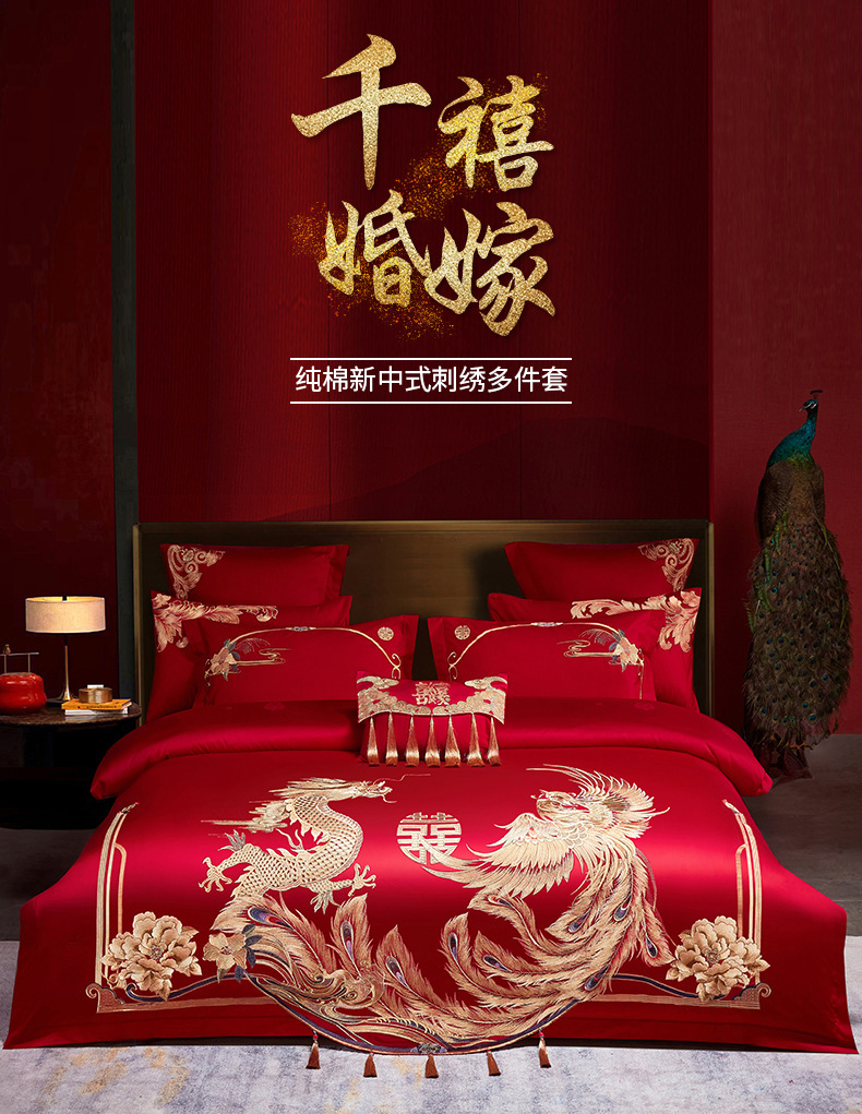 Свадебный комплект в новом китайском стиле с вышивкой дракона и феникса, из сатина 160S и длинноволокнистого хлопка, комплект из четырех предметов, легкая роскошь, высококачественный, для торжественных случаев с драконом и фениксом