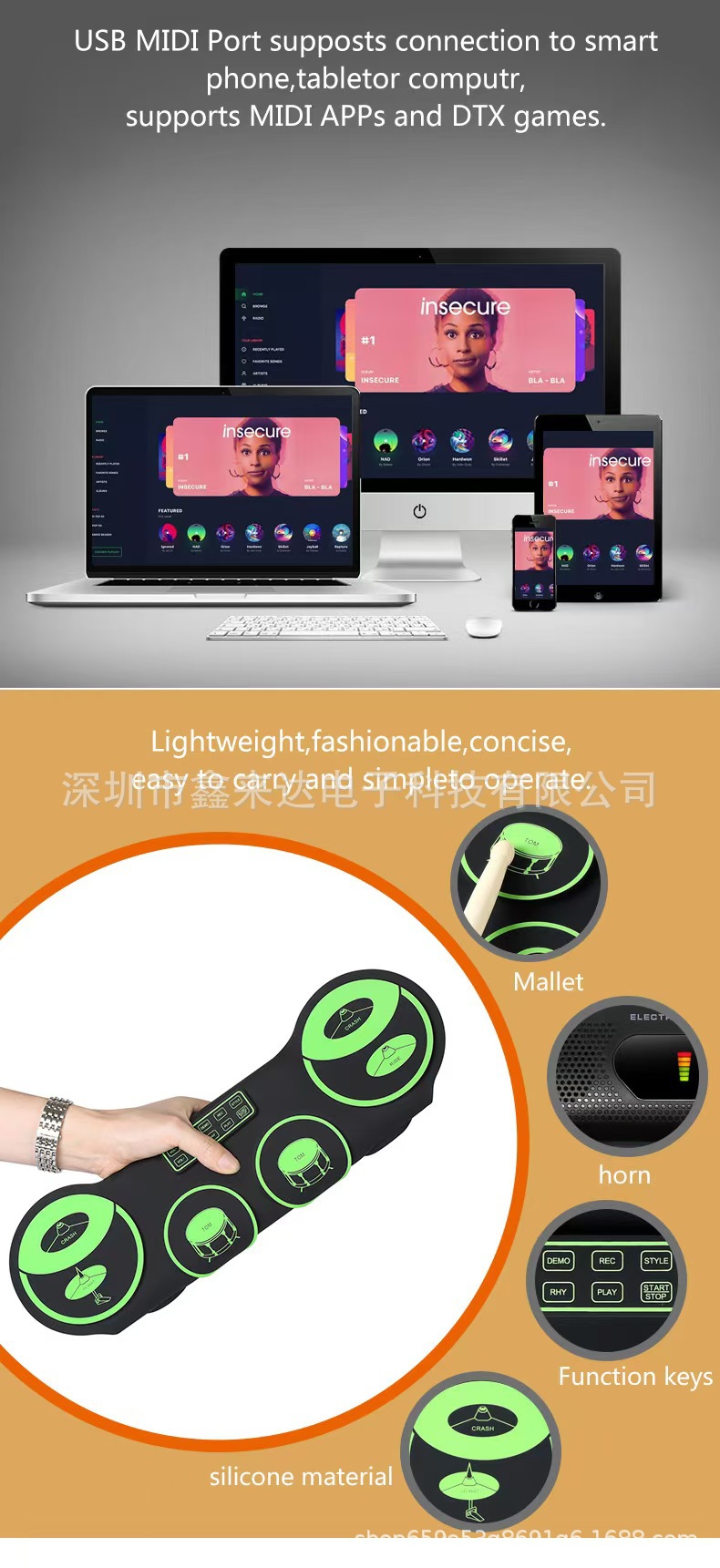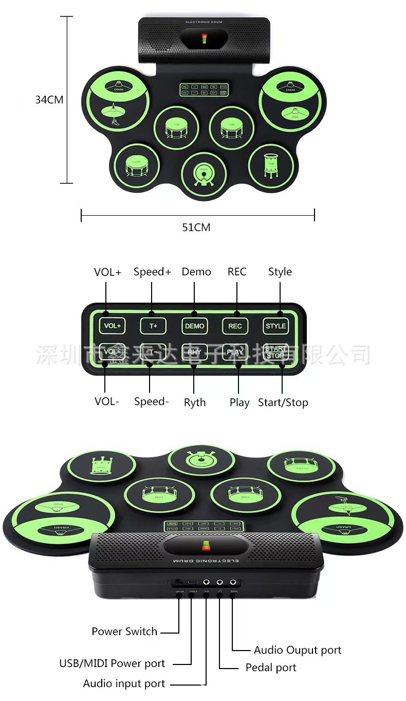 4.USB MIDI接口,可连接电脑、平板或手机,配合APP使用,兼容各类电鼓游戏与软件;