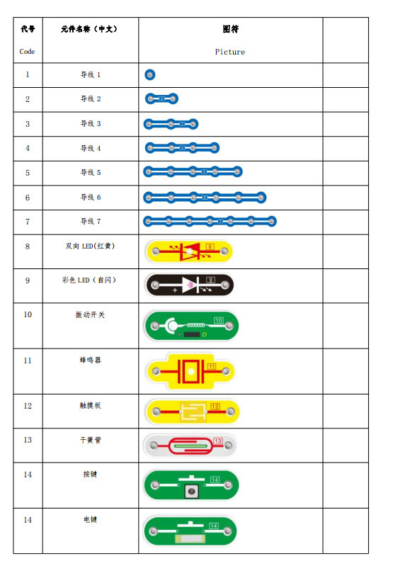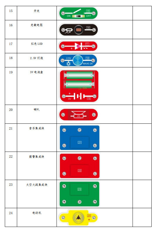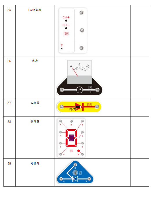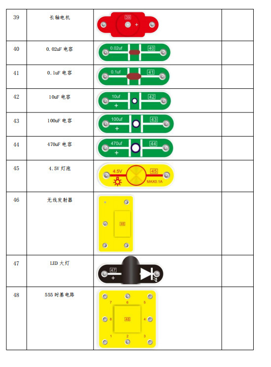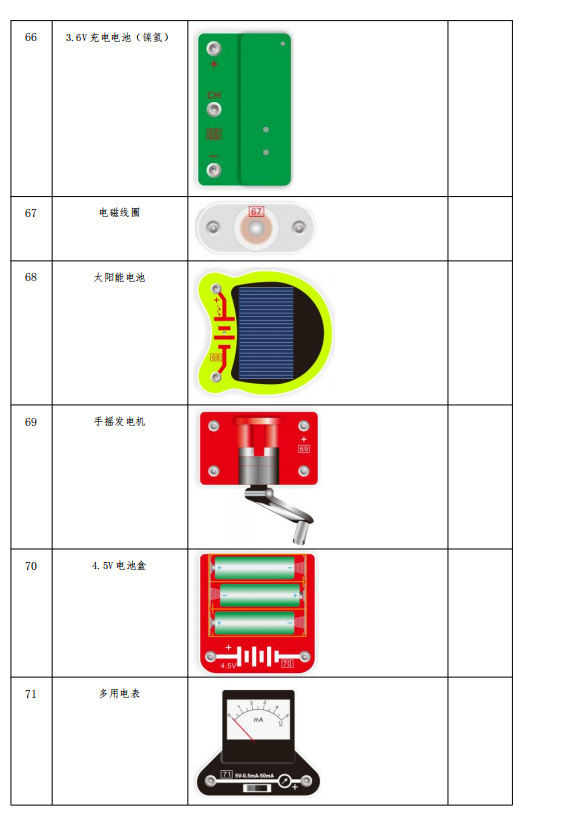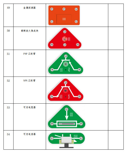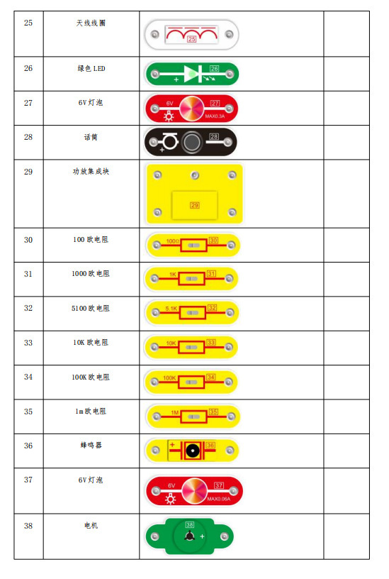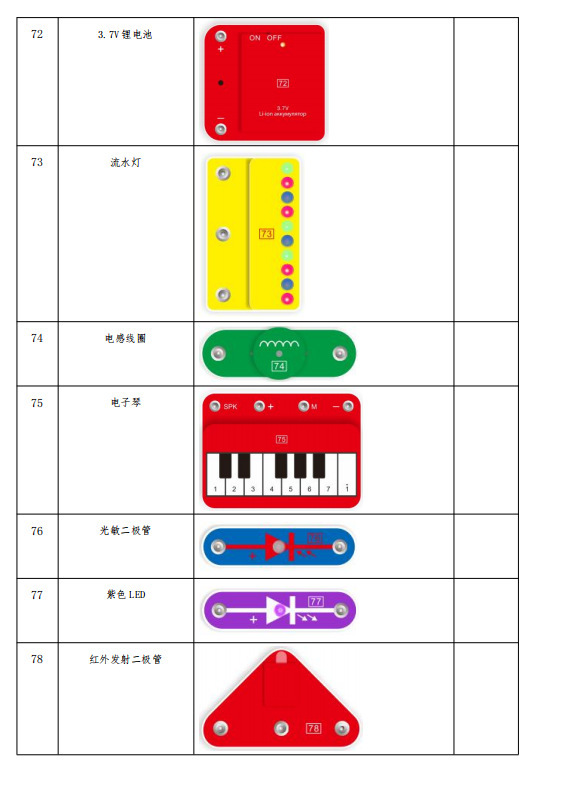 Провод №1; Провод №2; Провод №3; Провод №4; Провод №5; №6 провод; Провод №7; Двунаправленный светодиод №8 (красный и желтый); Цветной светодиод №9 (самосвечение); Вибрационный переключатель № 10; Зуммер №11; Трекпад №12; Геркон №13; Электрический ключ №14; Переключатель №15; Фоторезистор №16; №17 красный светодиод; Лампа № 18 2,5 В (с патроном); № 19 Батарейный блок 3 В; Динамик №20; Блок музыкальной интеграции №21; Блок интеграции сигналов тревоги №22; Интеграционный блок космической войны № 23; двигатель № 24; Катушка антенны №25; Лампочка № 26 6 В.; Лампочка № 27 6 В.; Микрофон № 28; Интегрированный блок усилителя мощности № 29; № 30 резистор 100 Ом; № 31 Резистор 1000 Ом; Резистор № 32, 5,1 кОм.; Резистор № 33, 10 кОм.; Резистор № 34, 100 кОм; № 35 Европейский резистор 1 м; Зуммер №36; Лампочка № 37 6 В.; Мотор №38; Двигатель с длинной осью № 39; Конденсатор № 40 0,02 мкФ; Конденсатор №41 0,1 мкФ; Конденсатор № 42 емкостью 10 мкФ; Конденсатор № 43, 100 мкФ.; Конденсатор № 44 470 мкФ; Лампочка № 45 4,5 В.; Беспроводной передатчик № 46; Светодиодная фара №47; Схема развертки № 48 555; Металлоискатель №49; Интегрированный блок высокочастотного усиления № 50; Транзистор №51 ПНП; Транзистор НПН №52; Переменный резистор №53; Переменный конденсатор № 54; № 55 FM-радио; №56 простой электросчетчик; Диод №57; Цифровая трубка № 58; Тиристор №59; Трансформатор №60; Реле №61; Записывающая версия № 62.; Мотор вентилятора № 64; Генератор №65; Электромагнитная катушка № 67; Солнечная батарея № 68; Ручной генератор №69; Батарейный отсек № 70, 4,5 В; Мультиметр №71; Литиевая батарея № 72, 3,7 В.; №73 водяная лампа; Катушка индуктивности № 74; Фотодиод №76; № 77 Фиолетовый светодиод; Инфракрасный излучающий диод № 78; Экран с точечной матрицей № 79; Мигающий вентилятор № 80; Красочный свет №82; Многоцелевой счетчик №83; Ветер листьев; волоконно-оптическое дерево; Сборка большой опорной плиты; Сборка небольшой опорной плиты; магнит