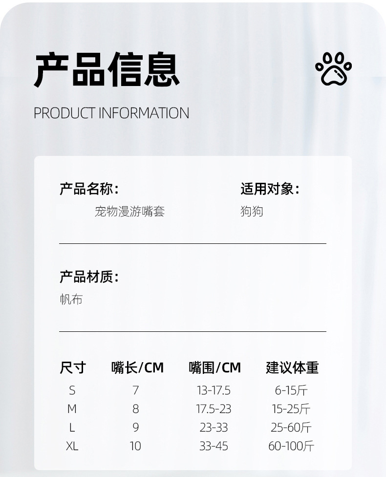 S (рекомендуемый вес 3-7.5kg кг) намордник для собак; М (рекомендуемый вес 7.5-12.5kg ); L (рекомендуемый вес 12.5-30kg ); XL (рекомендуемый вес 30-50kg )