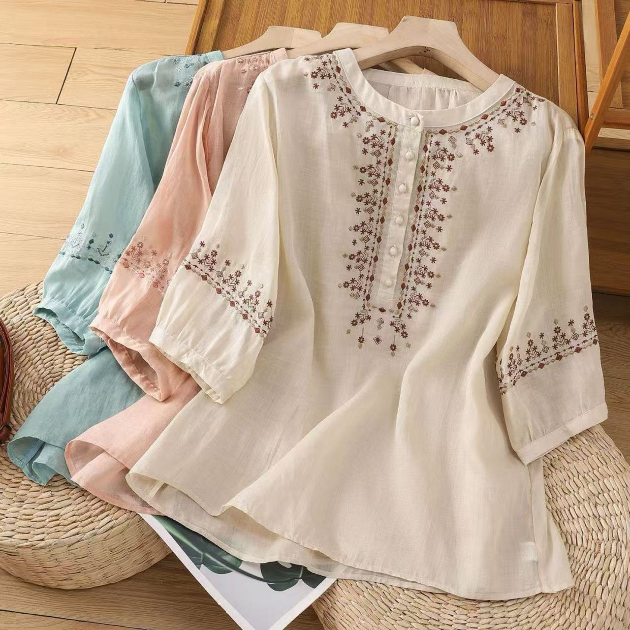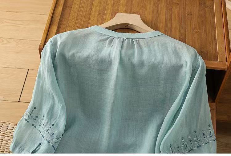 Ретро рубашка из хлопка и льна, женская рубашка с рукавами четверти, весенне-осенний новый стиль, свободная рубашка для мам среднего возраста, закрывающая живот, с вышивкой
