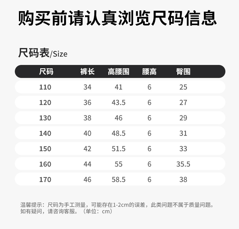 110cm; 120cm; 130cm; 140cm; 150cm; 160cm; 170cm