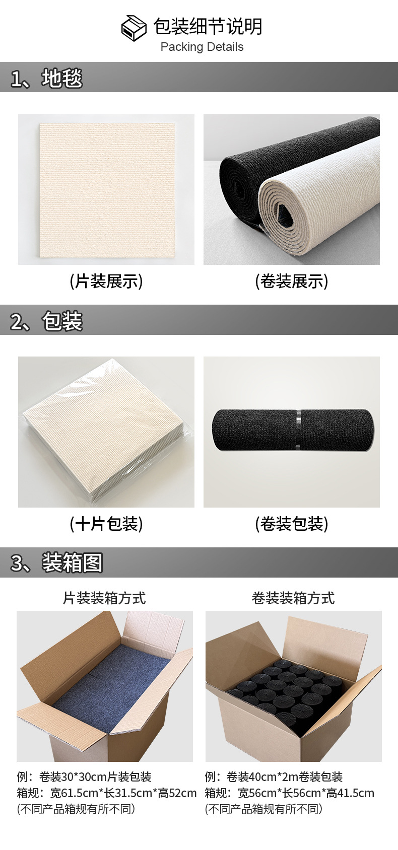 我们的地毯背面自带胶层,为满足家装级别的粘贴牢固性,胶性较强,长期铺设后可能在地面上留有少量胶印。