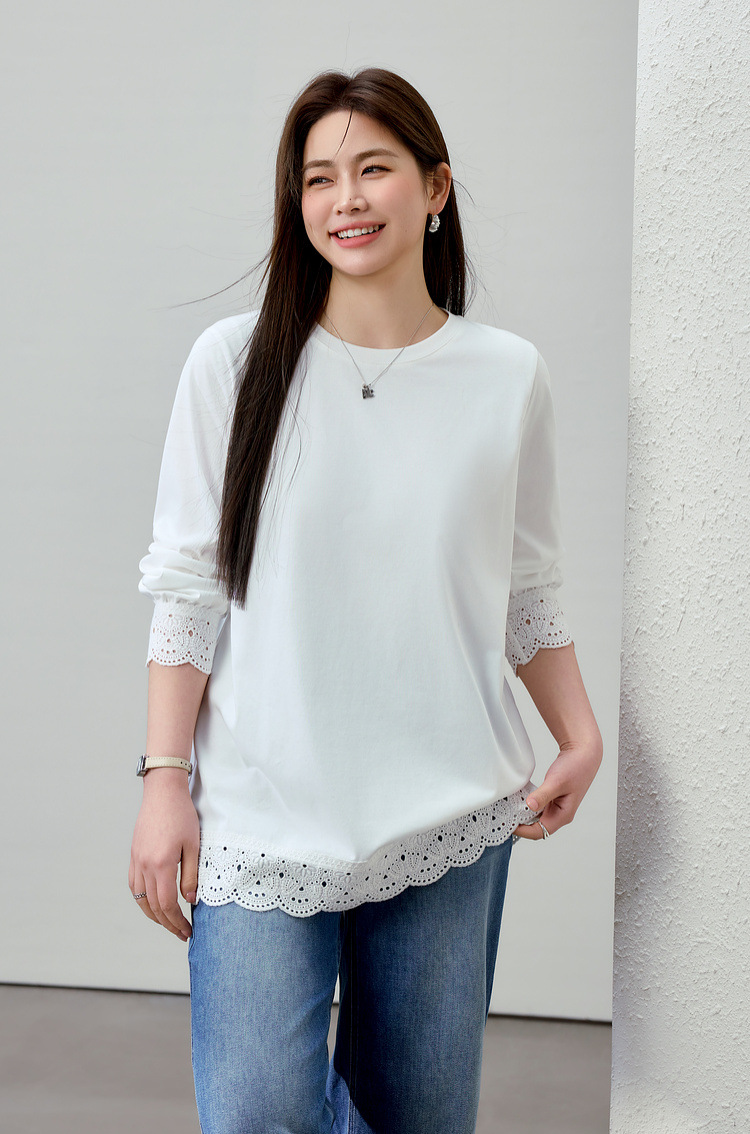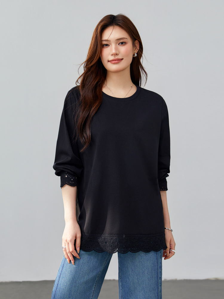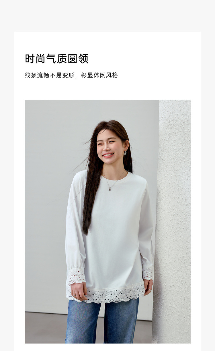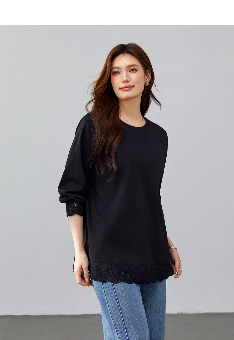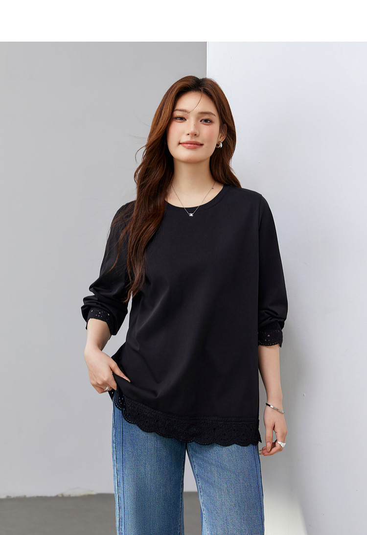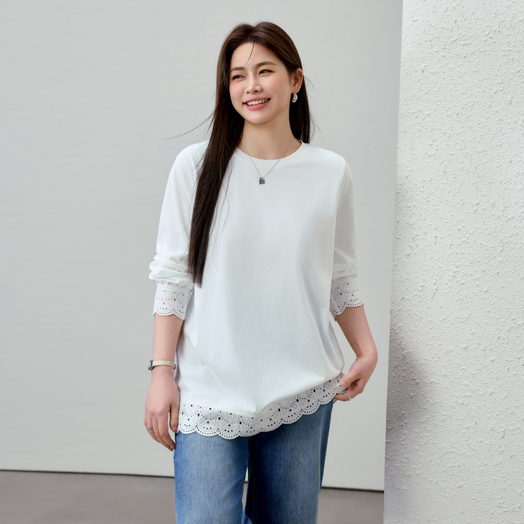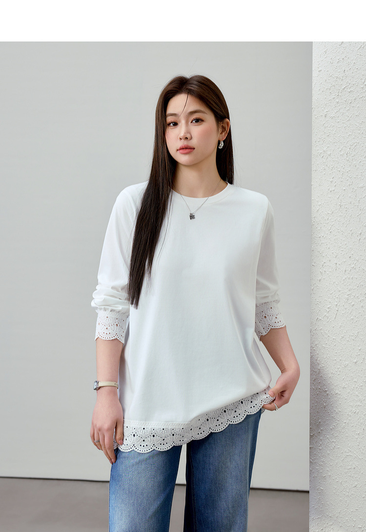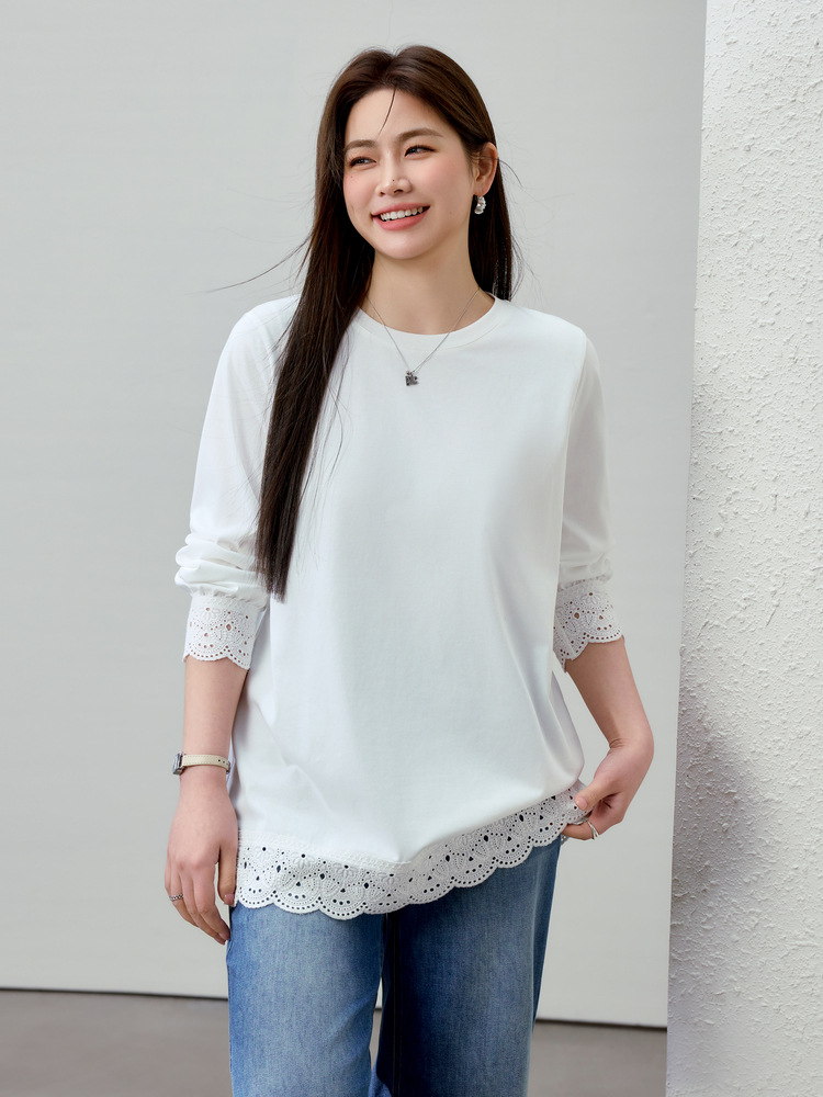 [Модный кружевной сшитый дизайн тонкая футболка] Funny Show большой размер женский толстый mm2025 весенний стиль новый