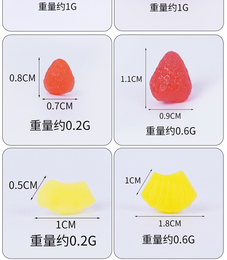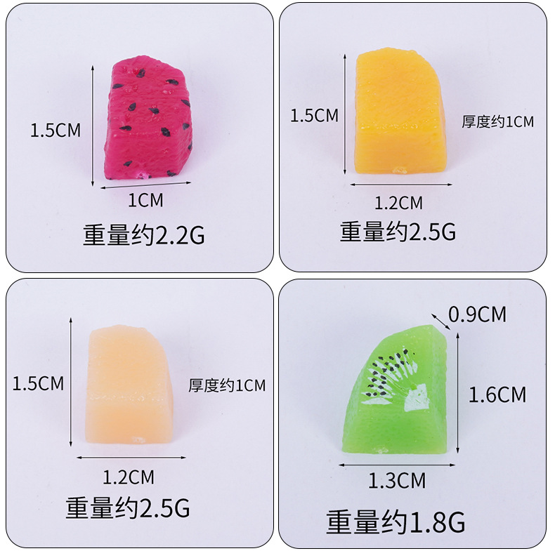 Небольшие ломтики шелковицы шириной 0,7 см.; 1,5 см шелковицы; Маленькая светло-голубая черника 0,7 см.; Маленькая оранжевая черника 0,7 см.; Маленькая фиолетовая черника 0,7 см.; 1,2 см средней темно-синей черники; Маленькая светло-голубая черника 1,2 см.; Большая светло-голубая черника диаметром 1,9 см.; Большая оранжевая черника размером 1,9 см.; Большая фиолетовая черника диаметром 1,9 см.; Большая темно-синяя черника диаметром 1,9 см.; Маленькая темная черника 1,2 см.; 2,2 см маленький черный брусник; 2,2 см маленькая малина; Маленькие кусочки желтого персика 0,7 см.; Мини-апельсиновая вишня 1 см.; Маленькие желто-оранжевые сегменты диаметром 1,3 см.; Большие желто-оранжевые сегменты диаметром 2 см.; Большие лепестки красного грейпфрута диаметром 2 см.; Маленькая клубника 0,8 см.; 1,1 см средней темно-красной клубники; Средняя полупрозрачная красная клубника диаметром 1,1 см.; Клубника размером 1,9 см.; 1,5 см средней темно-красной клубники + листья; 1,5 см средней полупрозрачной клубники + листья; небольшие ломтики ананаса толщиной 1 см; Крупные ломтики ананаса толщиной 1,8 см.; Маленькие кусочки драконового фрукта размером 1,5 см.; Маленькие кусочки манго диаметром 1,5 см.; Мелкие кубики дыни размером 1,5 см.; Маленькие кусочки киви диаметром 1,6 см.; Двойная фиолетовая вишня 1,5 см.; Двойная красная вишня 1,5 см.; Маленькая одиночная красная вишня диаметром 1,4 см.; Маленькая одиночная фиолетовая вишня диаметром 1,4 см.; Большая красная вишня диаметром 2,2 см.; Большая красная вишня диаметром 2,2 см.; Большая зеленая вишня диаметром 2,2 см.; Большая желтая вишня диаметром 2,2 см.; Листья мяты светло-зеленого цвета длиной 1,2 см.; Половина зеленого яблока 1,5 см.; кубики манго 1,5 см.