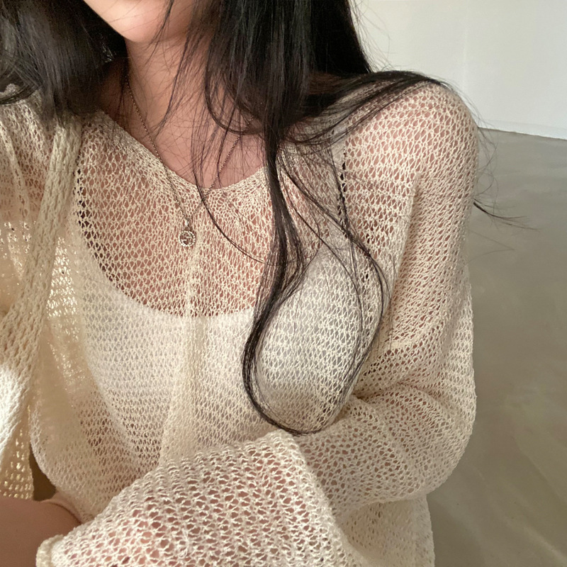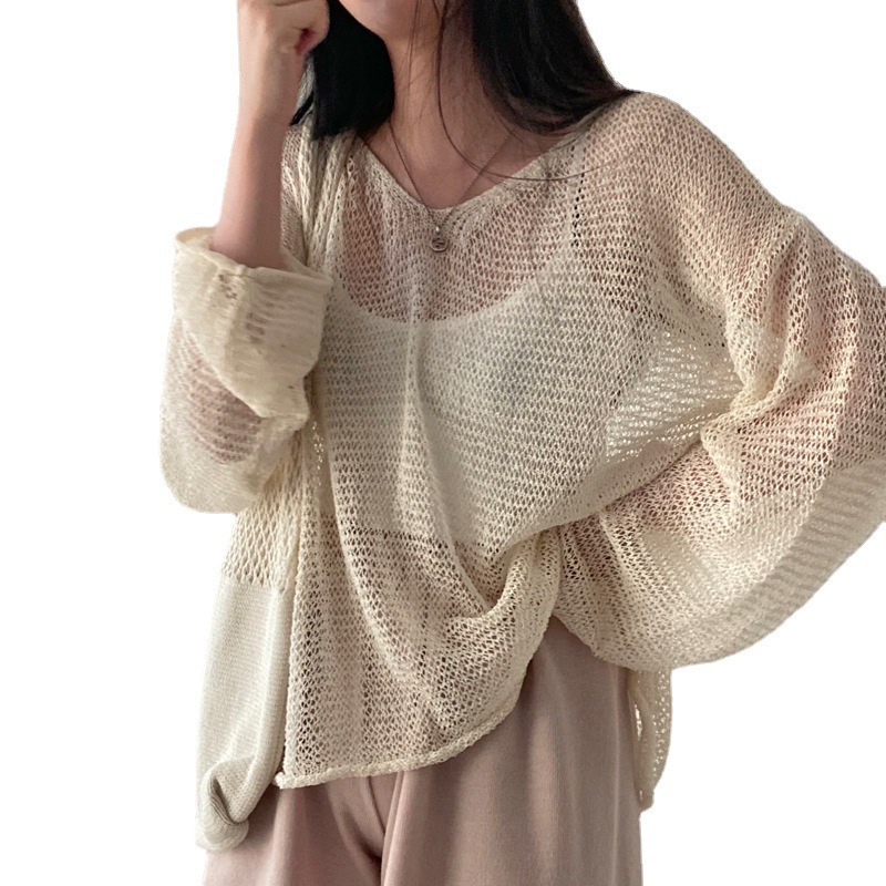 Полая трикотажная солнцезащитная рубашка женская весна и лето 2025 новая корейская версия тонкая блузка ленивый ветер свитер с длинными рукавами женский