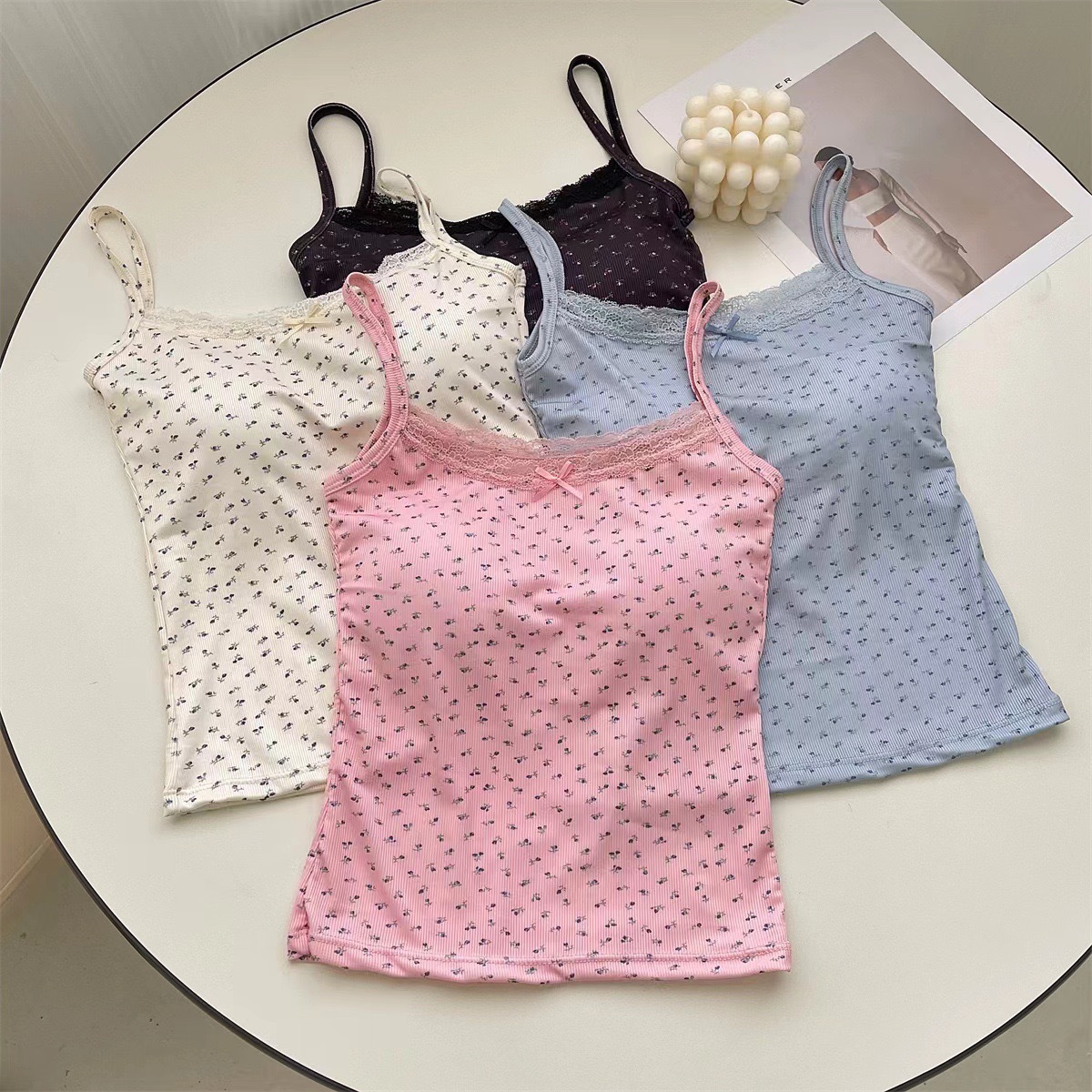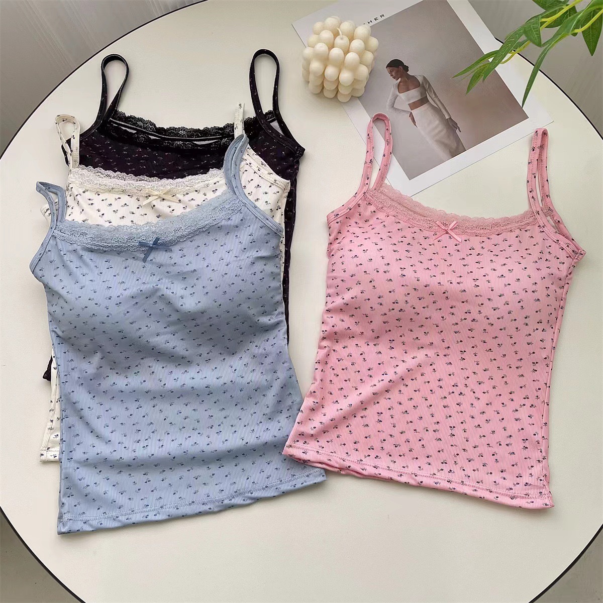 Популярная женская майка из ледяного шелка с цветочным кружевом и бантом для трансграничных прямых продаж, нежная и универсальная, придает облегченный вид маленьким бюстам, подходит для ношения как верхняя одежда