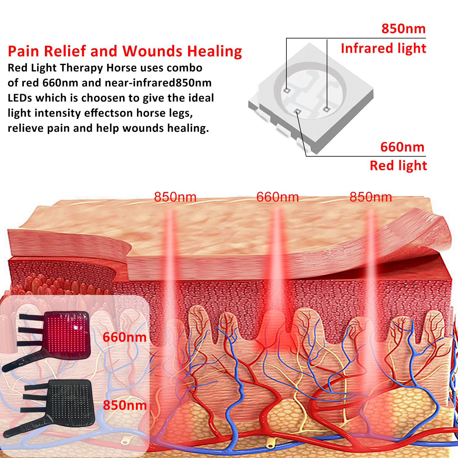 Терапевтический LED-аппарат для лошадей с красным и инфракрасным светом, для упражнений и обогрева ног, с ремнями и наколенниками