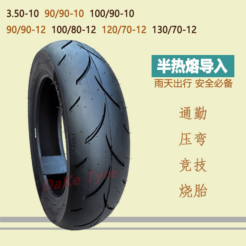 3.50-10, полугорячее шрамовое покрытие с высоким сцеплением, 8PR; 90/90-10, полугорячая шрамовая шина с высоким сцеплением 8PR; 100/90-10 с высоким сцеплением, полугорячее шрамовое 8PR; 90/90-12, полугорячее шрамовое покрытие с высоким сцеплением, 8PR; 100/80-12, полугорячая шрамовая шина с высоким сцеплением 8PR; 110/70-12, полугорячее шрамовое покрытие с высоким сцеплением, 6PR; 120/70-12, полугорячее прижимное шрамовое покрытие 6PR; 130/70-12, полугорячее шрамовое покрытие с высоким сцеплением, 6PR
