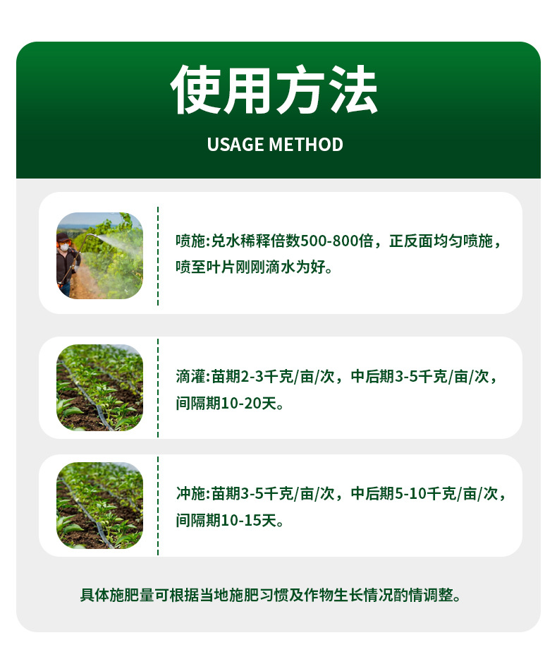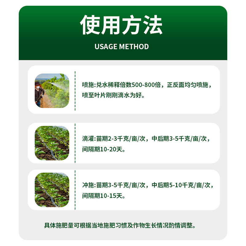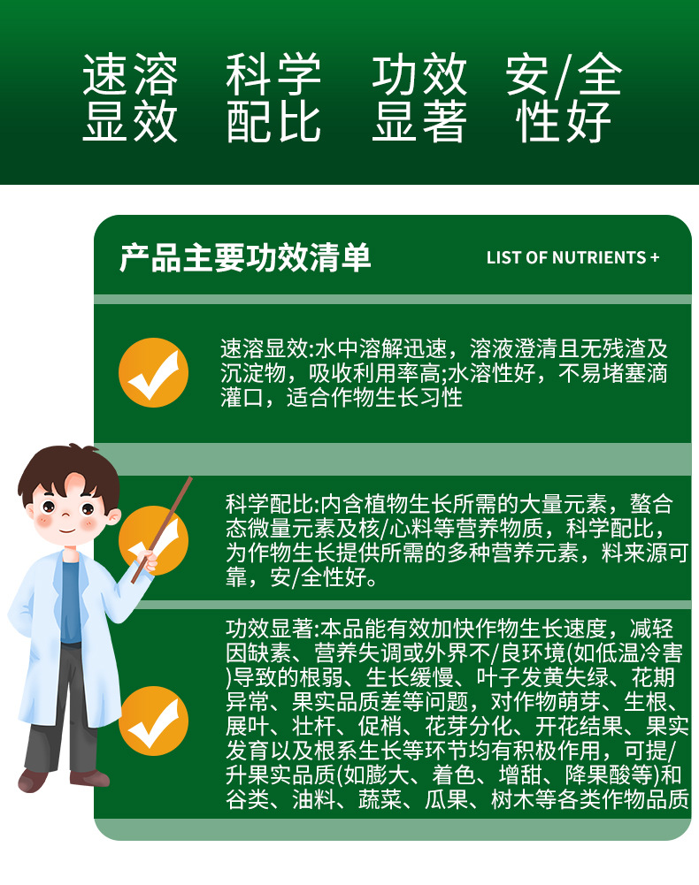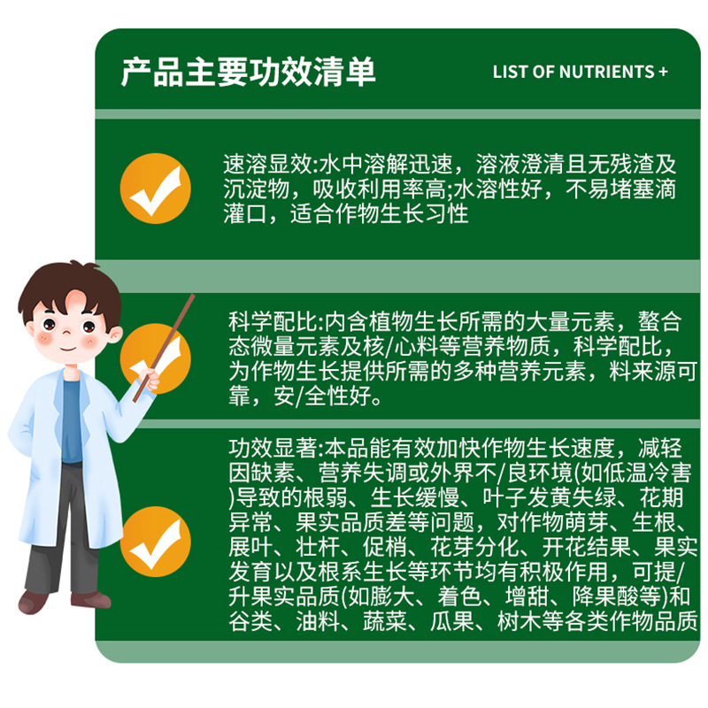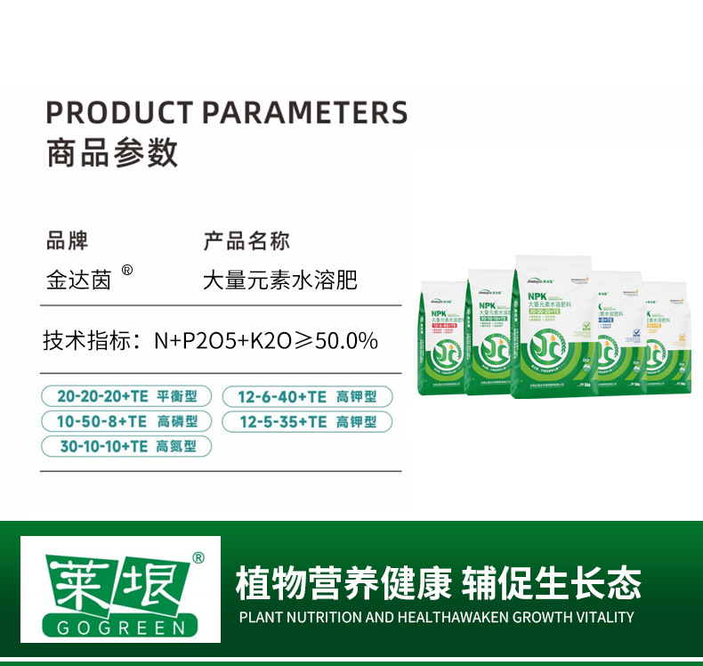 20-20-20+ТЕ сбалансированный тип; 12-6-40+ТЕ с высоким содержанием калия; 12-5-35+ТЕ с высоким содержанием калия; 30-10-10+ТЕ с высоким содержанием азота; 10-50-8+ТЕ с высоким содержанием фосфора; 18-46-0+TE с высоким содержанием фосфора; 6-6-45+TE с высоким содержанием калия, профессионал в области Синьцзяна; 12-33-9+TE с высоким содержанием фосфора, профессионал в области Синьцзяна