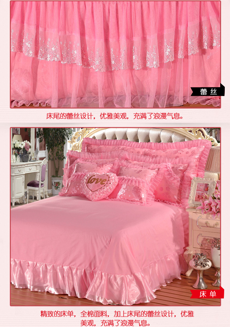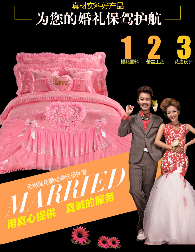 新款上市!蕾丝设计,款式新颖,是众多新婚佳人的必选床品。选用全棉贡缎大提花工艺,被面面料是贡缎提花,被里和床单是100%纯棉面料,四周采用了高端的蕾丝镶边。带给您高质量的睡眠。总是把美好的留给你!支持一件代发。