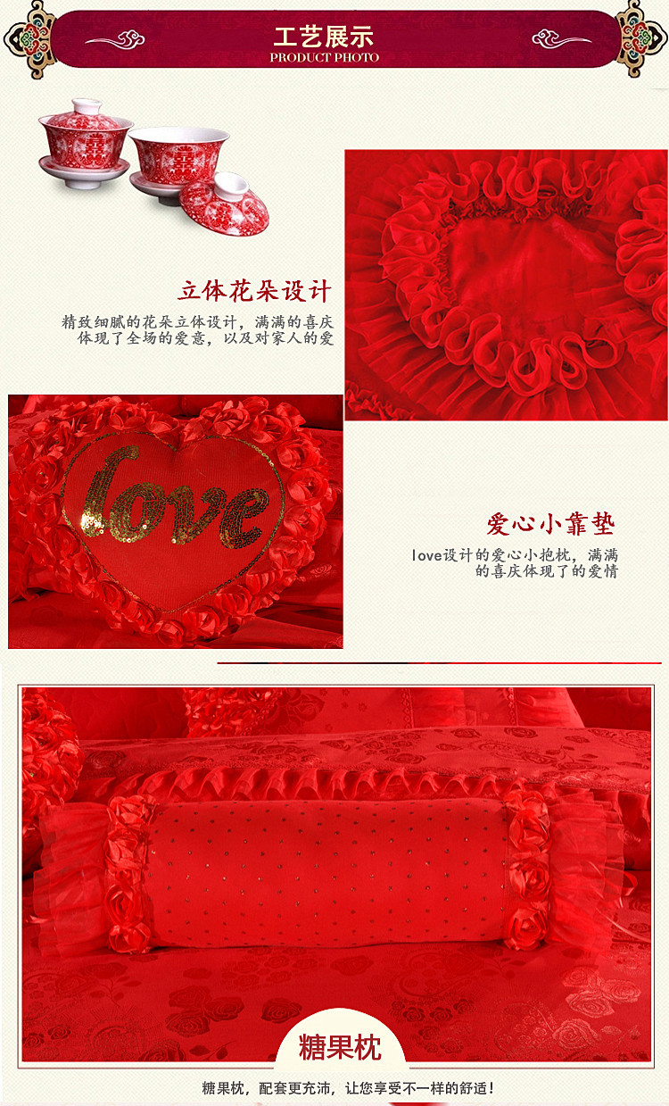 十件套:被套*1 床单*1 枕套*2 方垫套*2 糖果枕*1 小抱枕*1 双人枕*1 夹棉床盖*1(如需床单换夹棉床盖或床裙款请联系客服补差价)