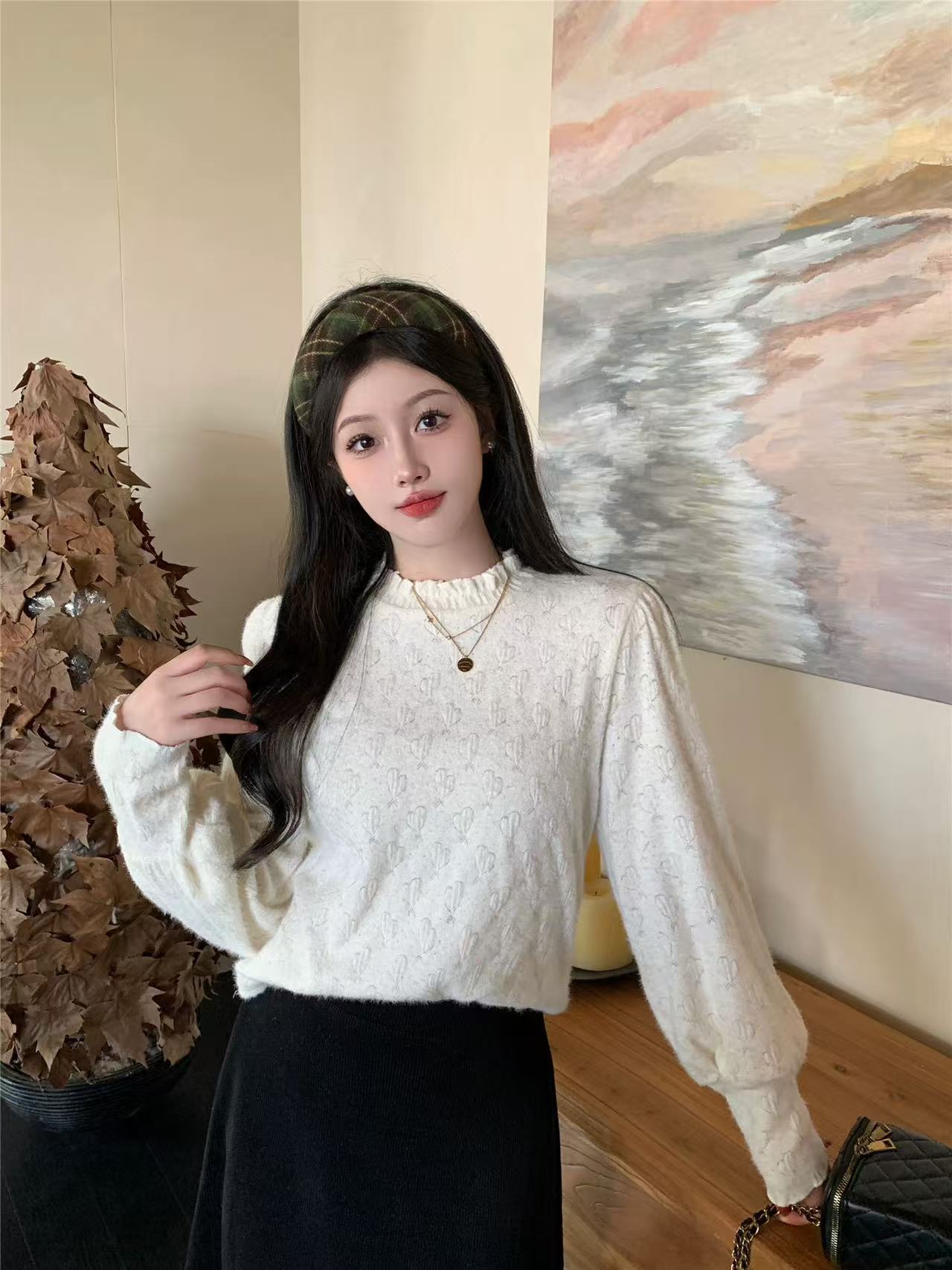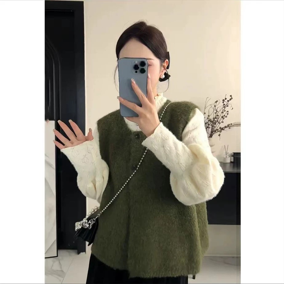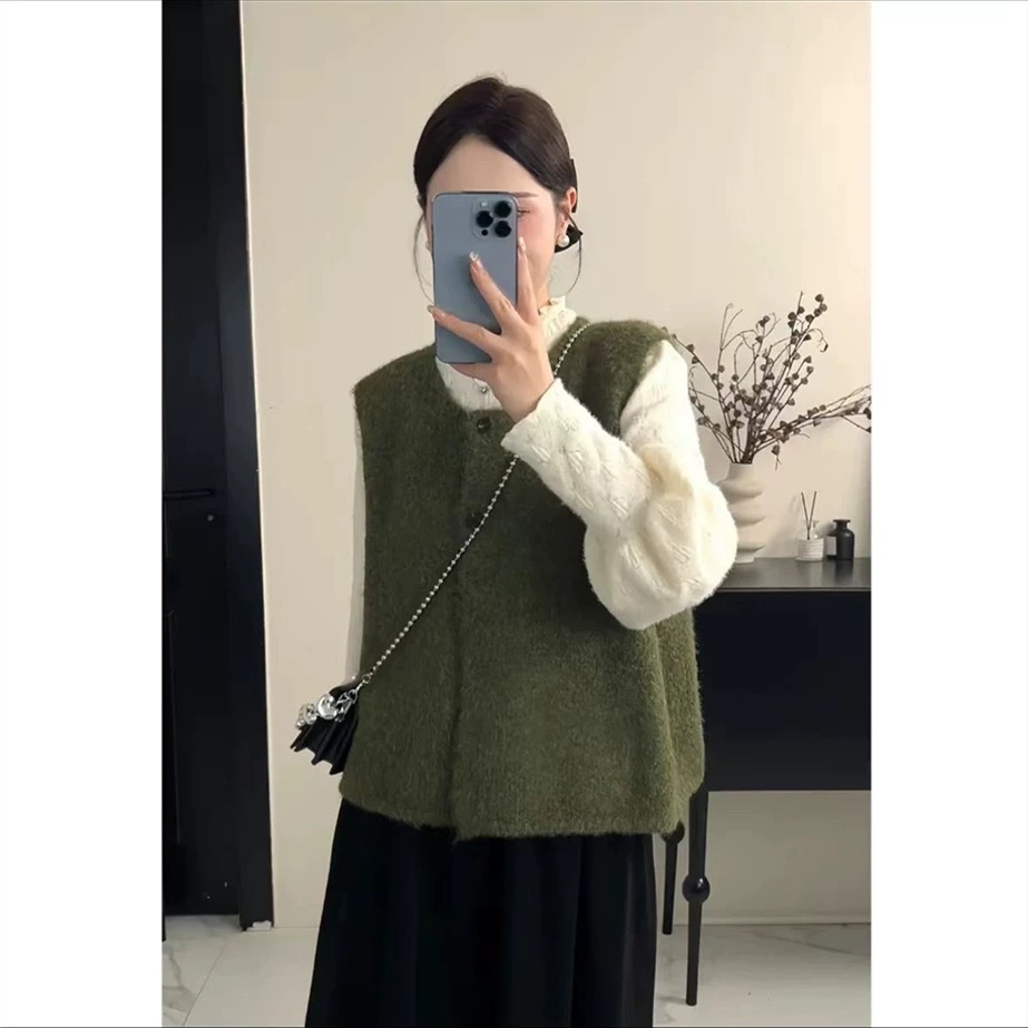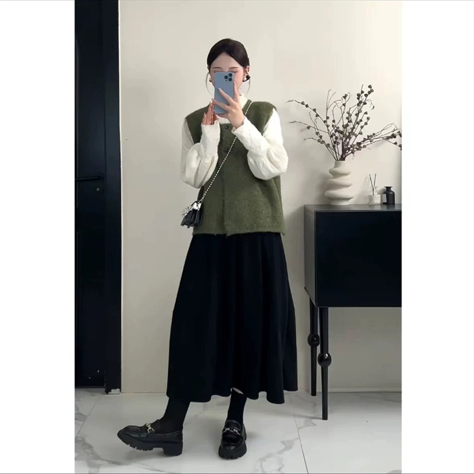 Комплект из трех предметов для осени: мягкий и универсальный свитер-жилет в корейском стиле больших размеров + кружевная базовая блузка + юбка.