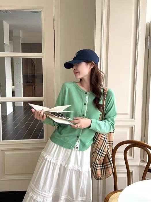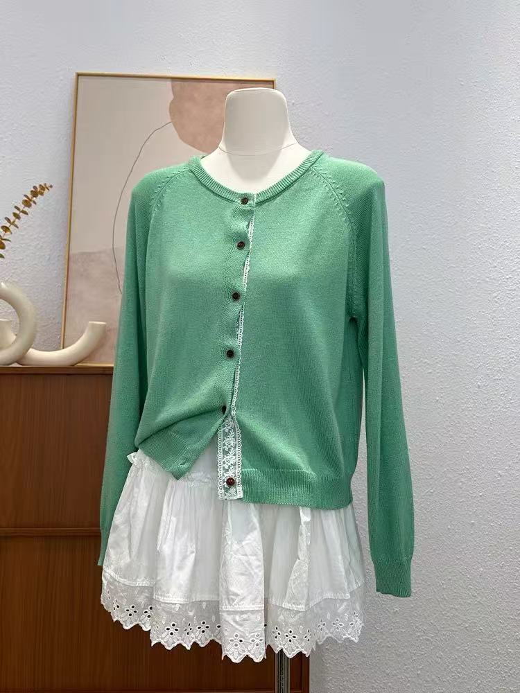 Нежное кружевное сшитое зеленое с круглым вырезом трикотажное шерстяное кардиган женская весна-лето новый премиум тонкий топ