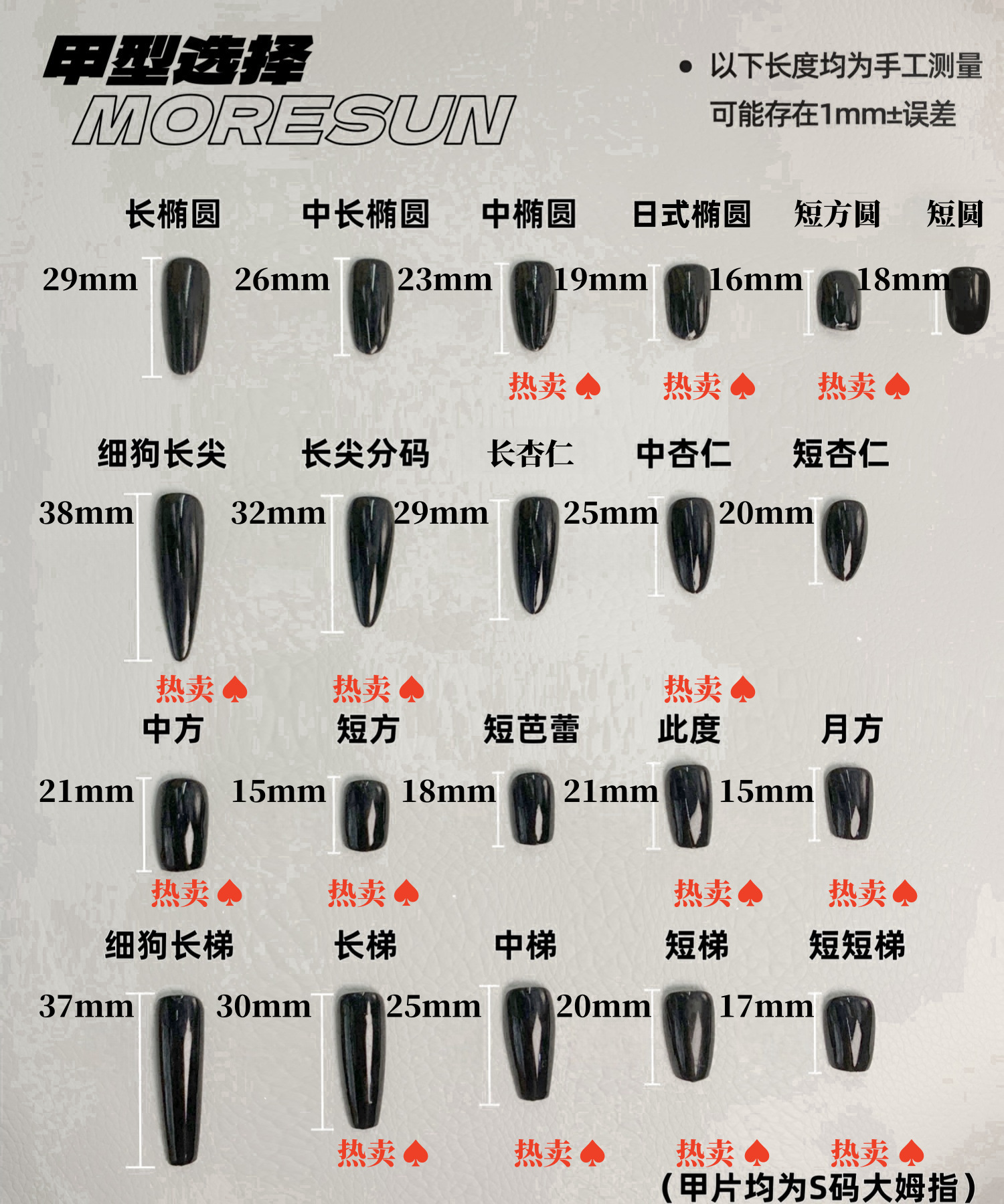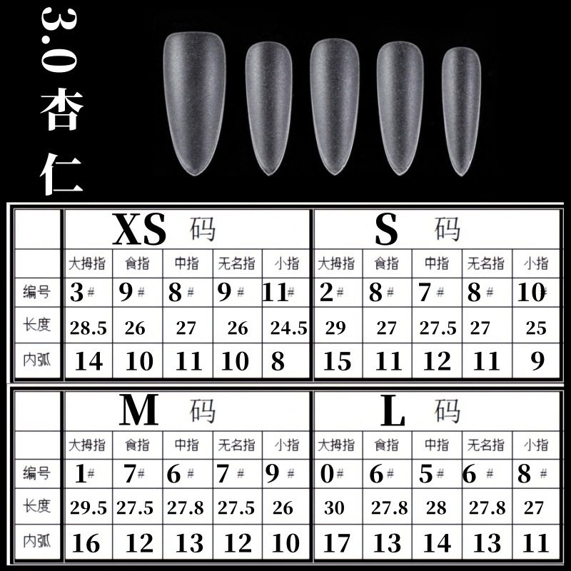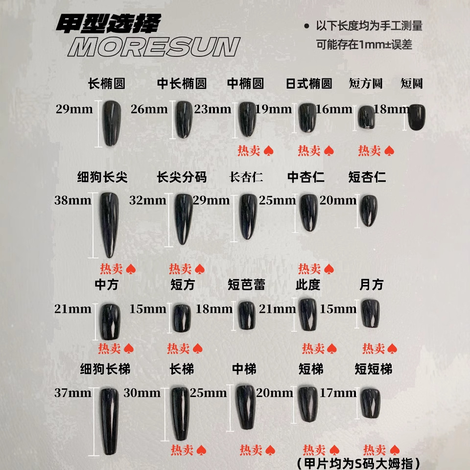Эта степень (новая китайская сторона); 2,5 средний прямоугольник; 3.0 прямоугольник; 4,5 удлиненная тонкая лестница для собак; Тонкая собачья лестница; длинная лестница; средняя лестница; короткая лестница; короткая лестница; 4,5 удлиненный тонкий кончик для собаки; Тонкий кончик собаки; длинный наконечник; Дудуцзя (короткое квадратное круглое); короткий круг; Китайская сторона; короткий квадрат; новый короткий квадрат; средний миндаль; короткий миндаль; длинный миндаль; короткий овал; тонкий короткий овал; средний овал; Тонкий и средний овал; длинный овал; средне-длинный овал; короткий балет; Пальцы ног