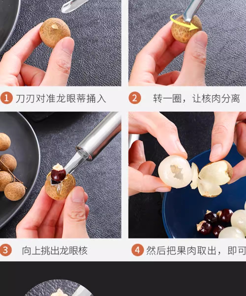 1 пластиковая ручка (для выкорчевки лонганов и ниток для креветок); 1 голая ручка (сердечник для лонгана и нитевдеватель для креветок); 1 двойная ручка с черной нитью (нитевдеватель для креветок с сердцевиной лонган); 2 пластиковые ручки (для выкорчевки лонганов и ниток для креветок); 2 голые ручки (для выкорчевки лонганов и ниток для креветок); 2 двойные ручки с черной нитью (для выкорчевки лонганов и ниток для креветок)