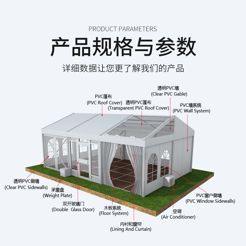 我们的篷房,根据客户的不同需求可选的配置有玻璃门,玻璃墙体、彩钢板、ABS白色硬体墙、卷帘门、围布(拉链,绑绳)……篷布颜色也是多样可选的:透明、白色、黑色、绿色……等等。