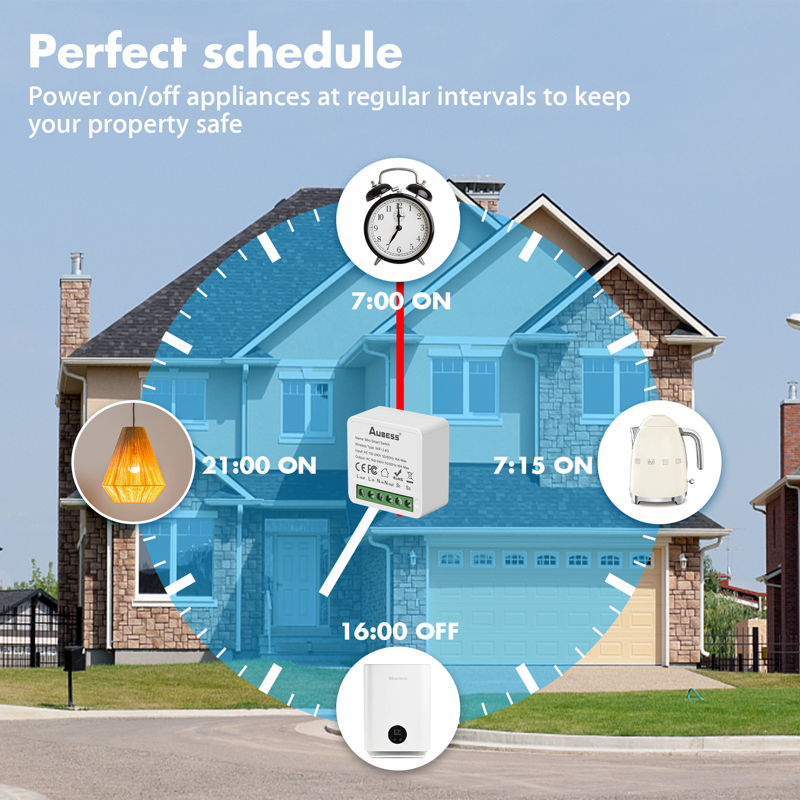 您可以通过手机控制设备的开关、定时、倒计时等功能。这可以订购:2小时后关闭客厅的灯。 18:15 关掉烤箱。 21:00 开启锅炉。您也可以在您不在家时为设备计时。 (APP:智慧生活/涂鸦智能)