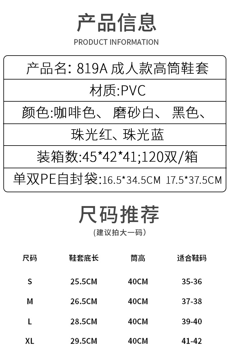 819A высокая трубка белая; 819A высокая трубка черная; 819A высокая трубка синяя; 819A высокая трубка розовая; 819A высокий кофейный цвет; А5 средний тюбик белый; А5 средняя трубка синяя; А5 средняя трубка розовая; A5 средняя трубка коричневая; Средняя трубка A5 черного цвета (по индивидуальному заказу при минимальном заказе 500 пар каждого размера); Полиэтиленовые одноразовые прозрачные бахилы 10 шт.