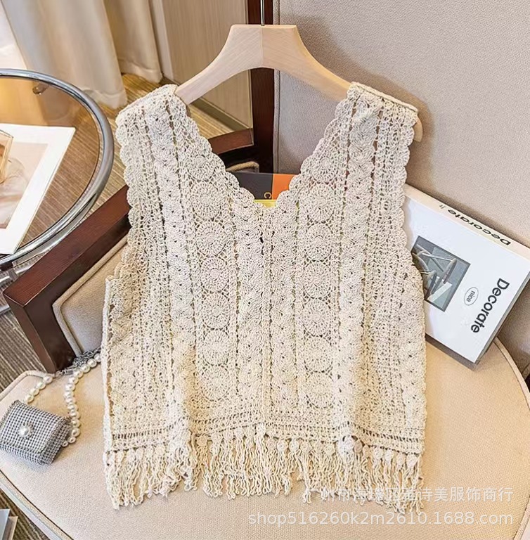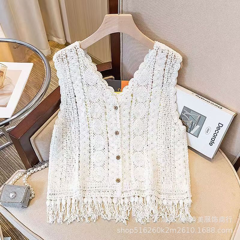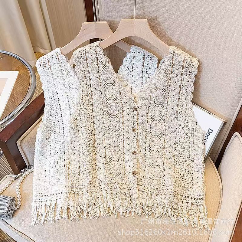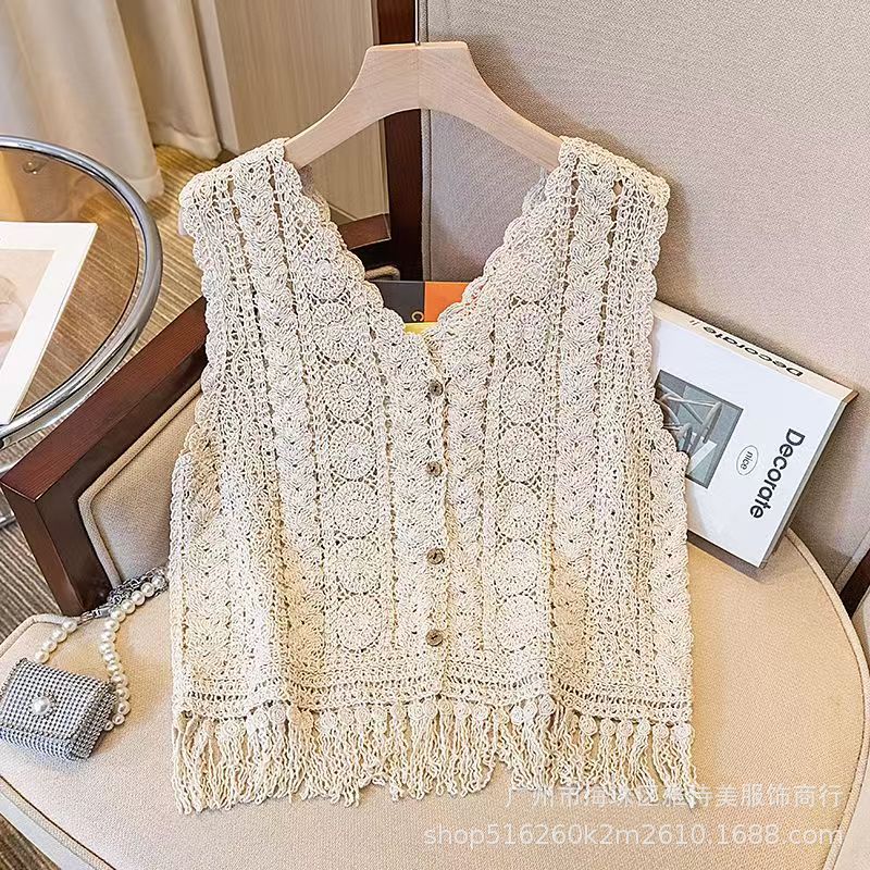 Французский дизайн сплошной цвет крючком ажурный трикотажный жилет женский приморский отдых ветер кисточка свободный топ
