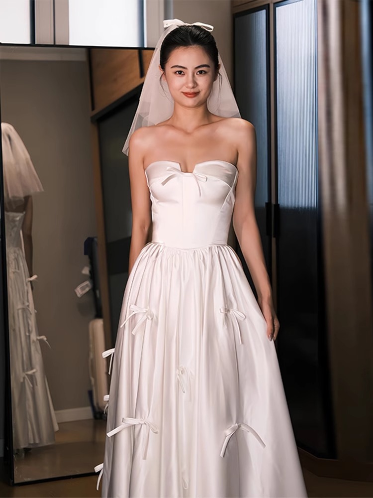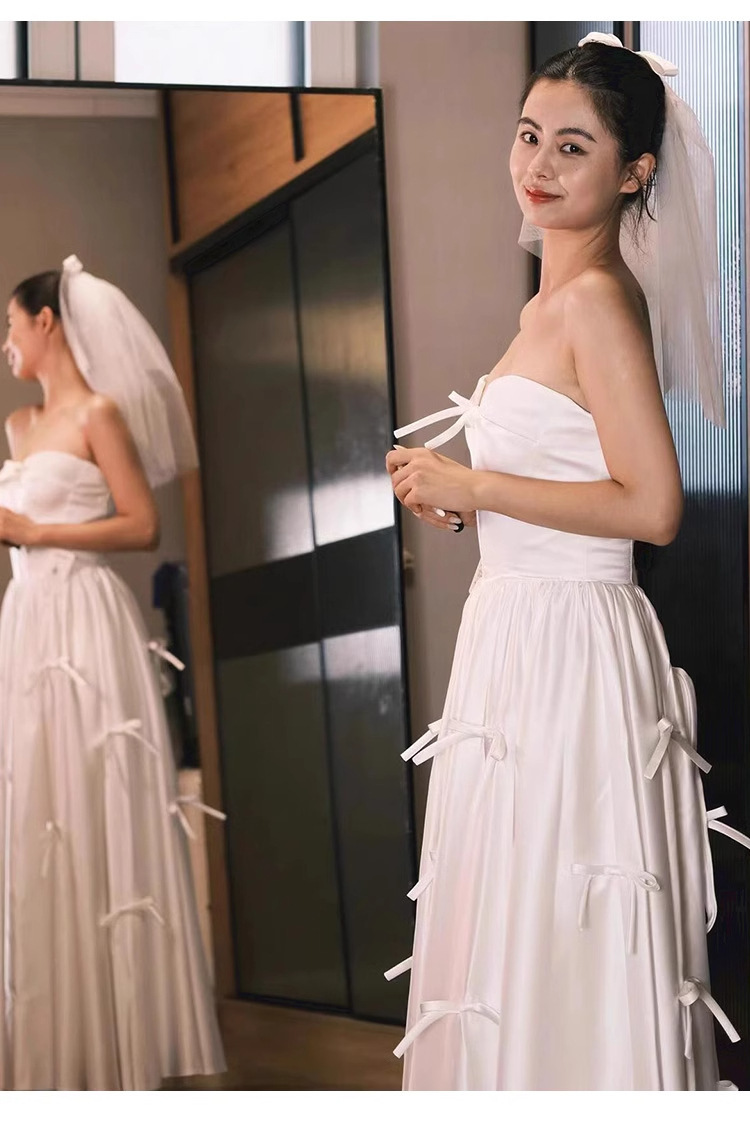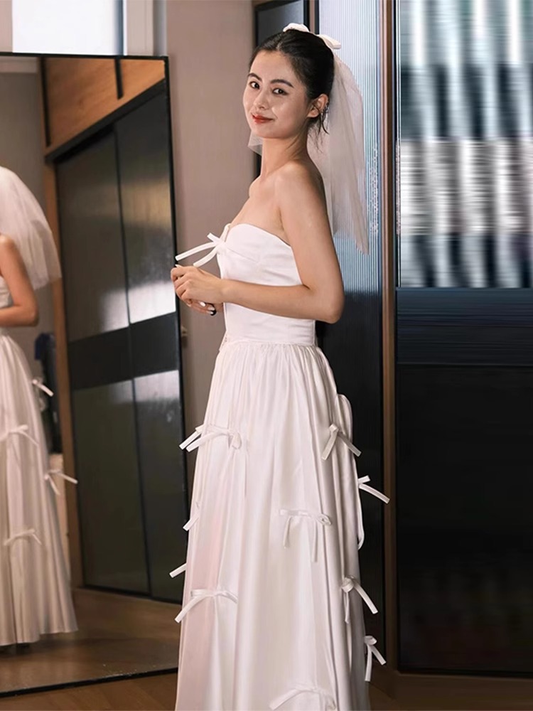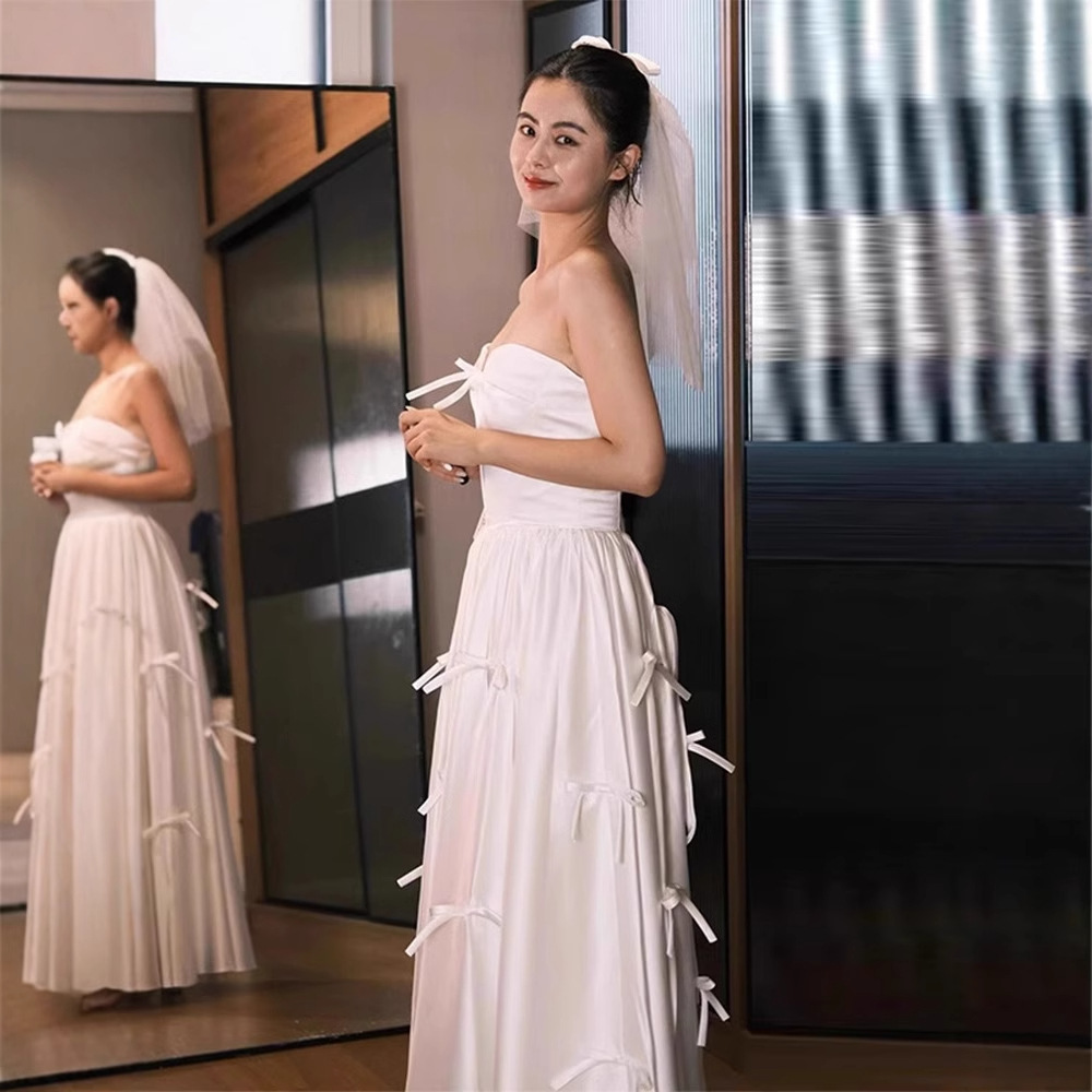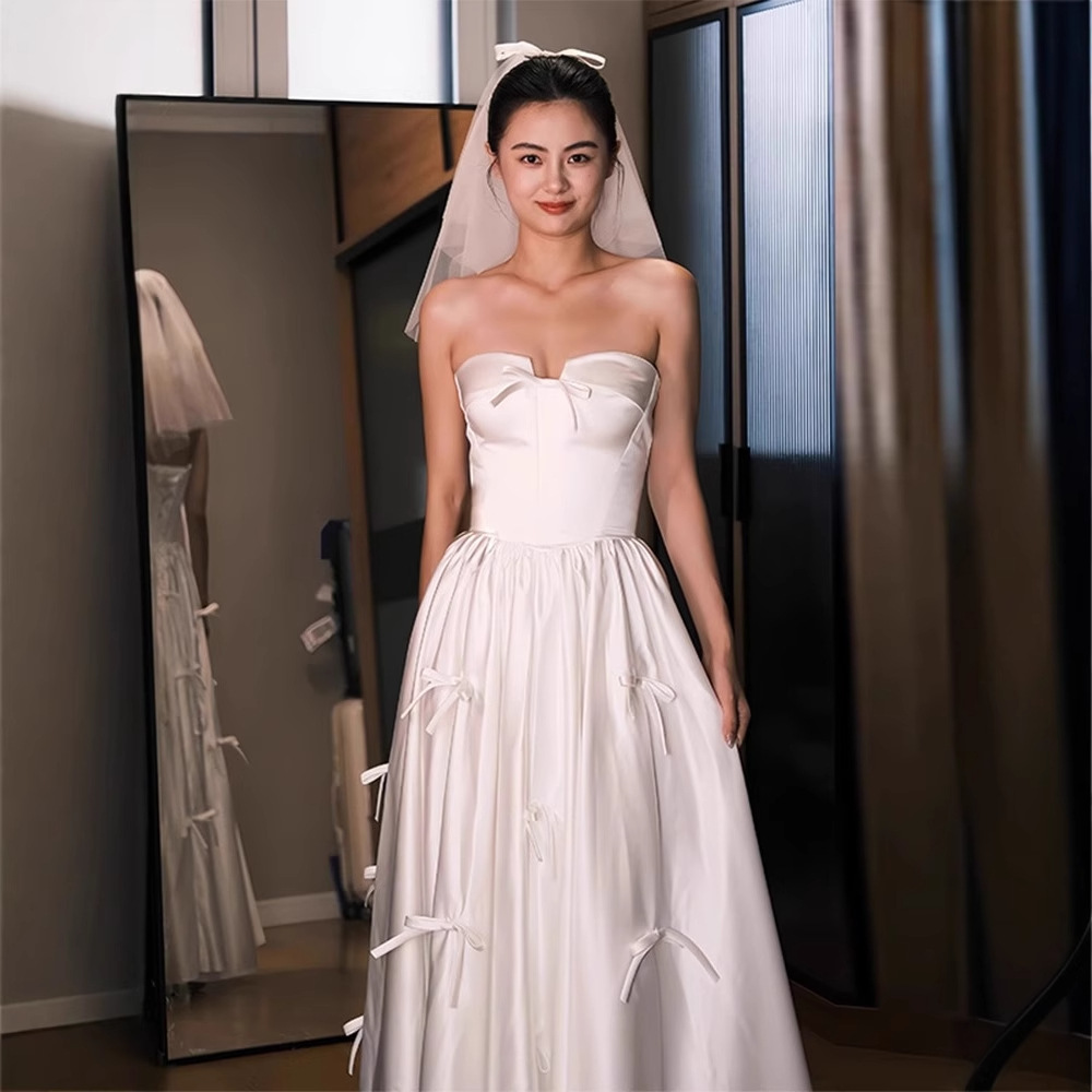 Французское белое светлое свадебное платье с длинным темпераментом элегантный атласный свадебное платье для свадебной поездки
