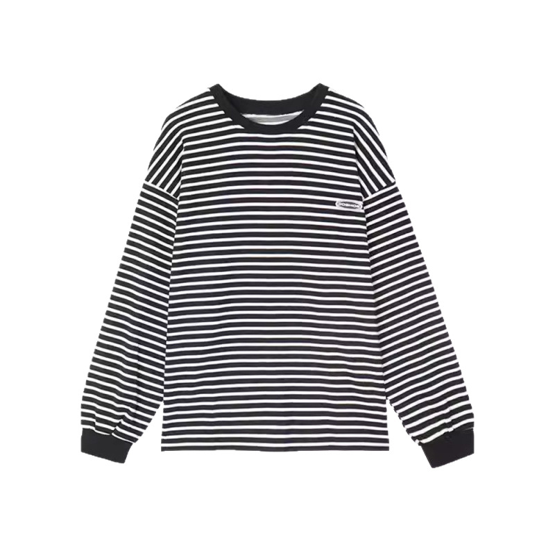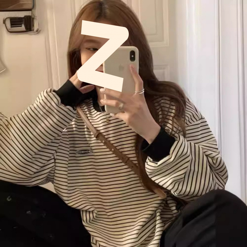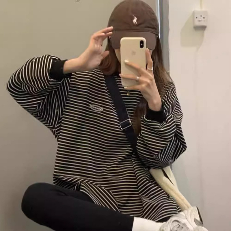 2024 осень и зима новая корейская версия в полоску с длинными рукавами свитера женская свободная повседневная футболка с круглым вырезом блузка хоп ins прилив