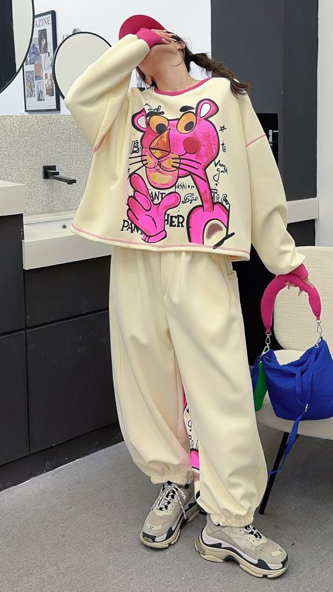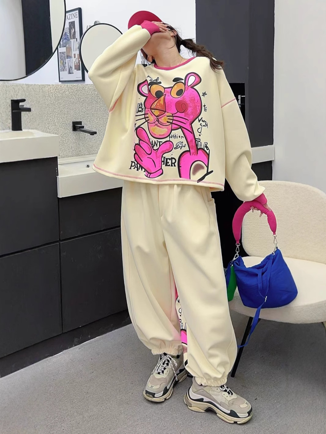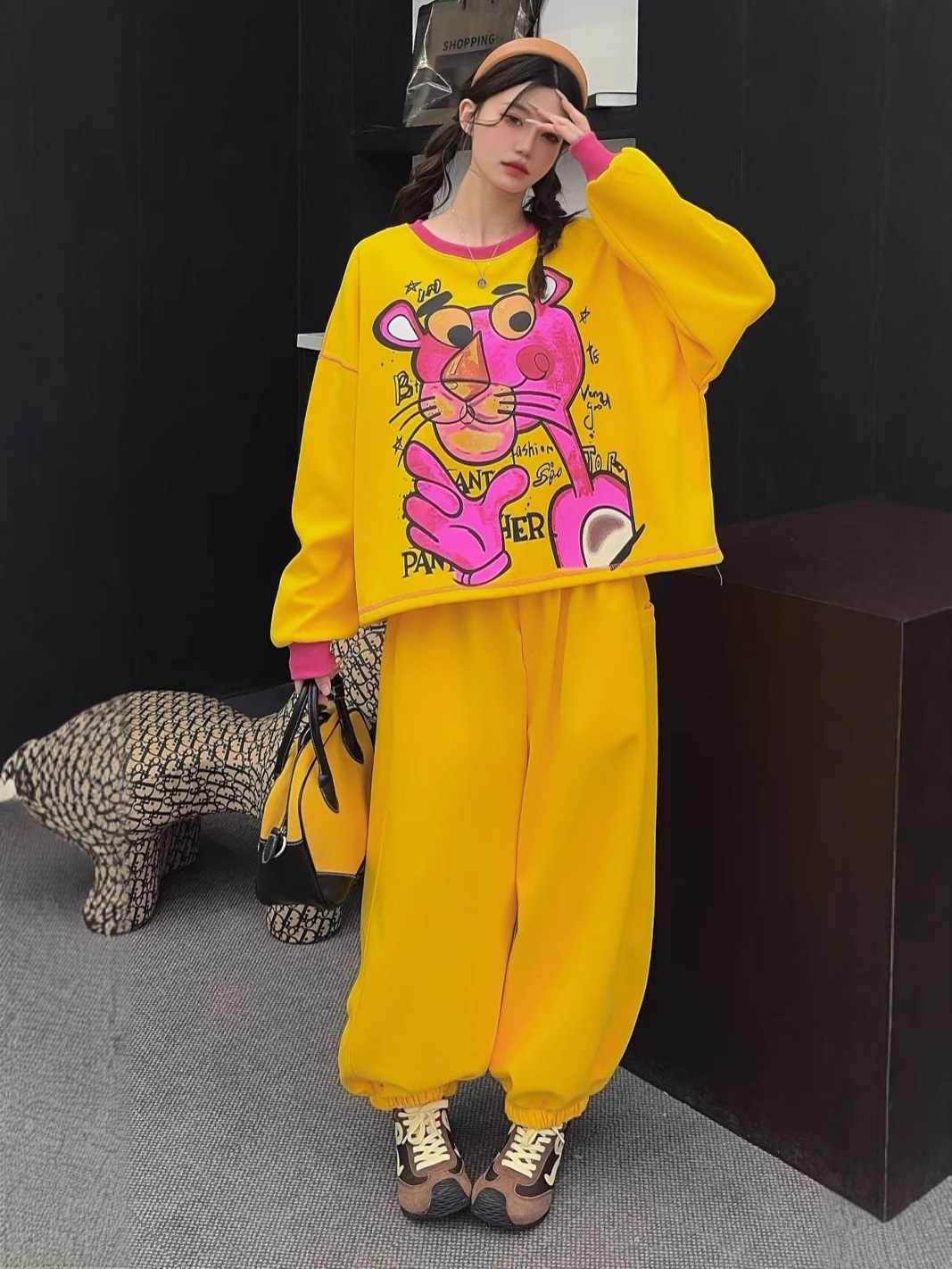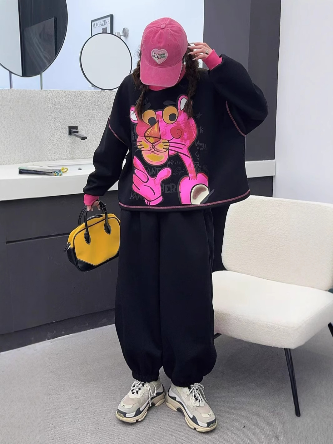Реальная весенняя корейская версия набора больших размеров повседневная мода минус возраст милый мультяшный леопард узор свитерская брюки из двух частей
