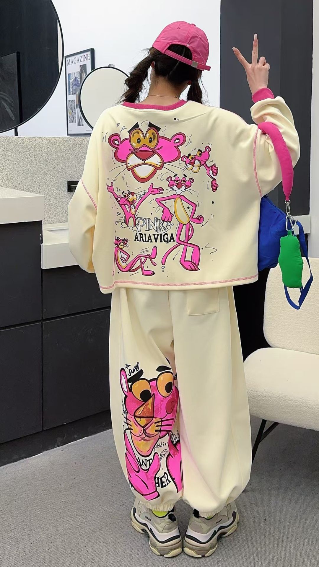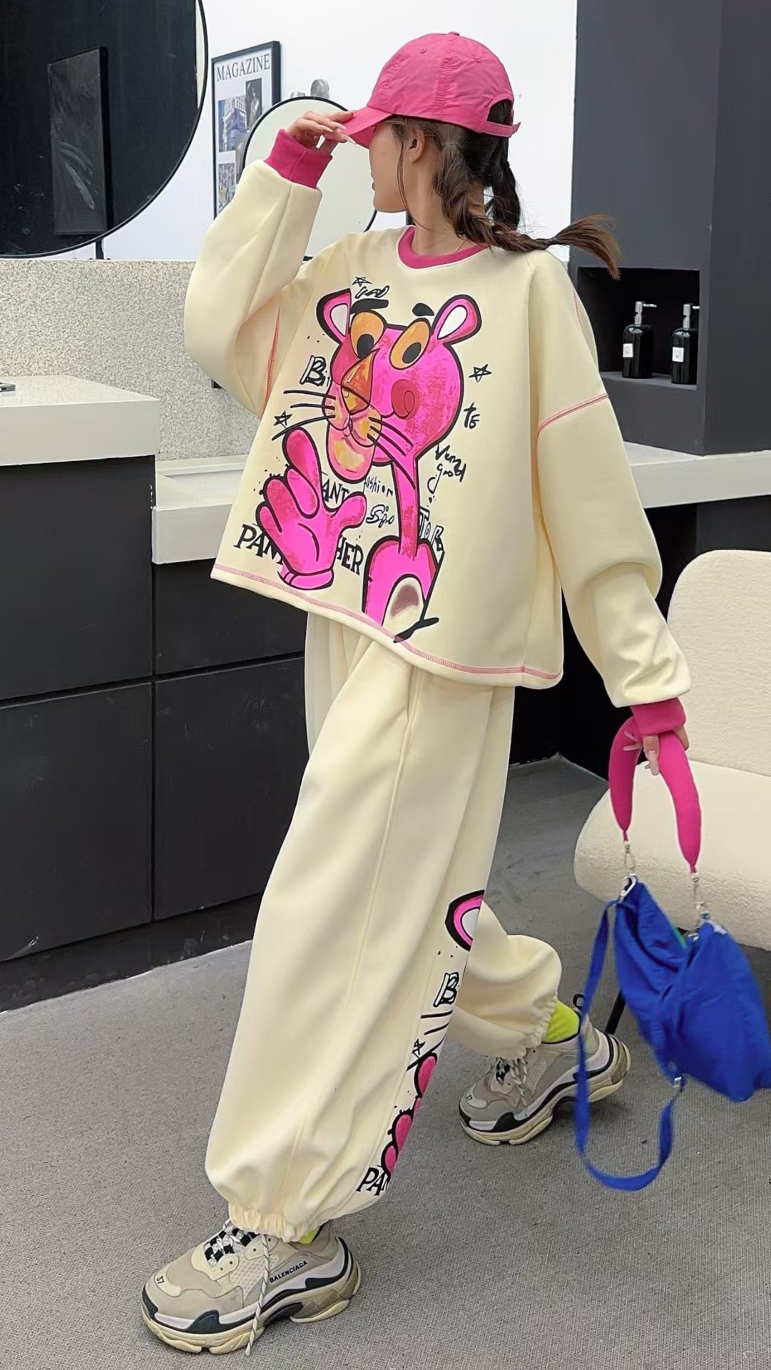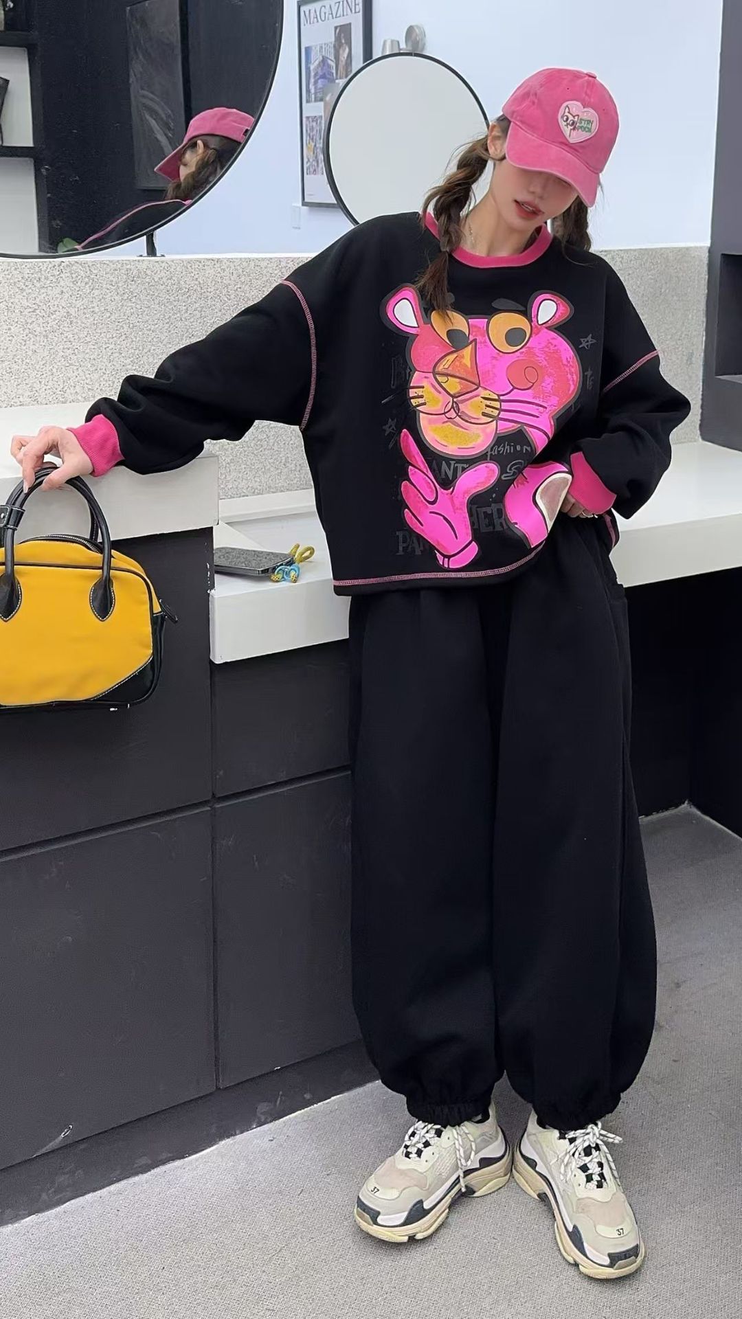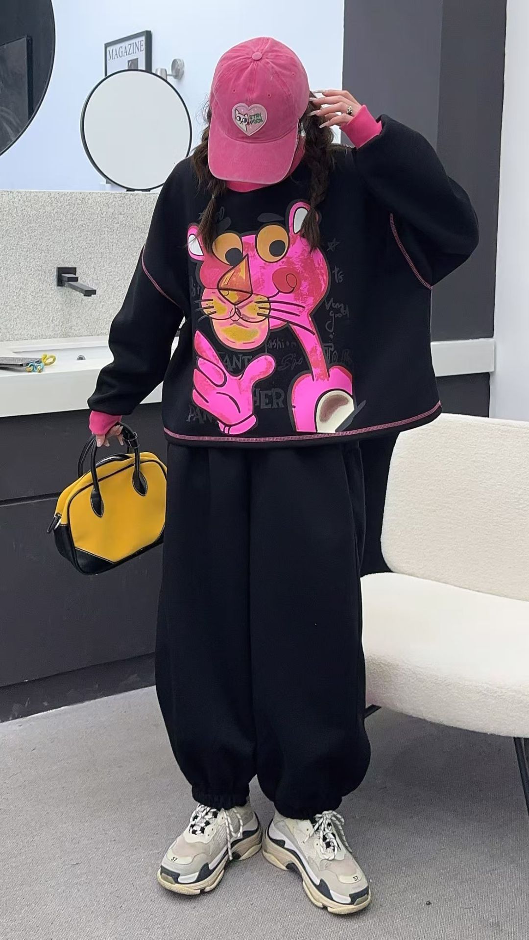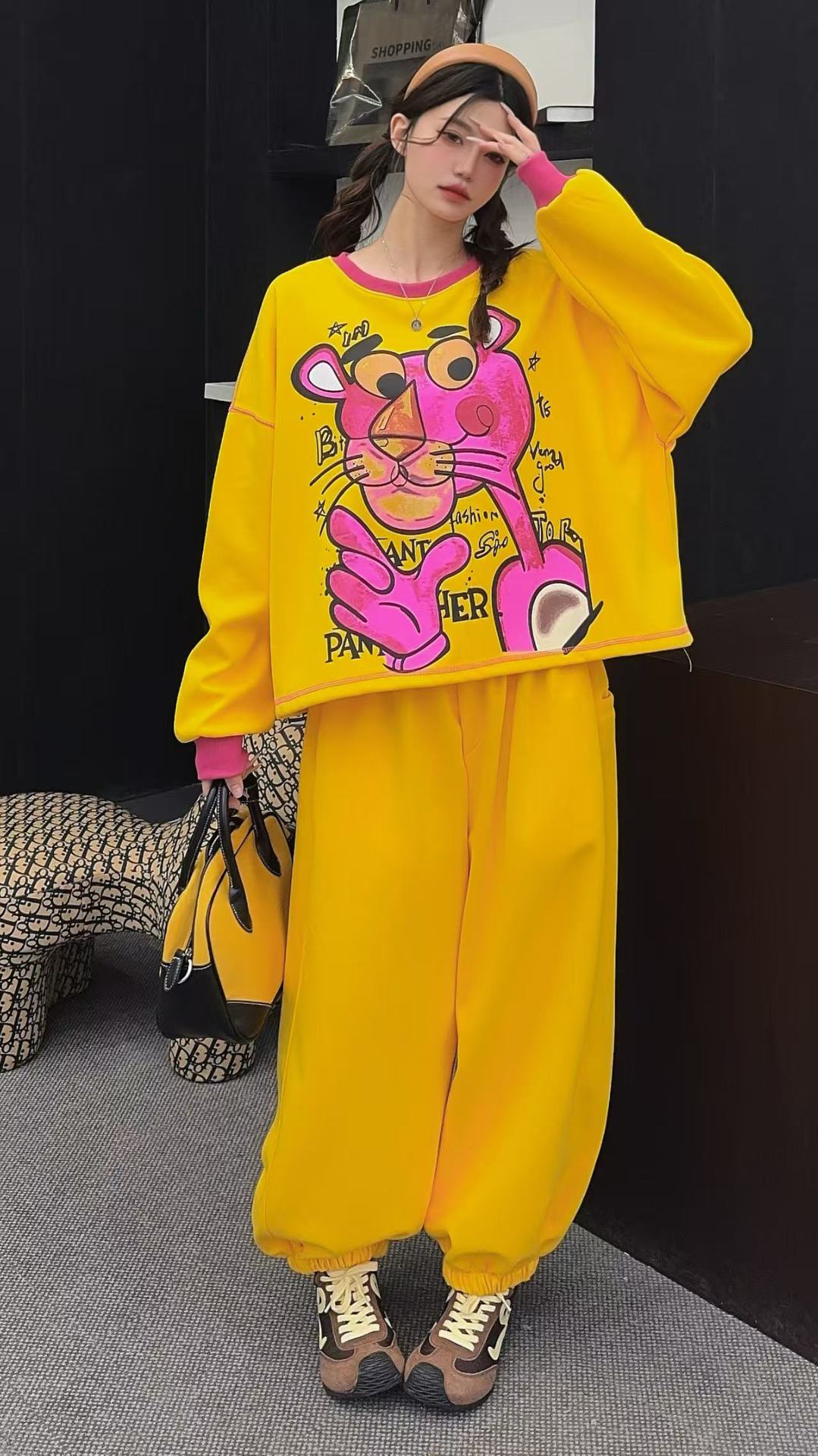 Реальная весенняя корейская версия набора больших размеров повседневная мода минус возраст милый мультяшный леопард узор свитерская брюки из двух частей
