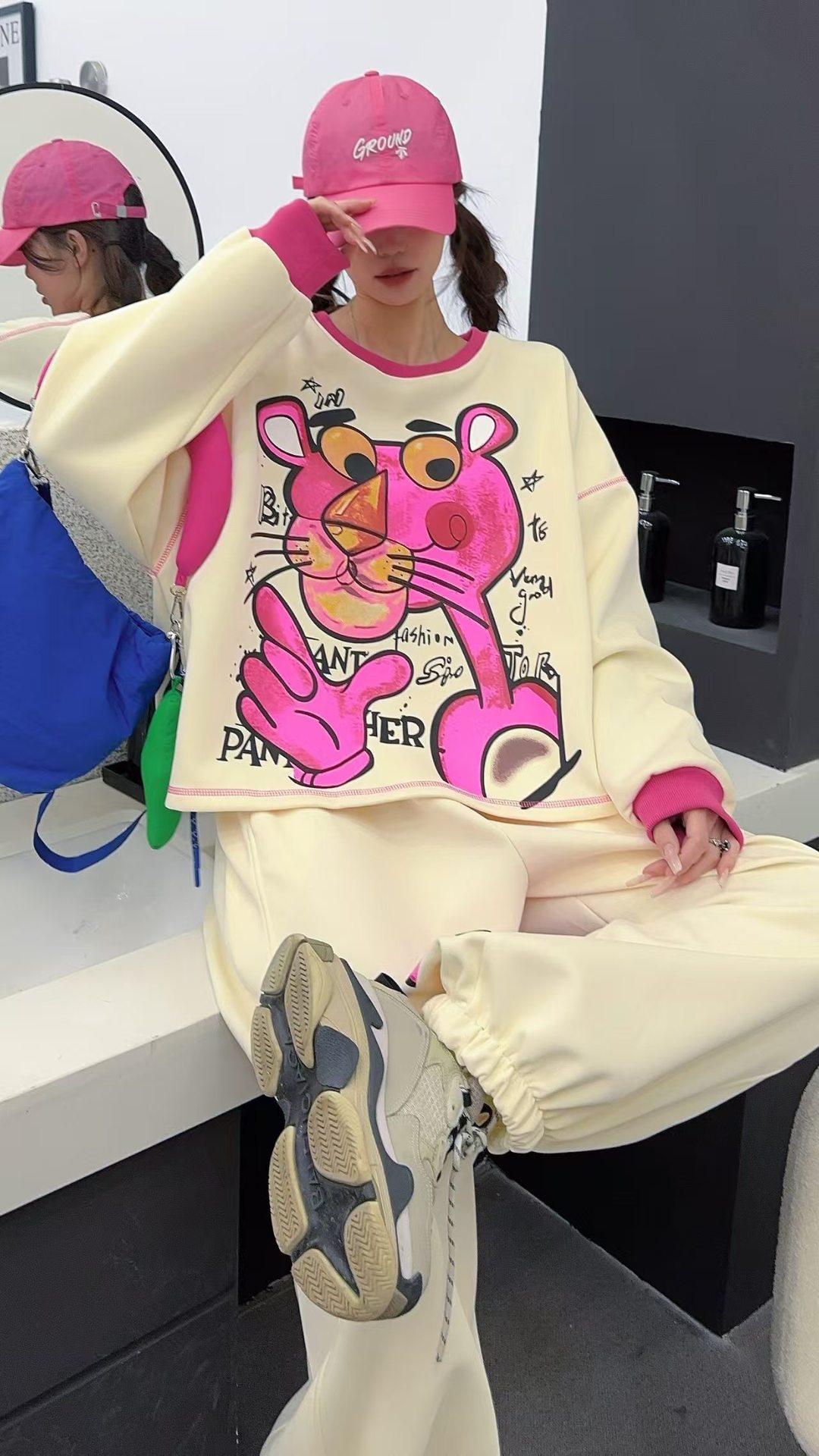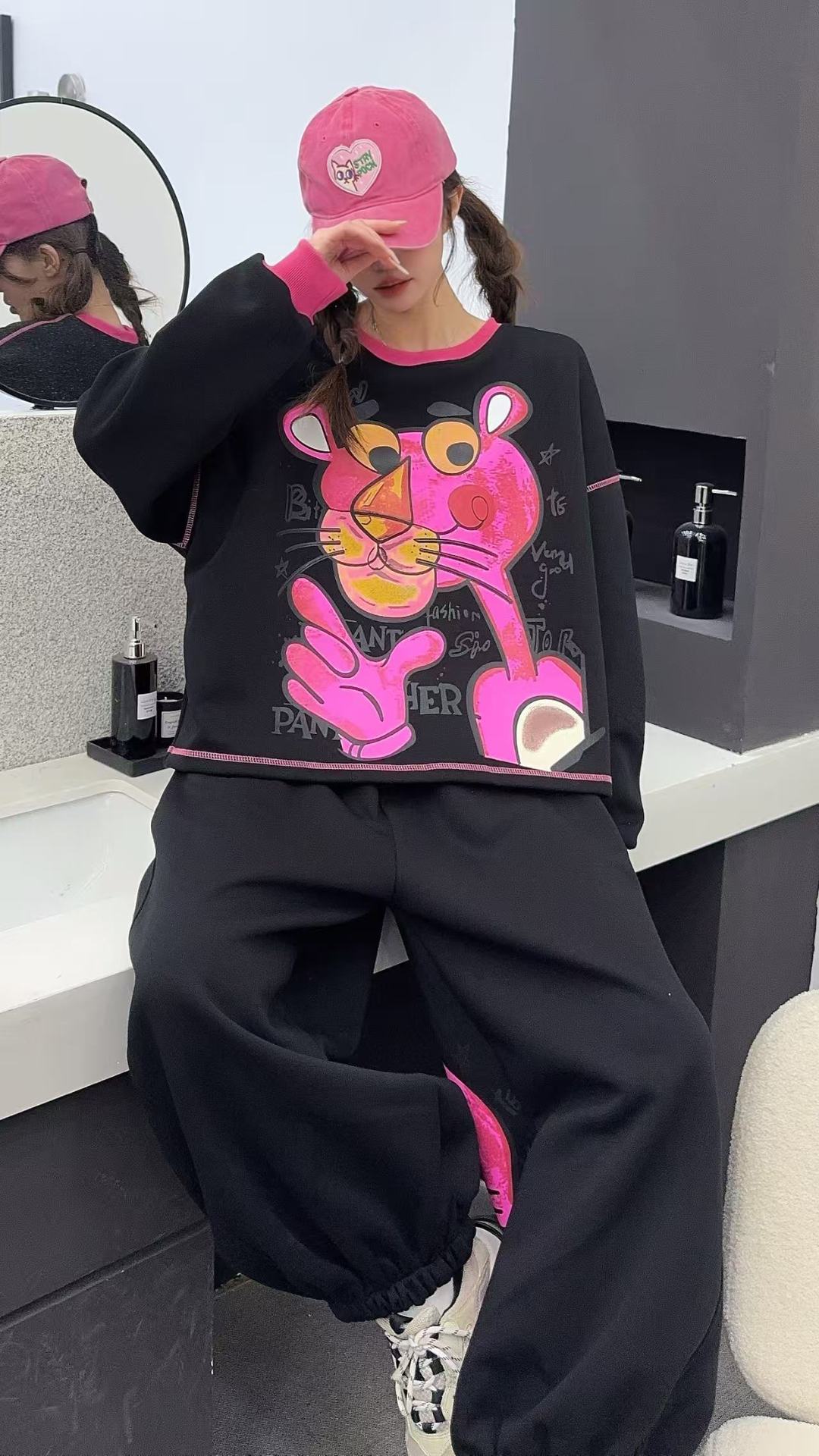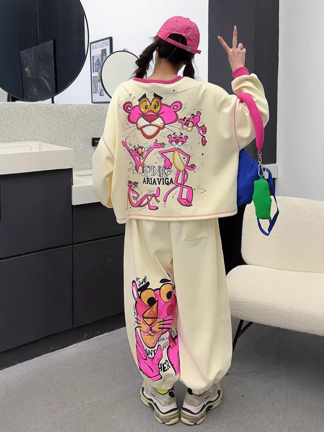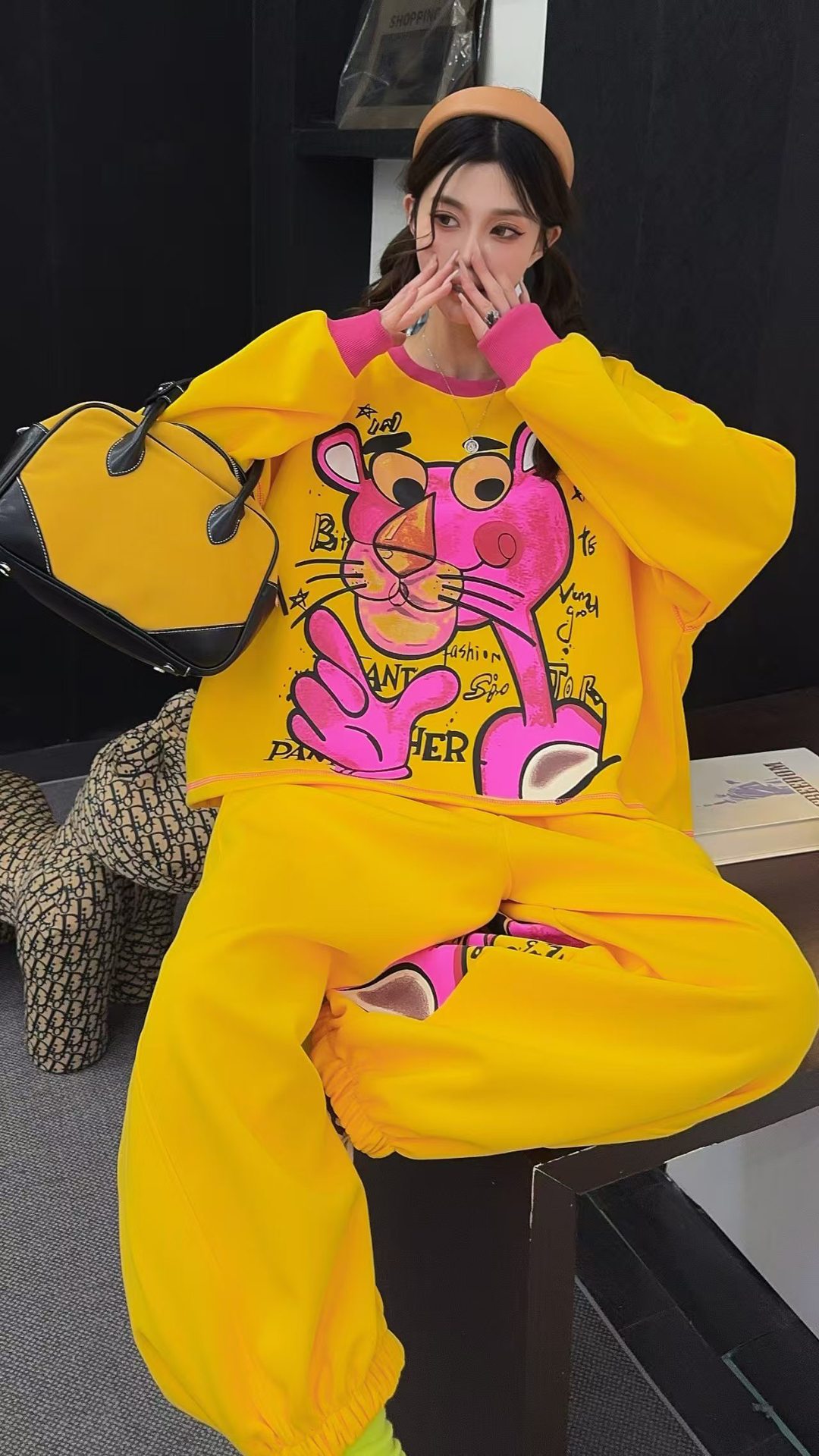 Реальная весенняя корейская версия набора больших размеров повседневная мода минус возраст милый мультяшный леопард узор свитерская брюки из двух частей