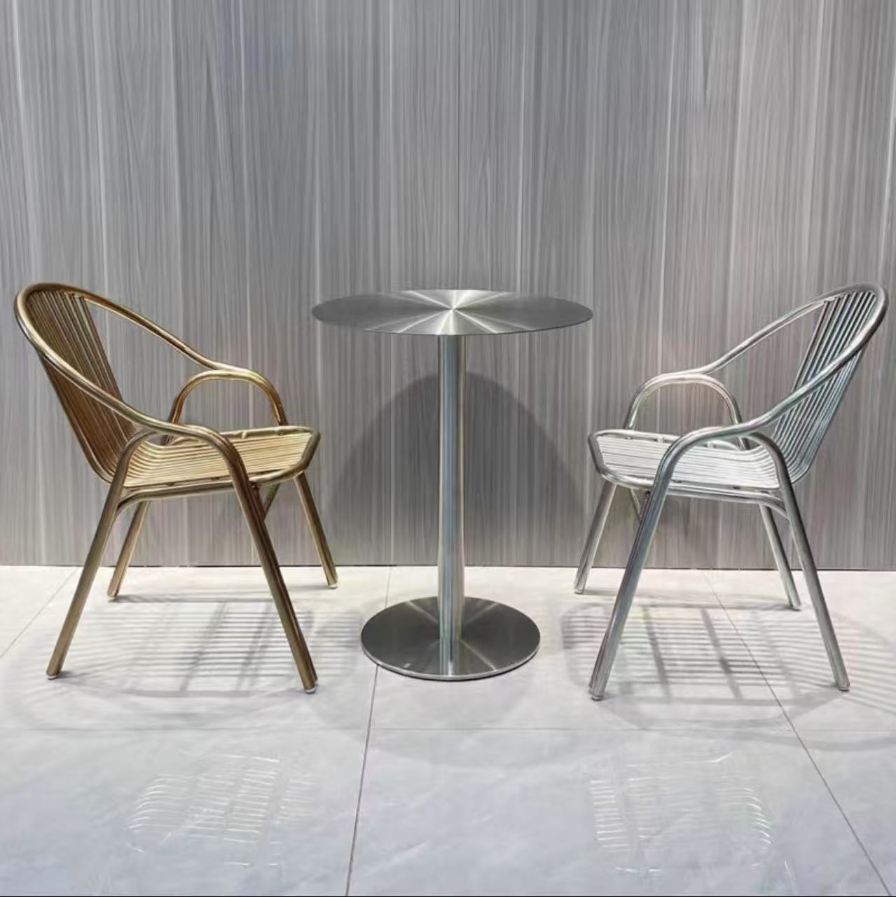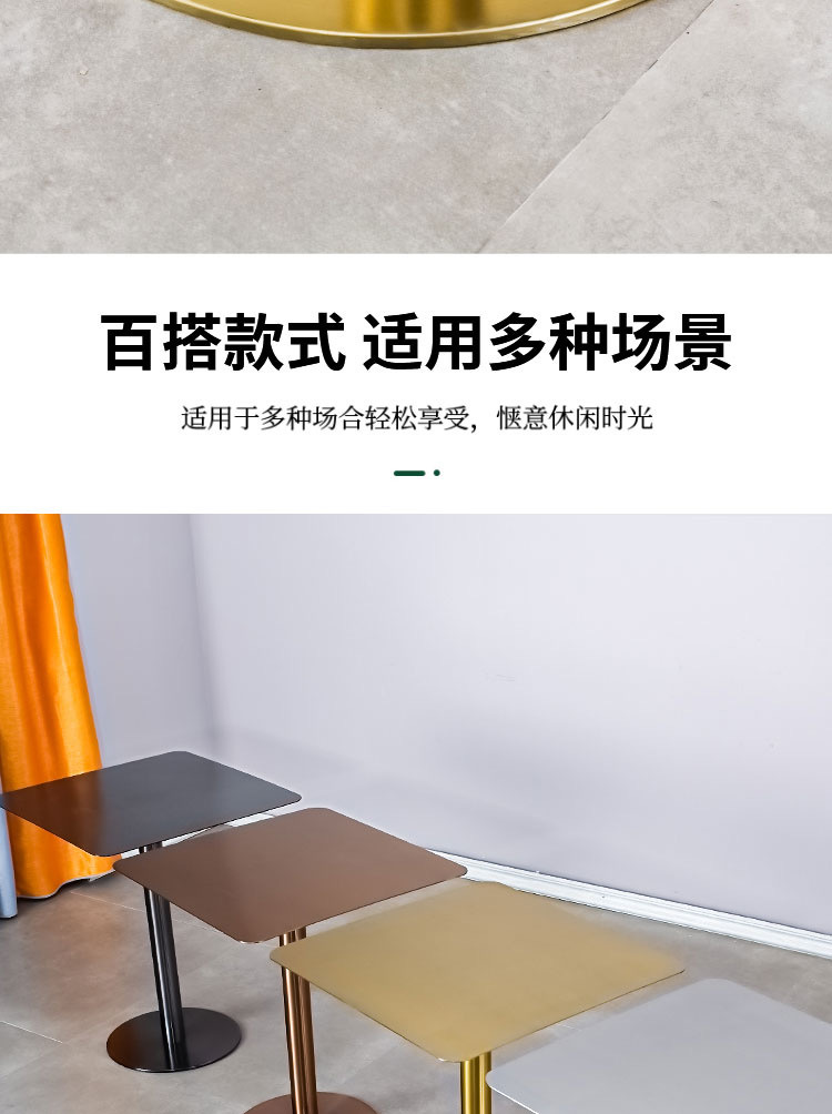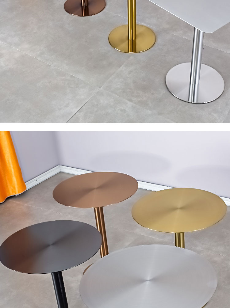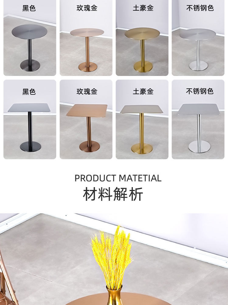 Круглый стол из нержавеющей стали оригинального цвета, цельный; Квадратный стол из нержавеющей стали оригинального цвета; Круглый золотой массивный стол; Квадратный золотой массивный стол; Круглый стол из массива розового золота; Квадратный стол из массива розового золота; Круглый стол из черного титана и золота; Квадратный стол из черного титана и золота