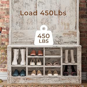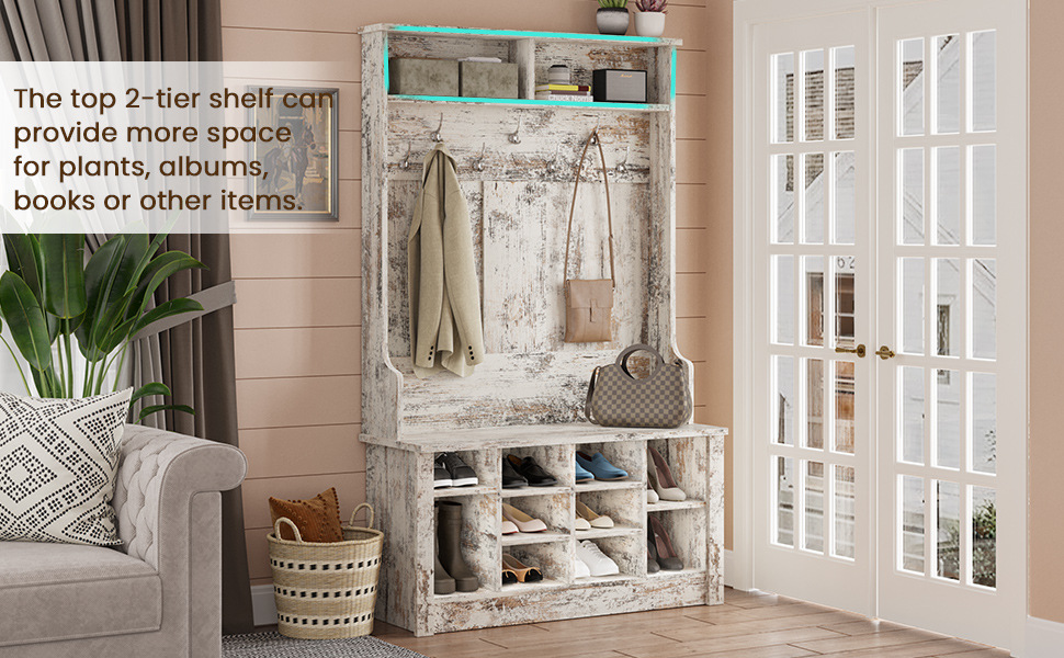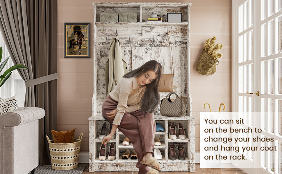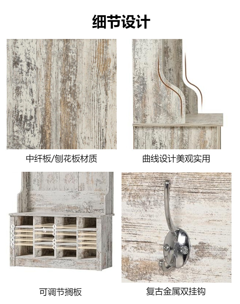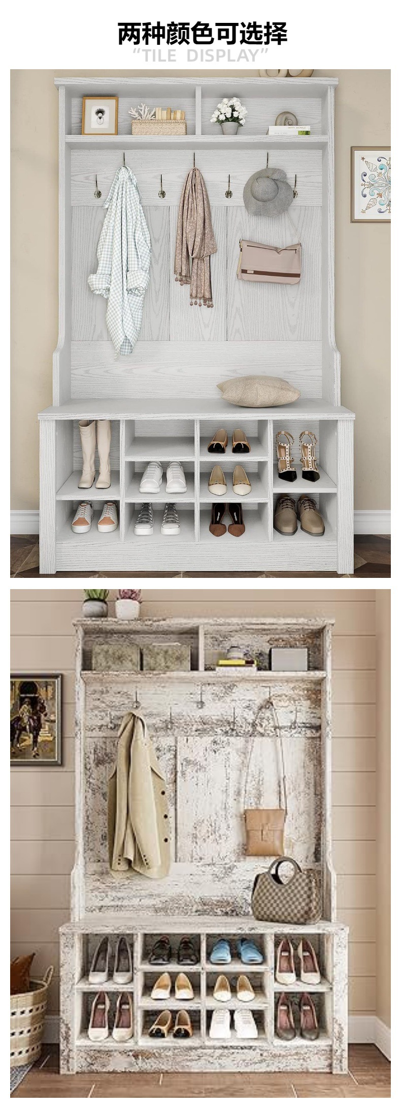 【你得到了什么】门厅柜或储物柜可供选择,顶部2层储物架,10个可调节的鞋柜,入口长椅和衣架。这个储物台有10个鞋柜,可以调节到不同的高度,放你的运动鞋或靴子。这个入口长椅具有衣架、储鞋和门厅柜的功能。