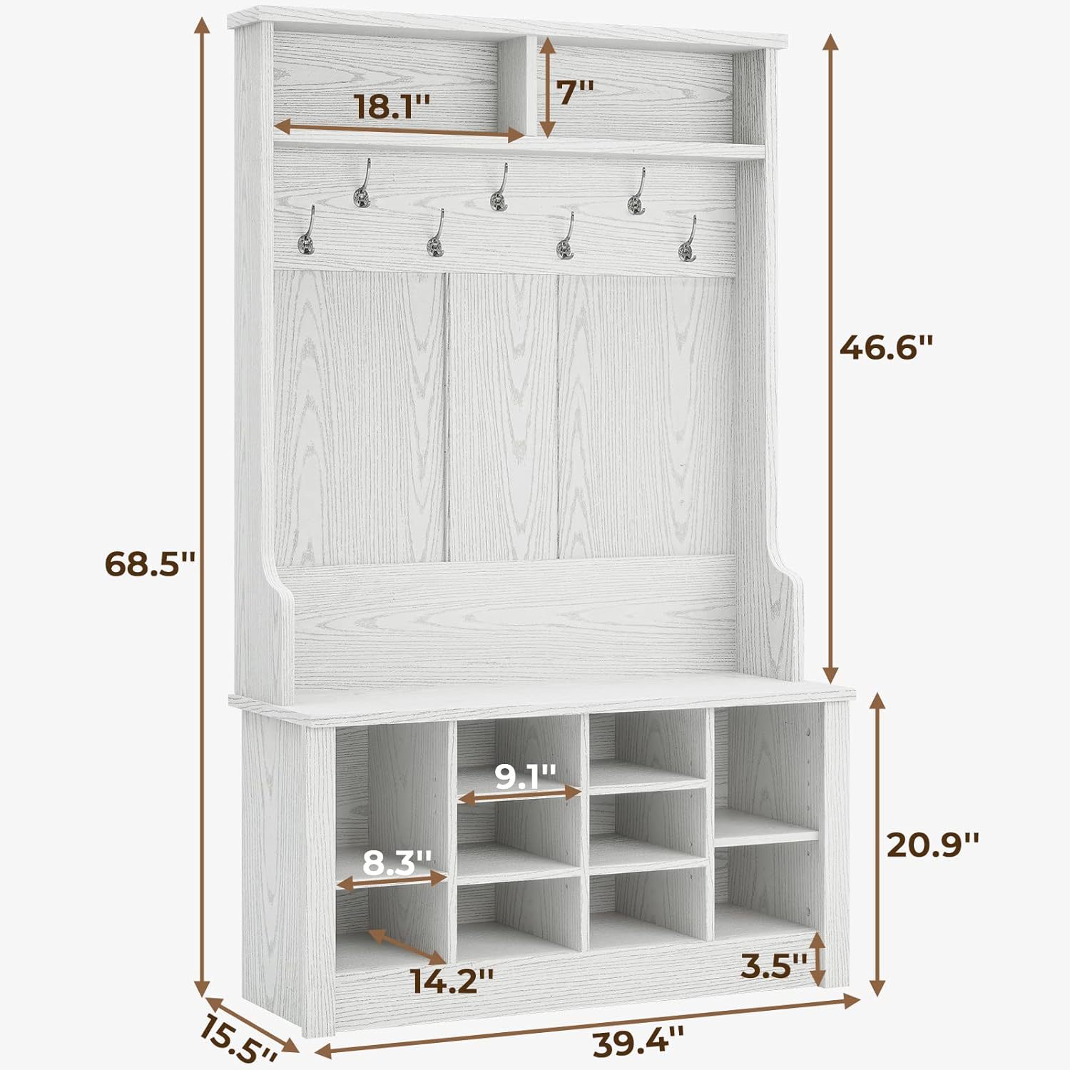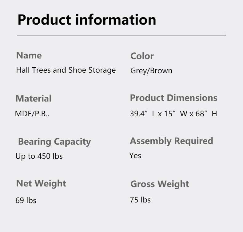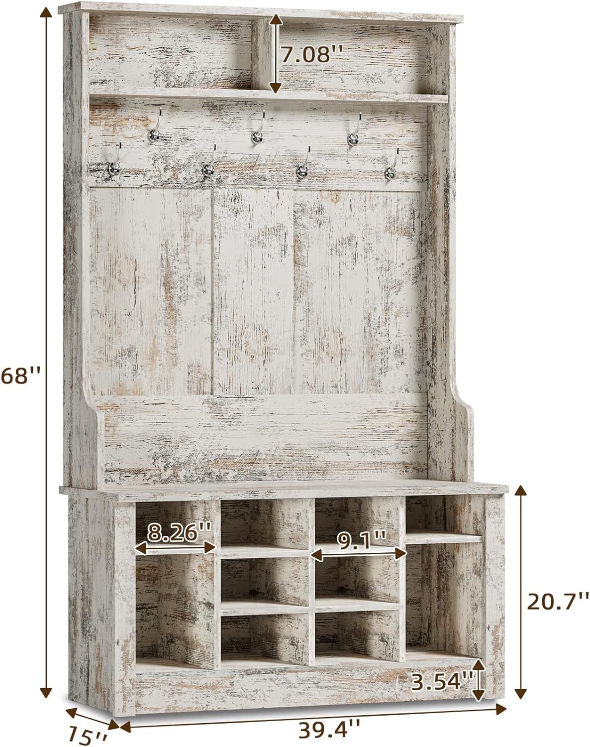 【广泛使用】非常适合您的入口、大厅、门厅、走廊、泥室、客厅或办公室挂夹克、背包、雨伞、钥匙和其他物品。这棵带长凳和鞋柜的门厅柜也与家里或办公室的其他家具搭配得很好。这个带衣架的储物台可以很容易地让你的家保持整洁。