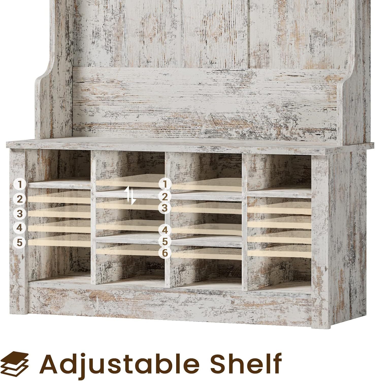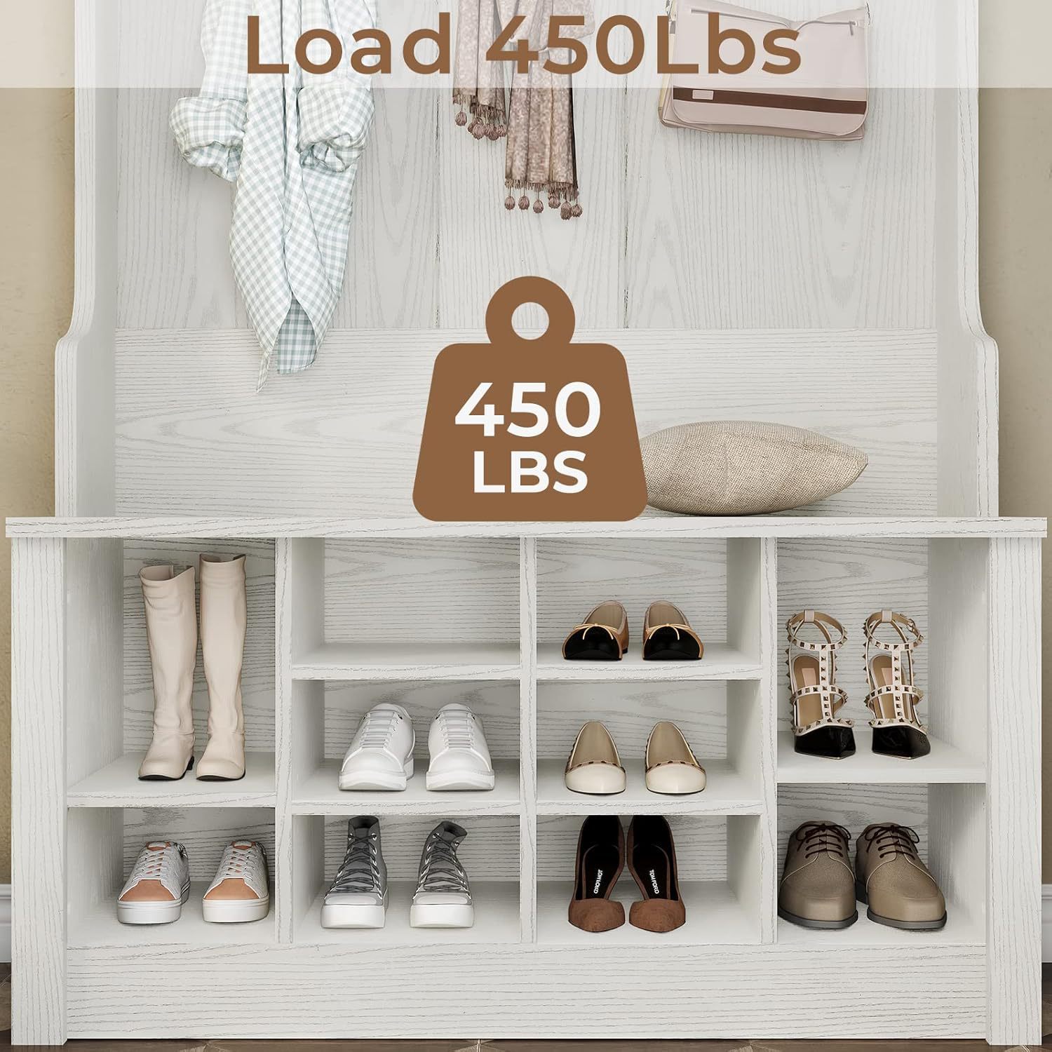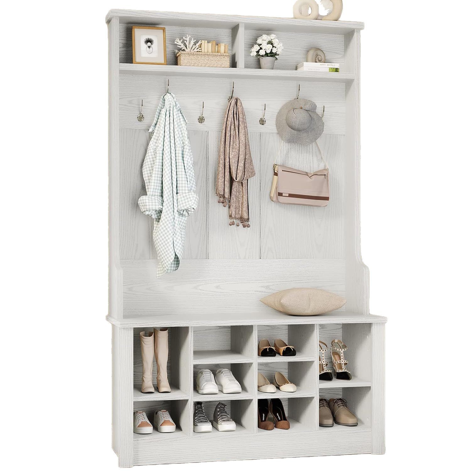 【广泛使用】非常适合您的入口、大厅、门厅、走廊、泥室、客厅或办公室挂夹克、背包、雨伞、钥匙和其他物品。这棵带长凳和鞋柜的门厅柜也与家里或办公室的其他家具搭配得很好。这个带衣架的储物台可以很容易地让你的家保持整洁。