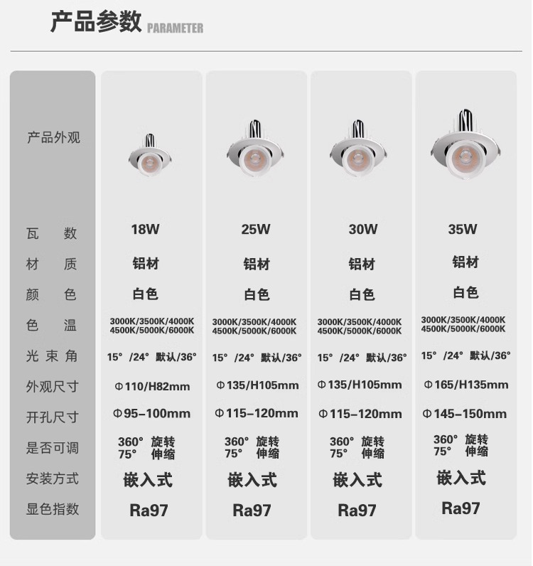 20 Вт/отверстие 95 мм Ra97 CRI; 25 Вт/отверстие 120 мм Ra97 CRI; 30 Вт/отверстие 120 мм Ra97 CRI; 35 Вт/отверстие 150 мм Ra97 CRI; 12 Вт/отверстие 75 мм Ra97 CRI