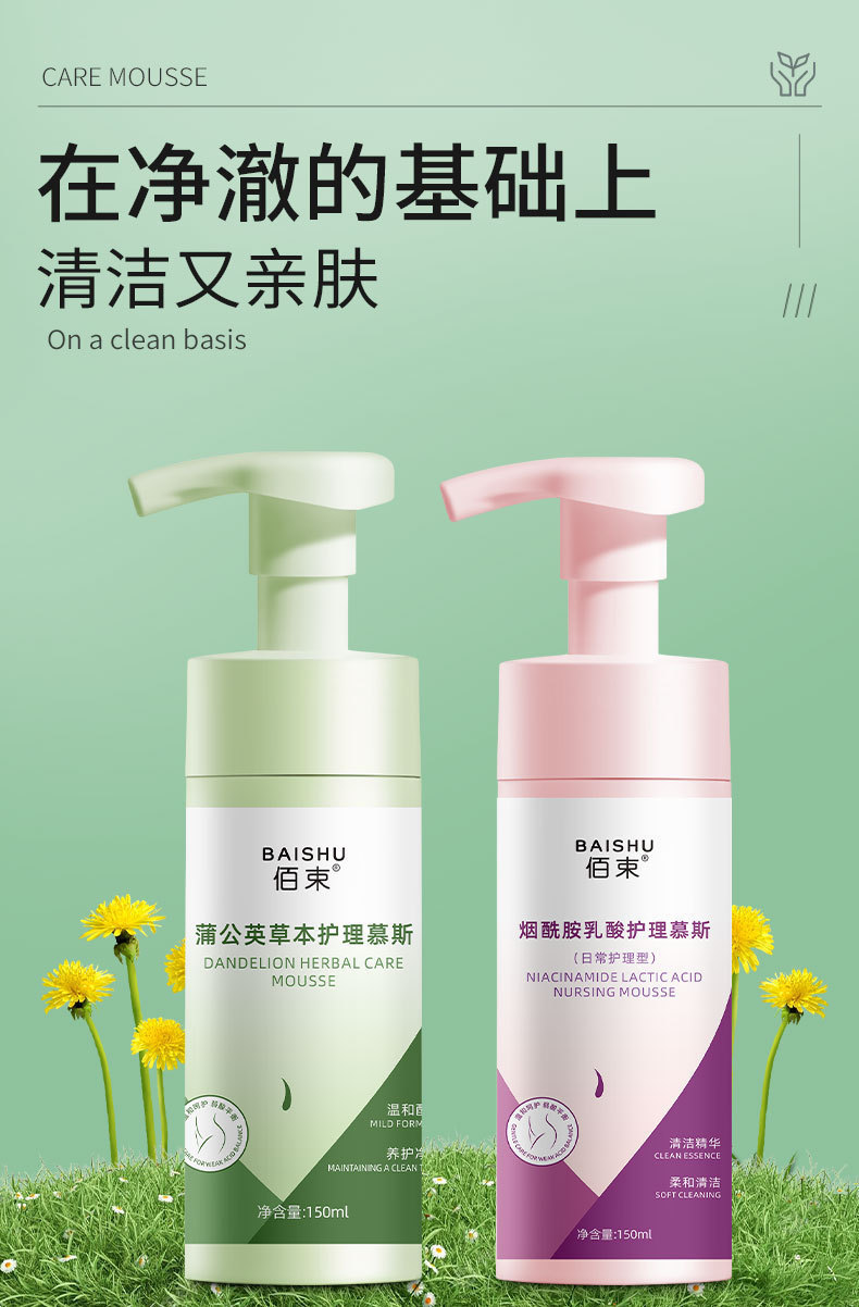 Женский очищающий уход-мусс Baishu [зеленая бутылка]; Женский очищающий уход-мусс Baishu [флакон с порошком]