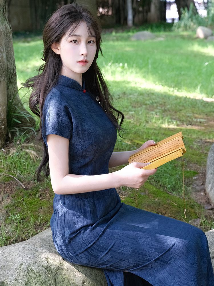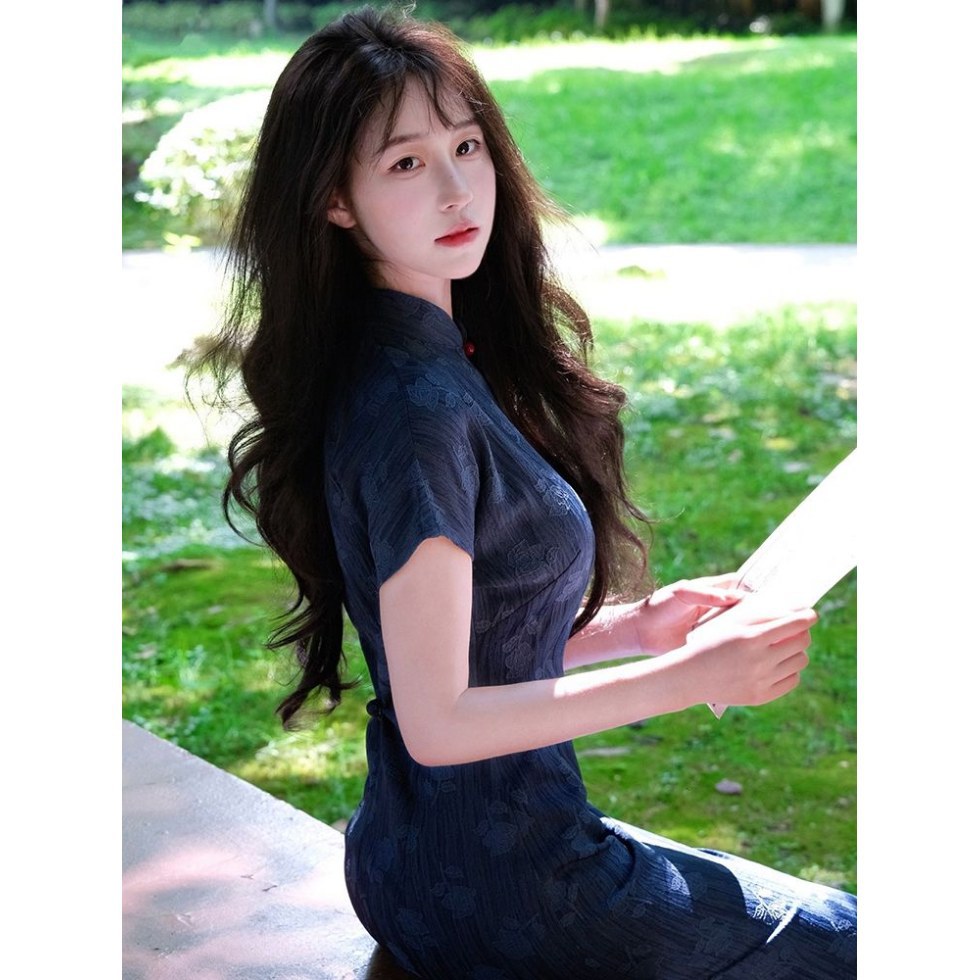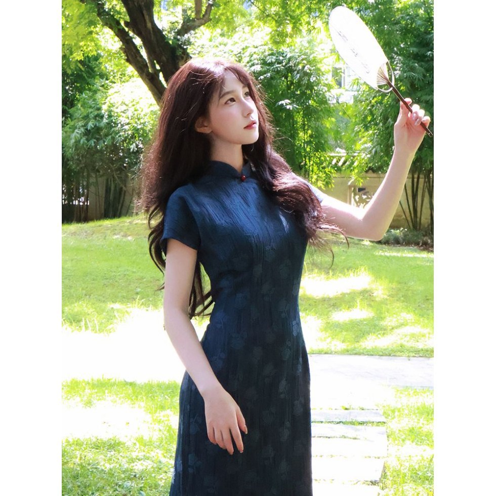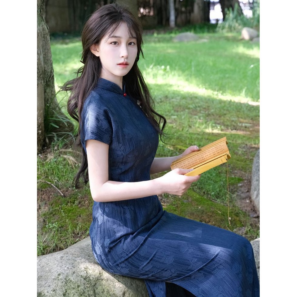Новый китайский Cheongsam улучшенный молодой девушки 2025 новый летний стиль ретро синий жаккард можно носить ежедневно