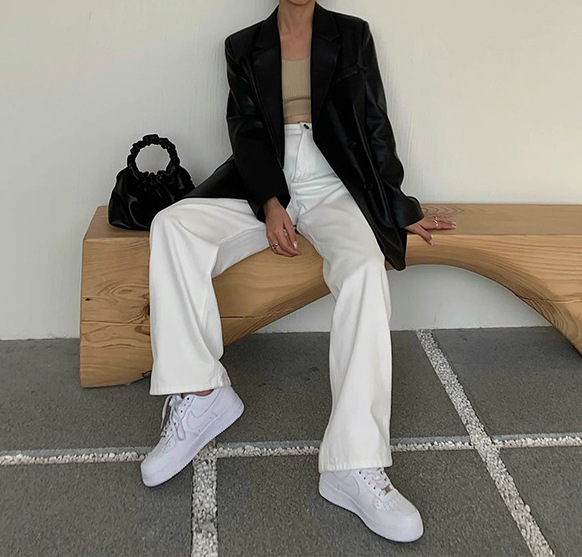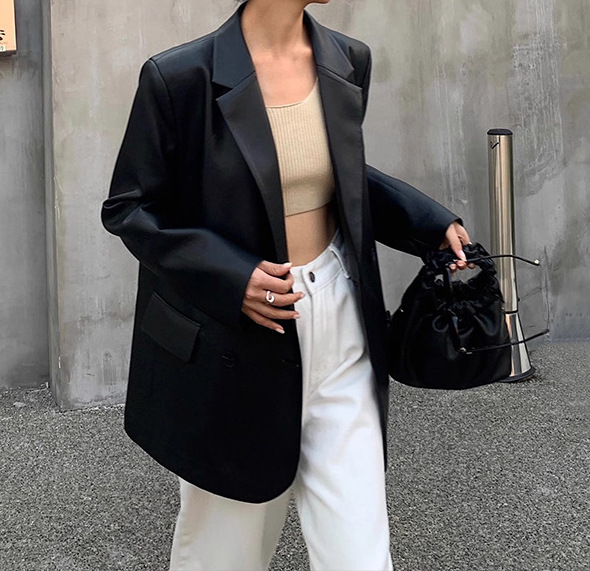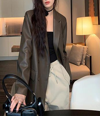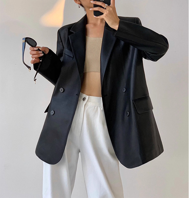 Черный костюм кожаный пиджак женский весна и осень 2025 новый стиль PUpu кожа премиум-класса жареная улица свободный повседневный кожаный костюм