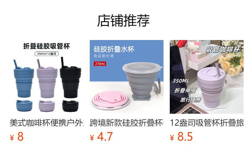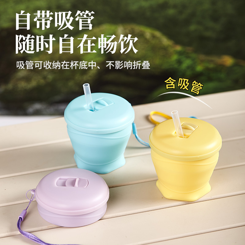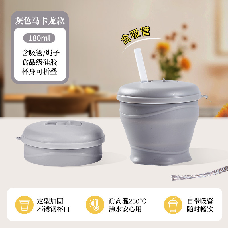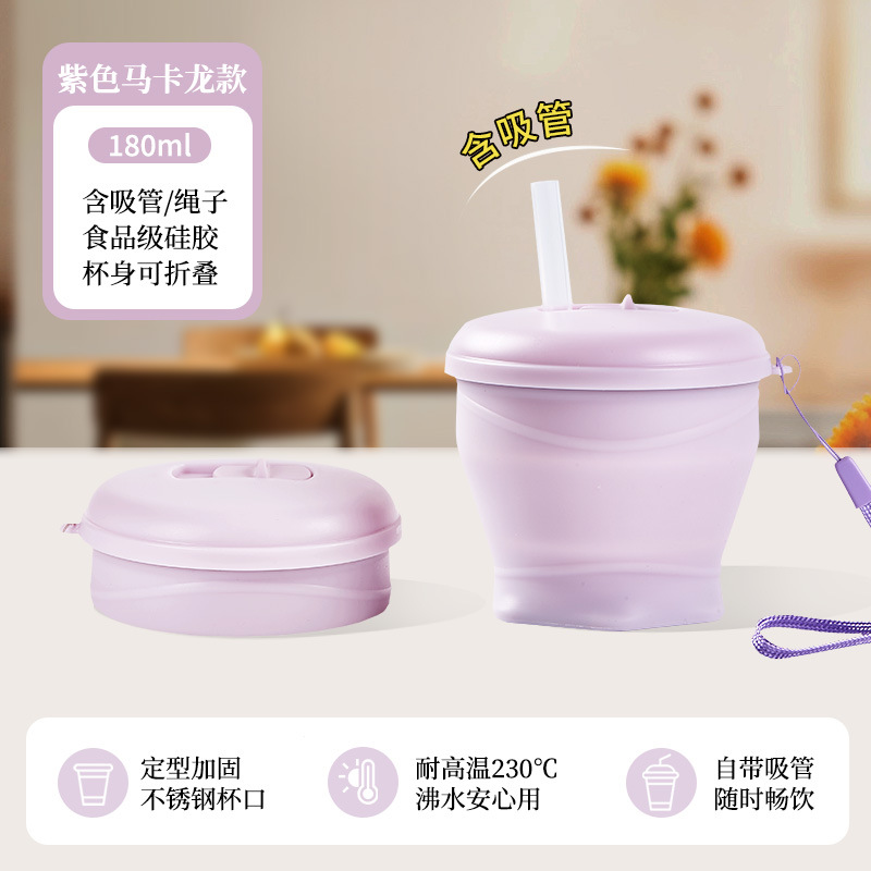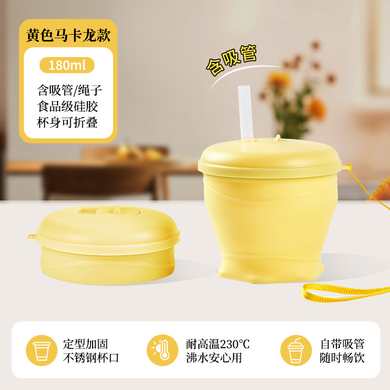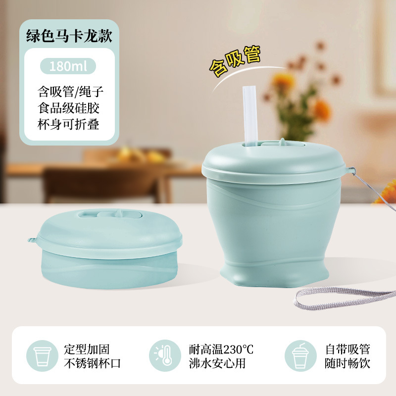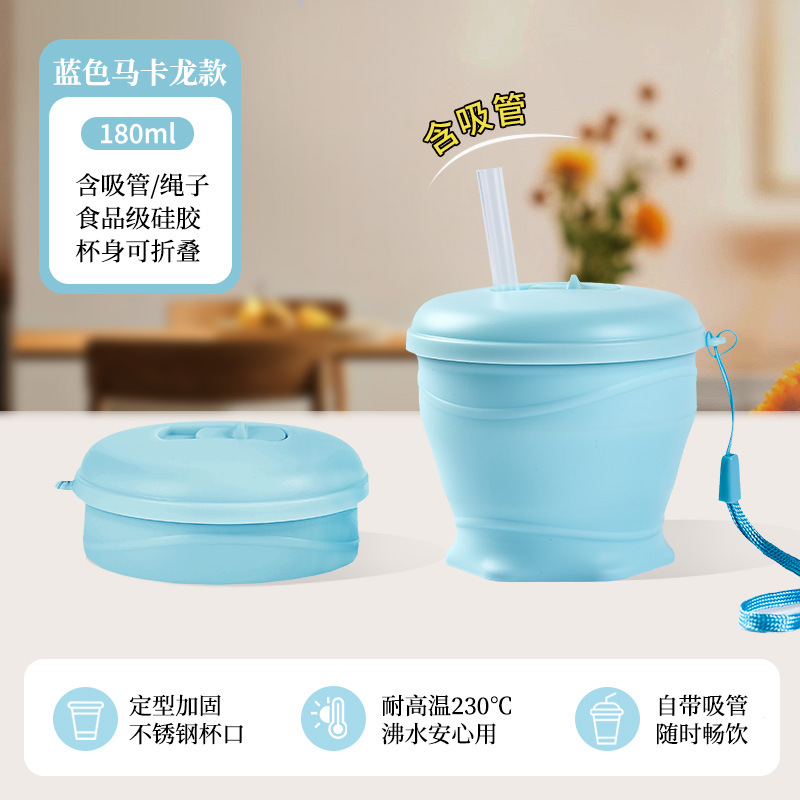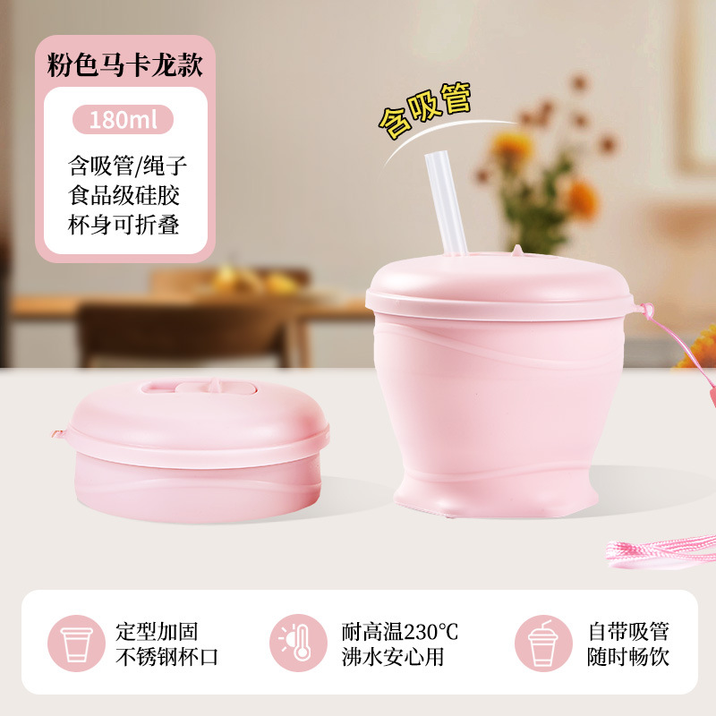 马卡龙口袋杯(S22)参数:1.材质:食品级硅胶+304不锈钢 2.尺寸:87*140(58)mm 彩盒尺寸:76*76*73(30)cm 3.容量:180ml 4.重量:68g 5.包装:OPP袋(彩盒+0.2元)