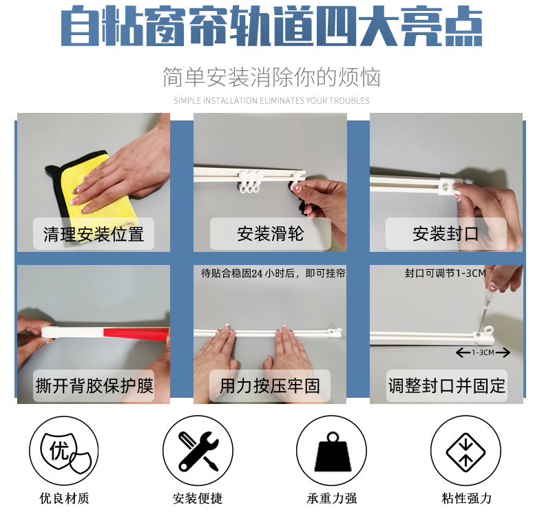 Карниз для штор, без сверления, с боковым креплением, потолочный, самоклеящийся, бесшумный, с креплением на клейкой основе, без необходимости сверления.