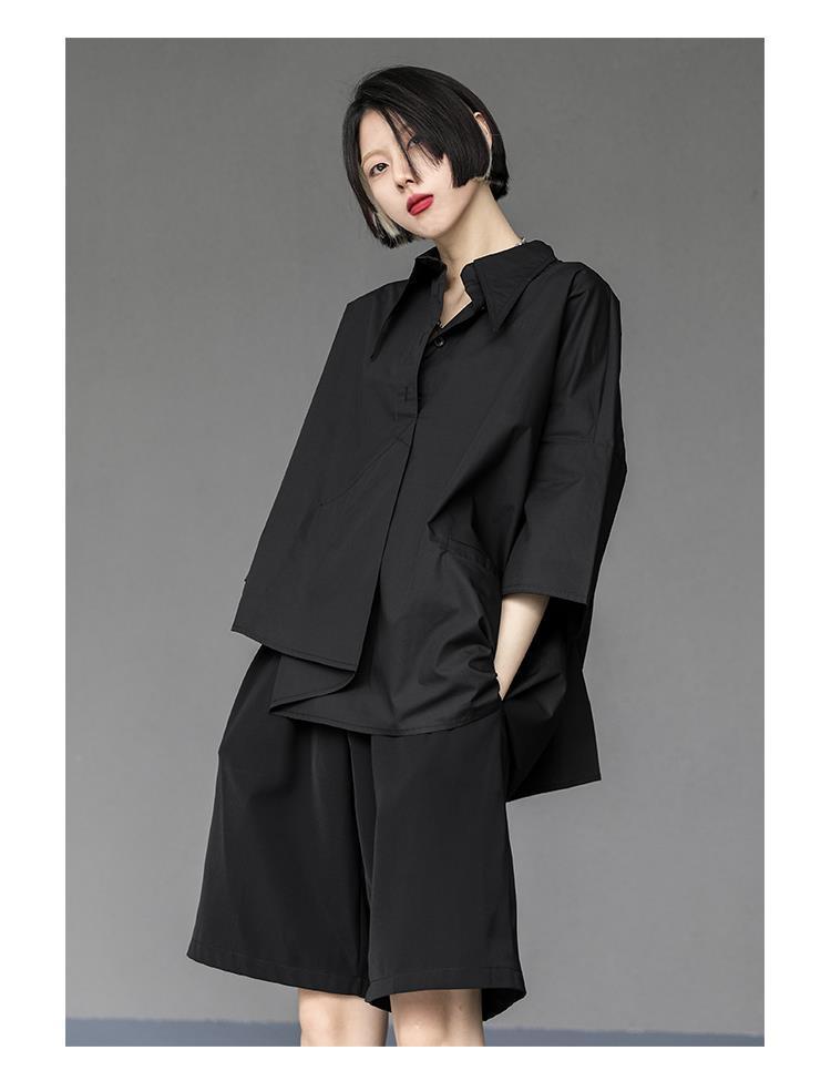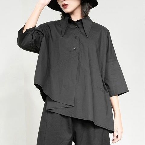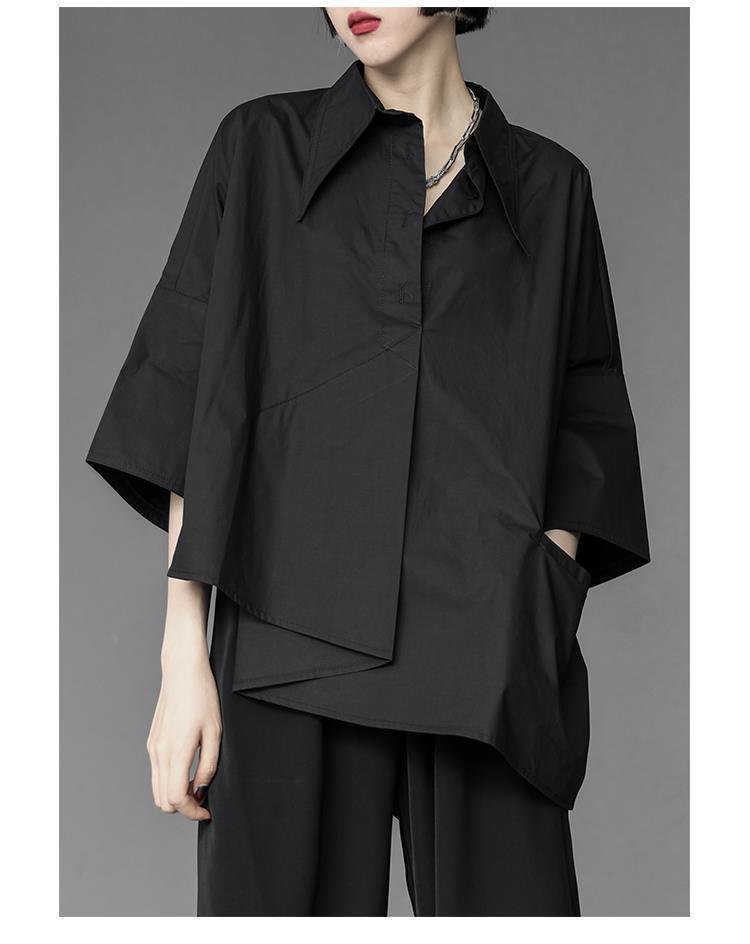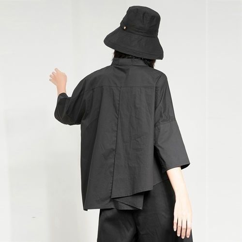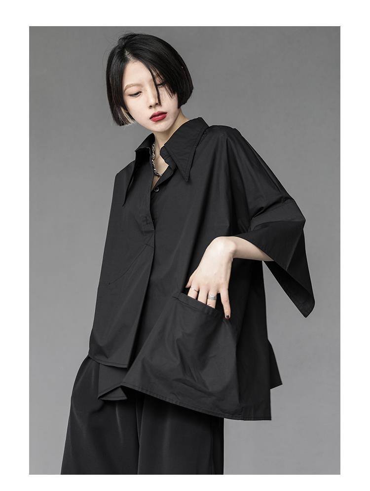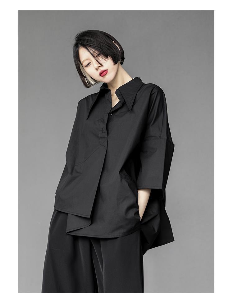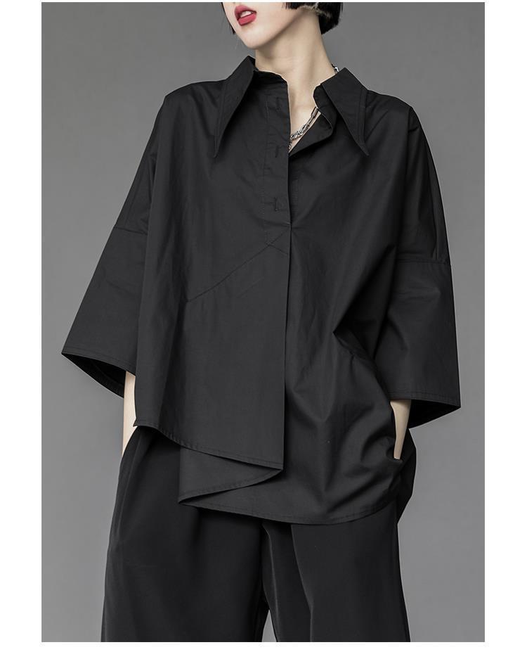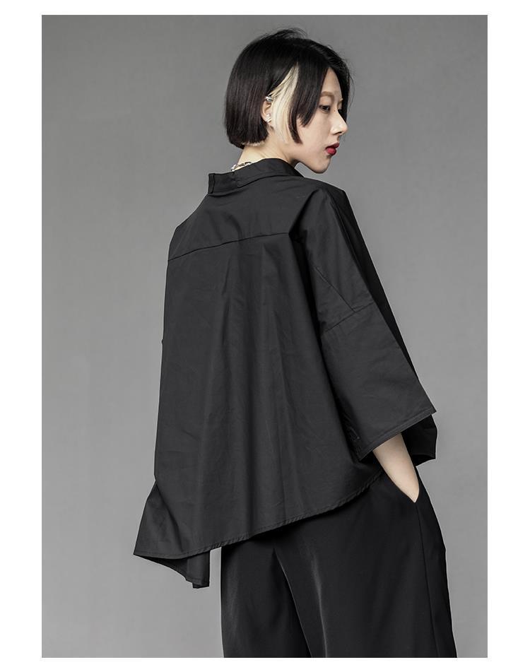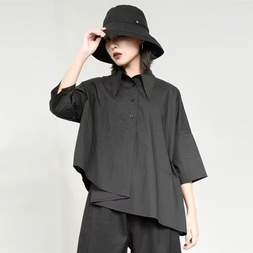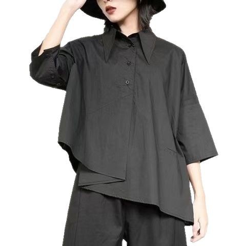 Весенний и летний новый нерегулярный тяжелый рабочий женский лацканный рукав рубашка с семью рукавами тонкий топ темно-bf ветровая рубашка