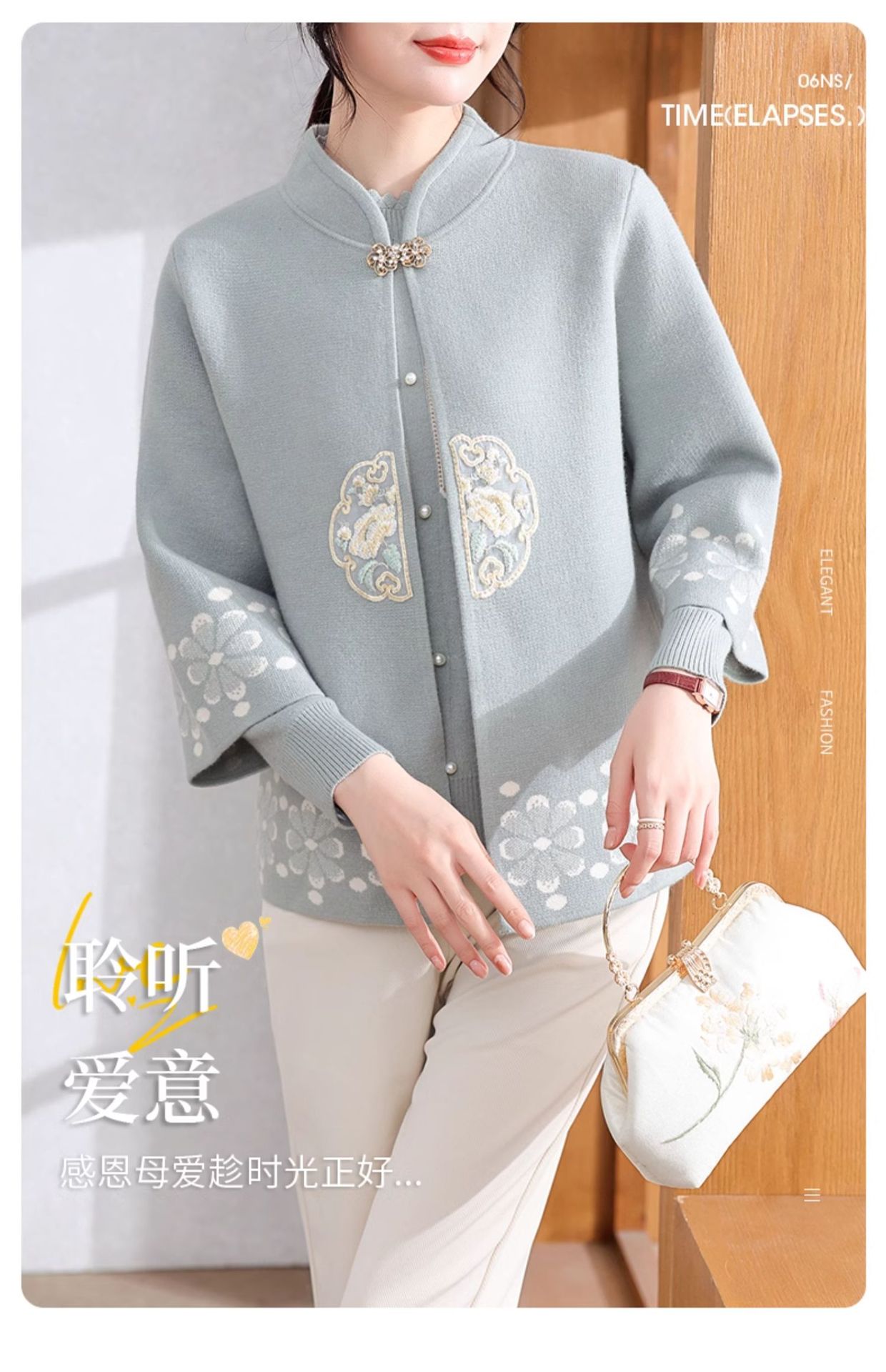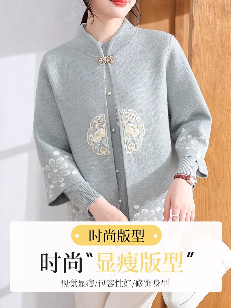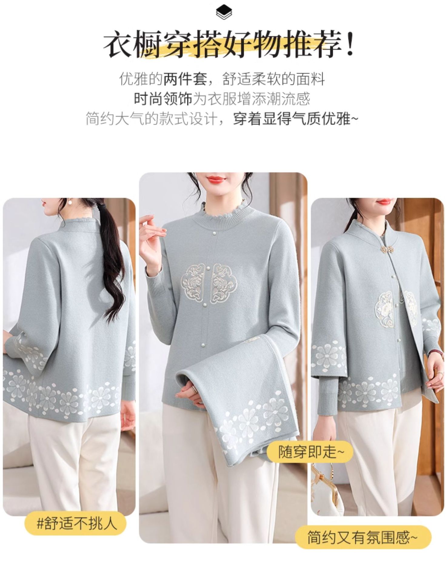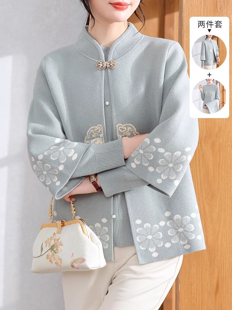 Комплект женской одежды для женщин среднего возраста: вязаный свитер и пальто на весну и осень, новый китайский стиль, национальный модный комплект из двух предметов для женщин среднего и старшего возраста.