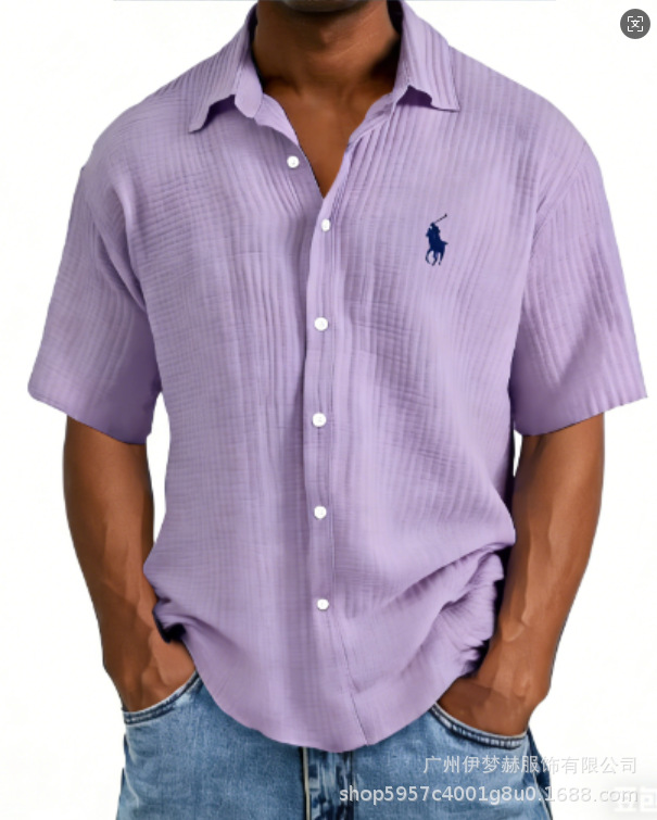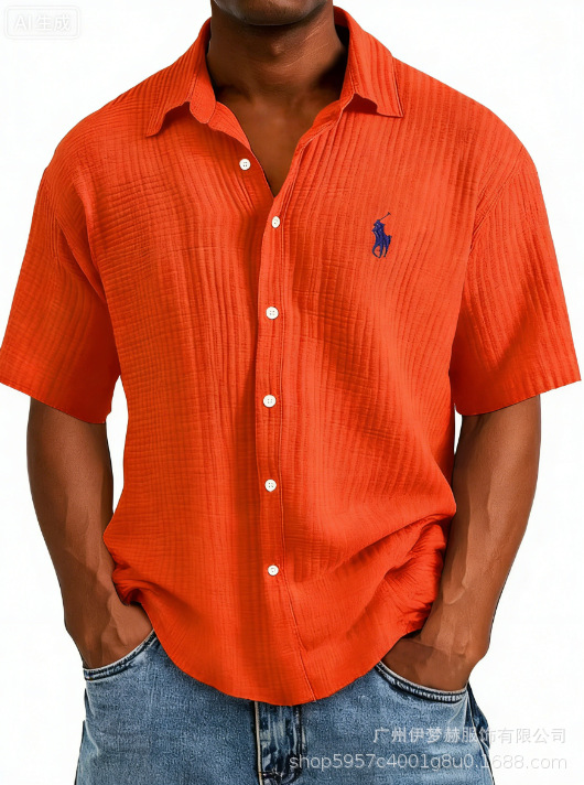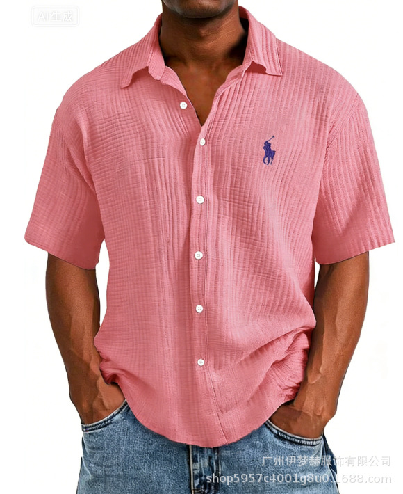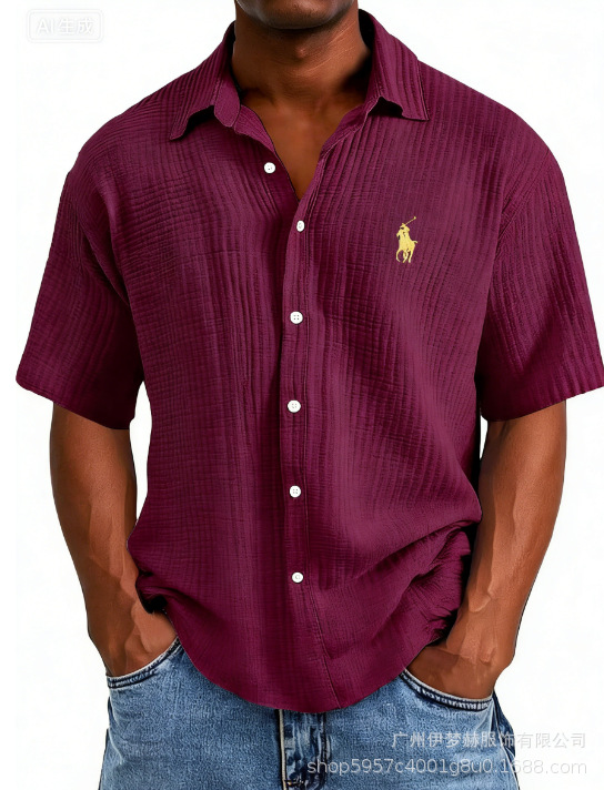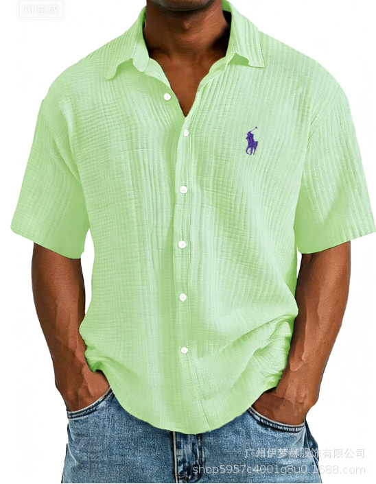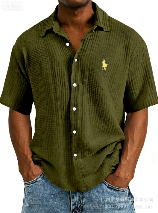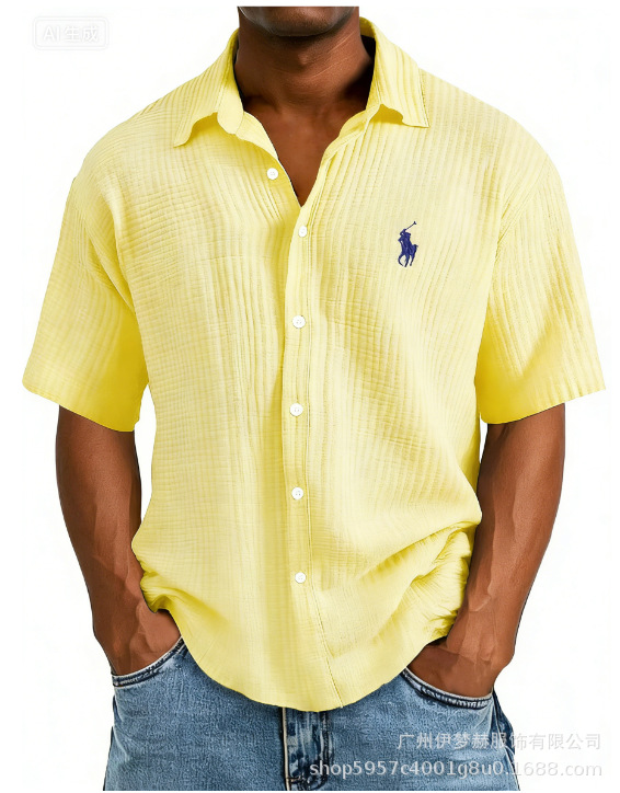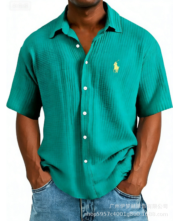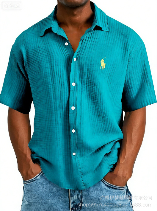 Tiktok temu2025 новый трансграничный плюс размер рубашка вышитая мужская свободная хлопковая рубашка с короткими рукавами с отворотом