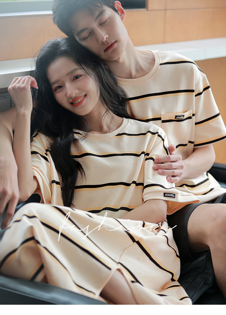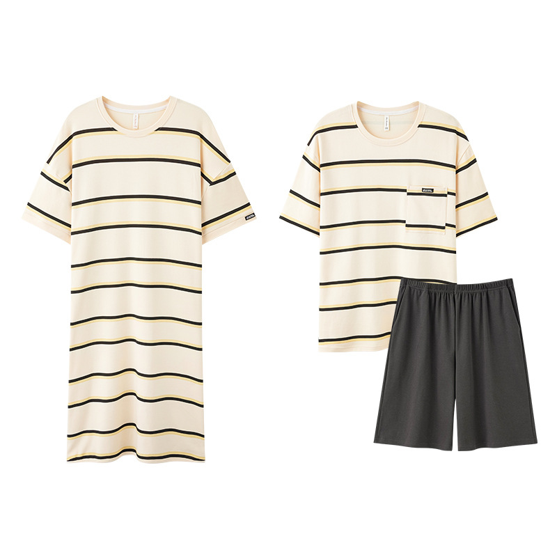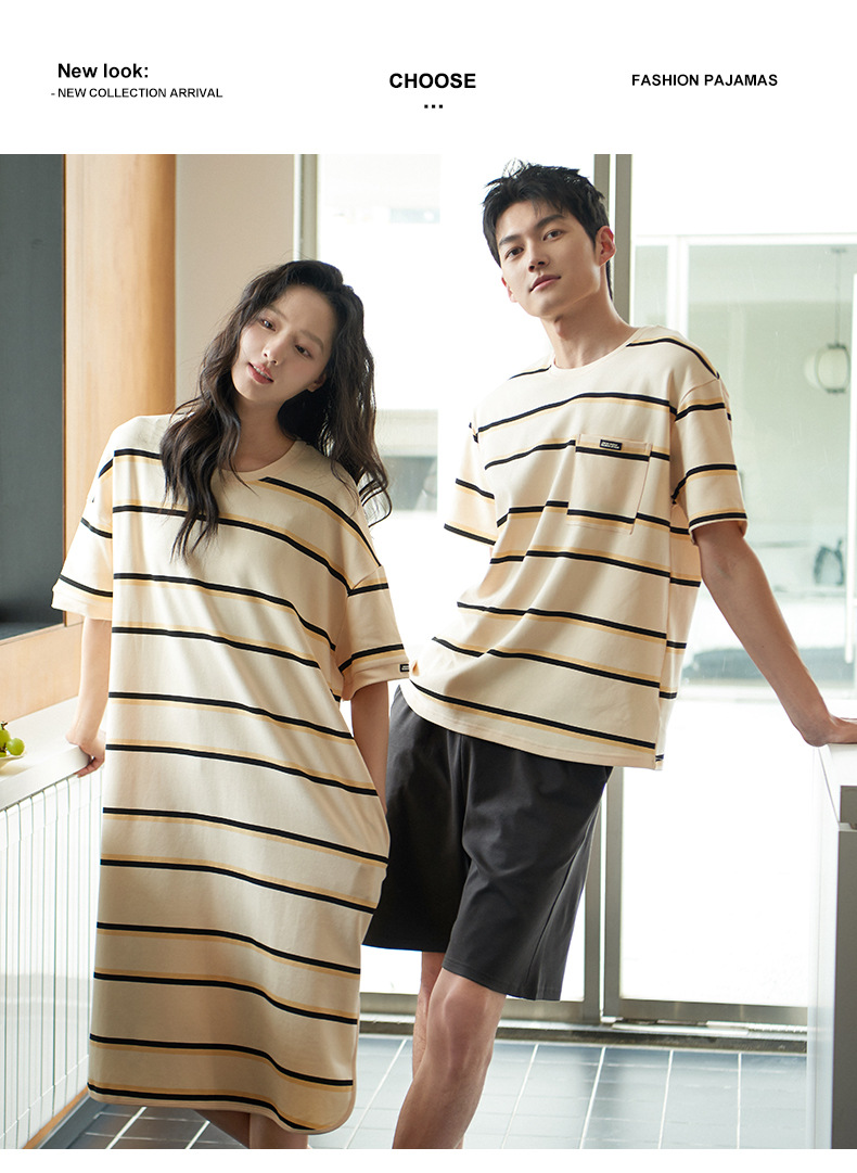 Летние пижамы для пар, женские полосатые ночные рубашки из чистого хлопка с короткими рукавами, тонкая и свободная домашняя одежда для мужчин, которую можно носить и на улице.