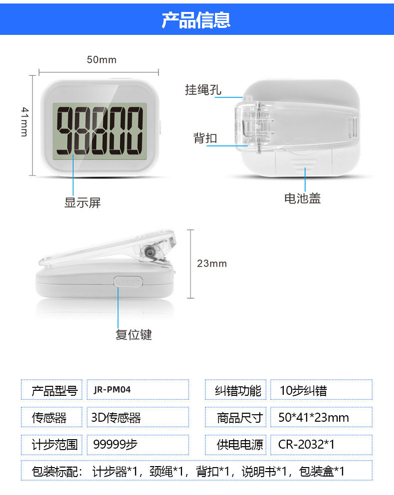 Functions:Count steps,Reset,Sleep mode,10 steps correction