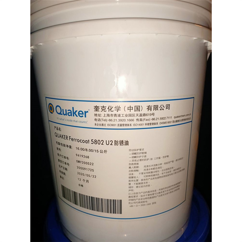 QUAKER FERROCOAT 5802 U2 奎克触变性防锈剂5802 U2 是一种触变性防锈剂,能对黑色或有色金属表面提供长期的室内和室外保护,该产品能在工件表面形成一层轻微的触变性脂状膜。产品的触变性能提供短期的排水性,沉积膜能很容易用工业清洗方法清洗掉,因为触变性膜通过轻微的机械搅动或加热就能液化。