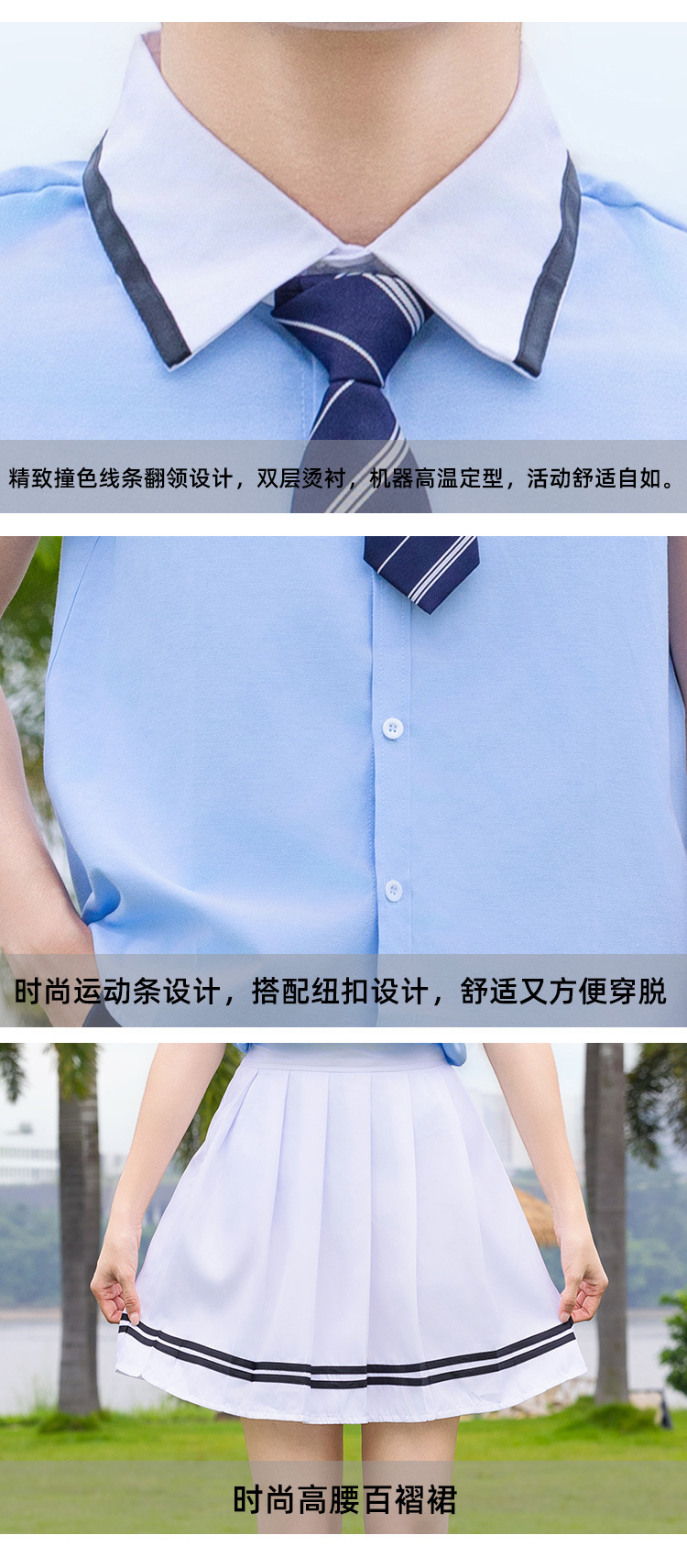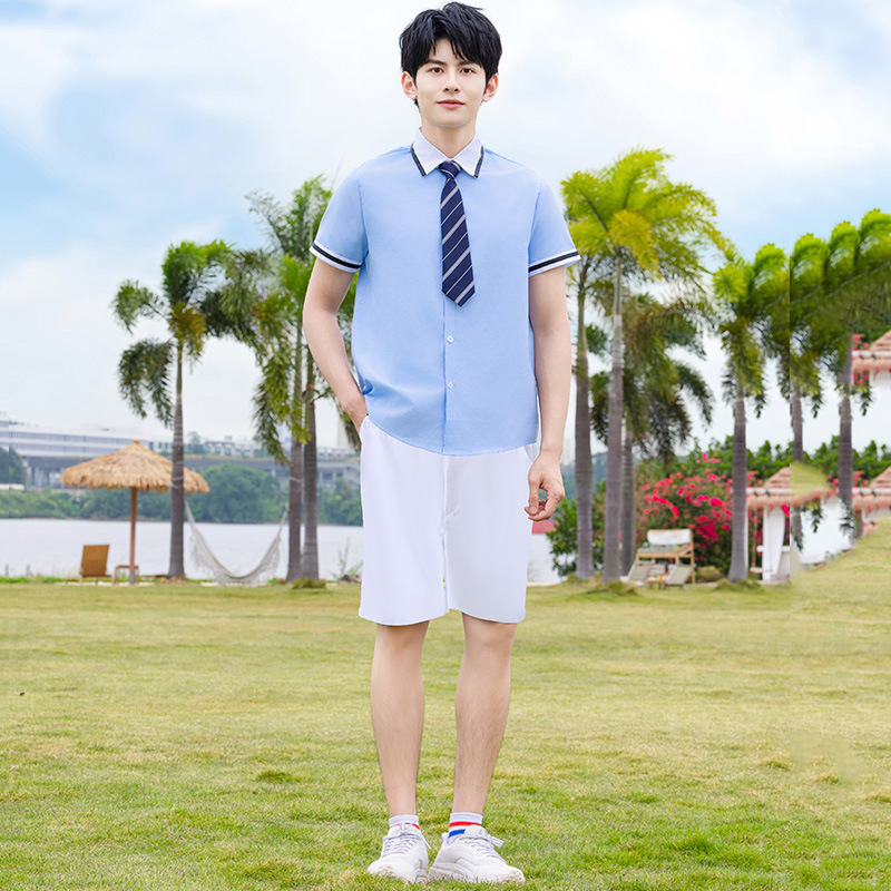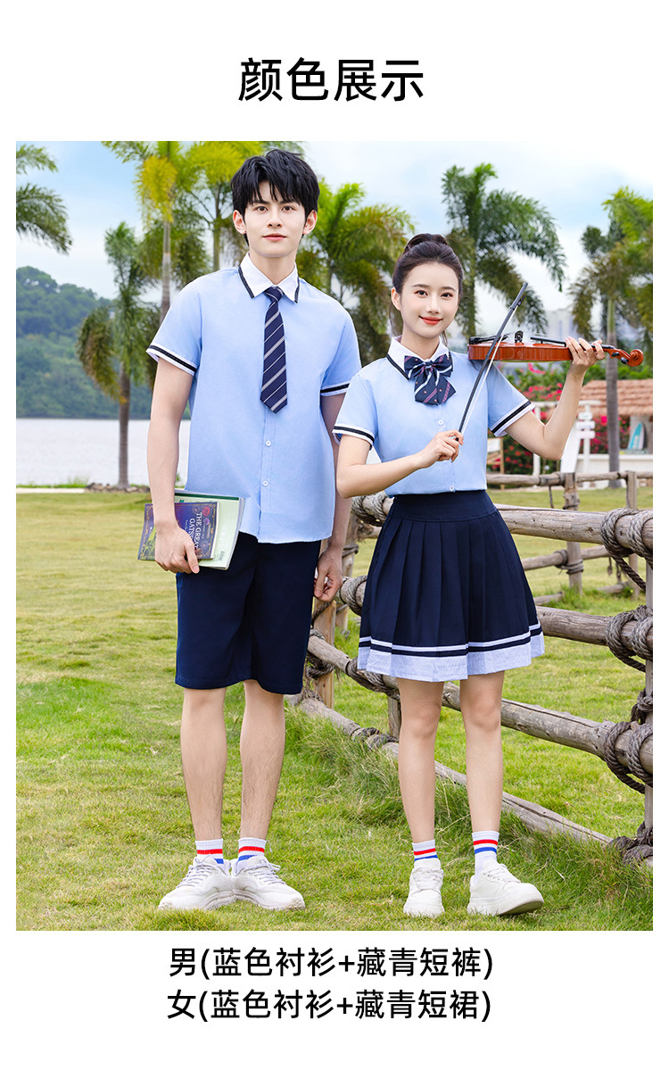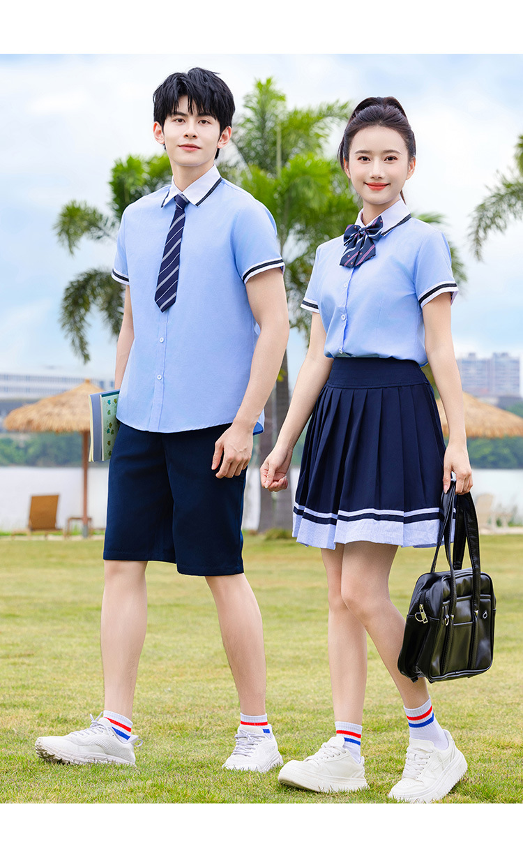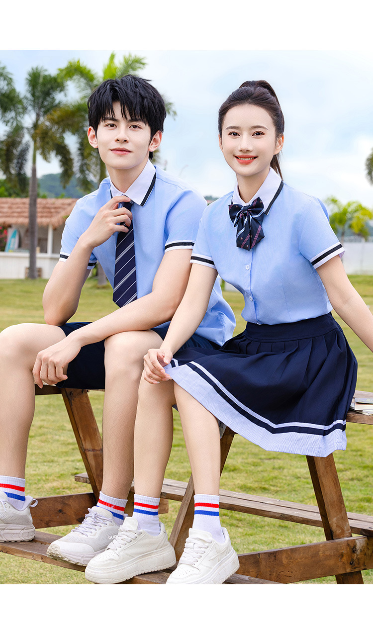 Женская синяя рубашка + темно-синяя лоскутная юбка; Женская синяя рубашка + темно-синие брюки-кюлоты; Женская синяя рубашка + темно-синие однотонные брюки-кюлоты; Женская синяя рубашка + черные темно-синие брюки-кюлоты; Женская синяя рубашка + черные однотонные брюки-кюлоты; Женская синяя рубашка + чисто белые брюки-кюлоты; Женская синяя рубашка + белые темно-синие брюки-кюлоты; Мужская синяя рубашка + белые шорты; Мужская синяя рубашка + темно-синие шорты; Мужская синяя рубашка + черные шорты