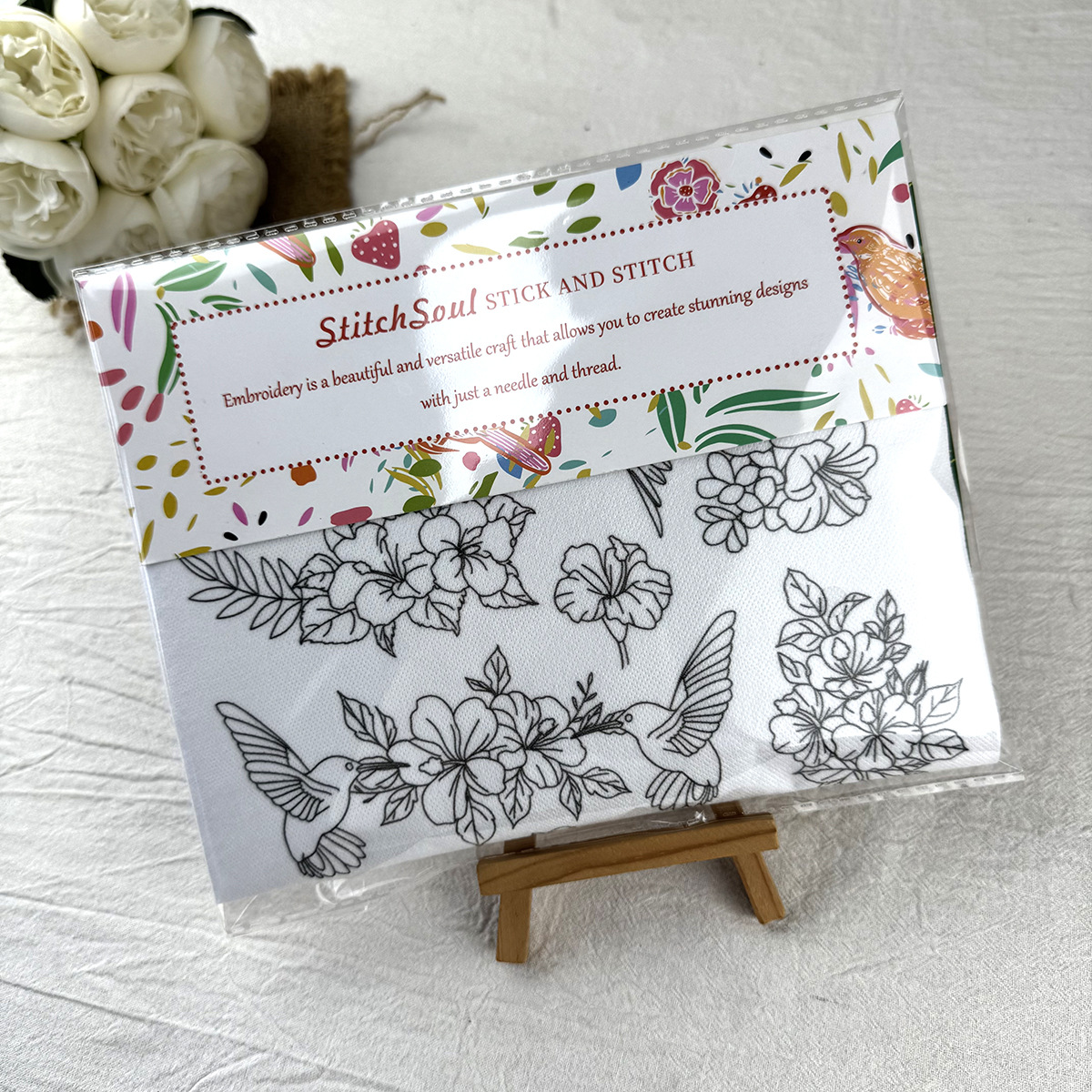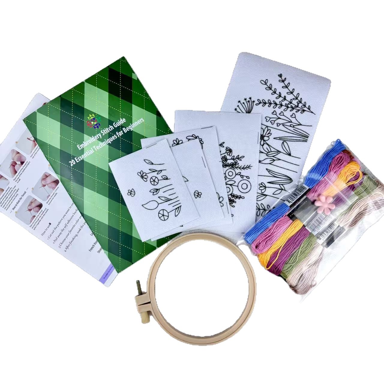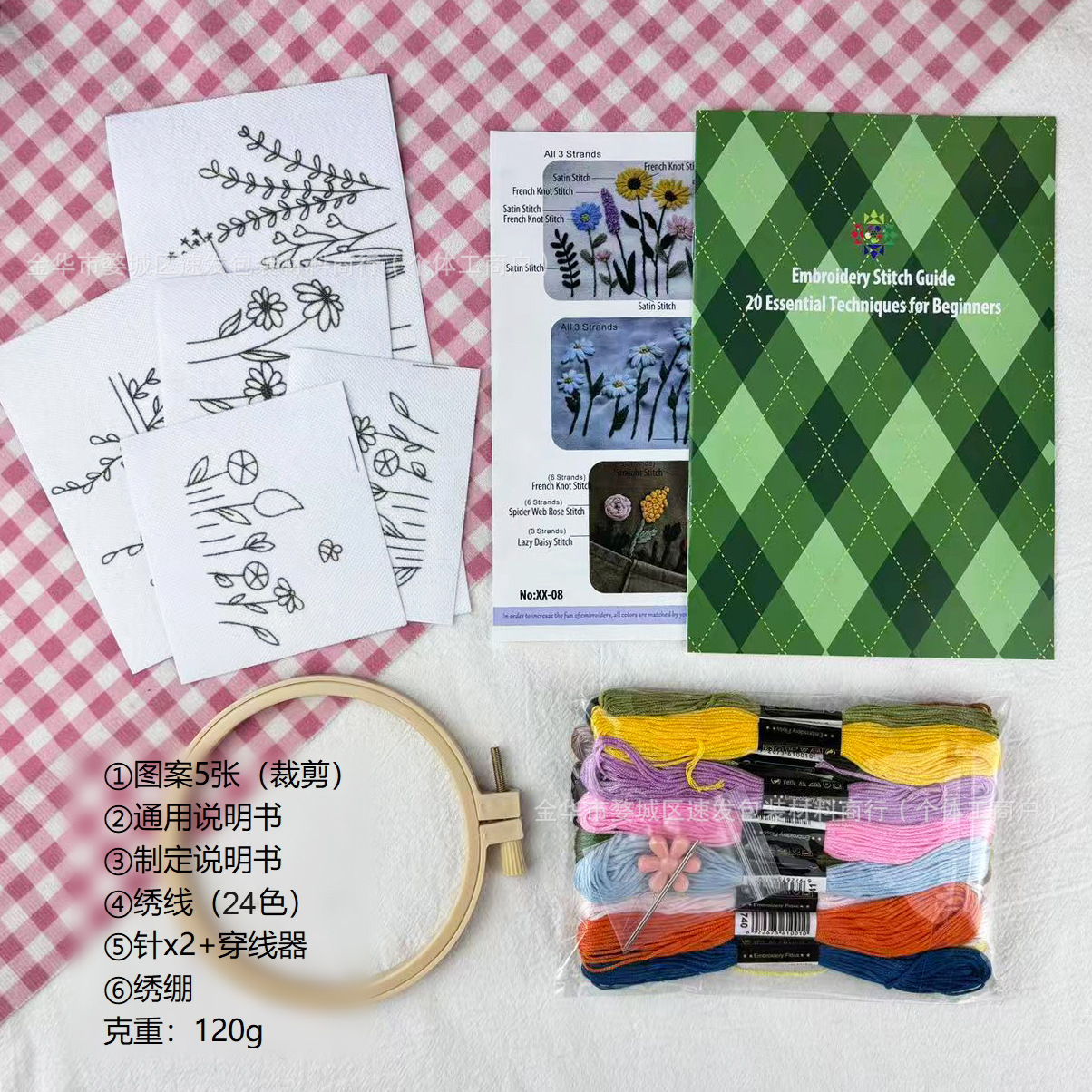 产品明细:5张 50克加厚高品质冷水溶无纺布(4个款式,另送一张同款,共5张)+12色特配色绣线+2根5cm刺绣针+1个粉色小花穿线器+12cm仿竹绣绷+一份英文说明+一本刺绣针法册子+OPP袋