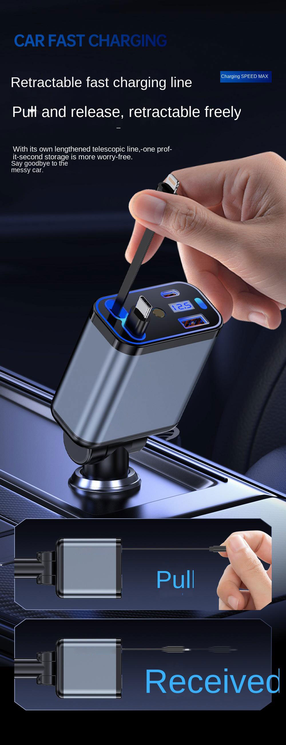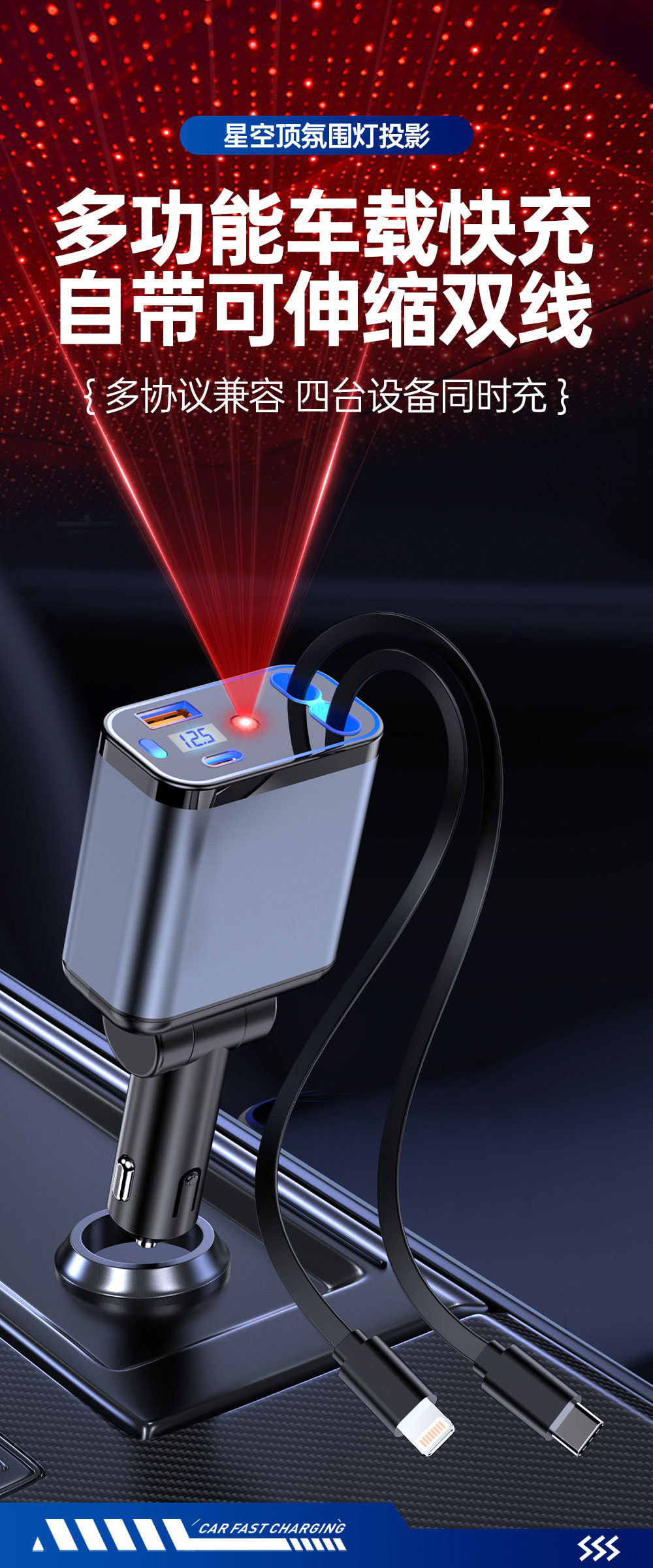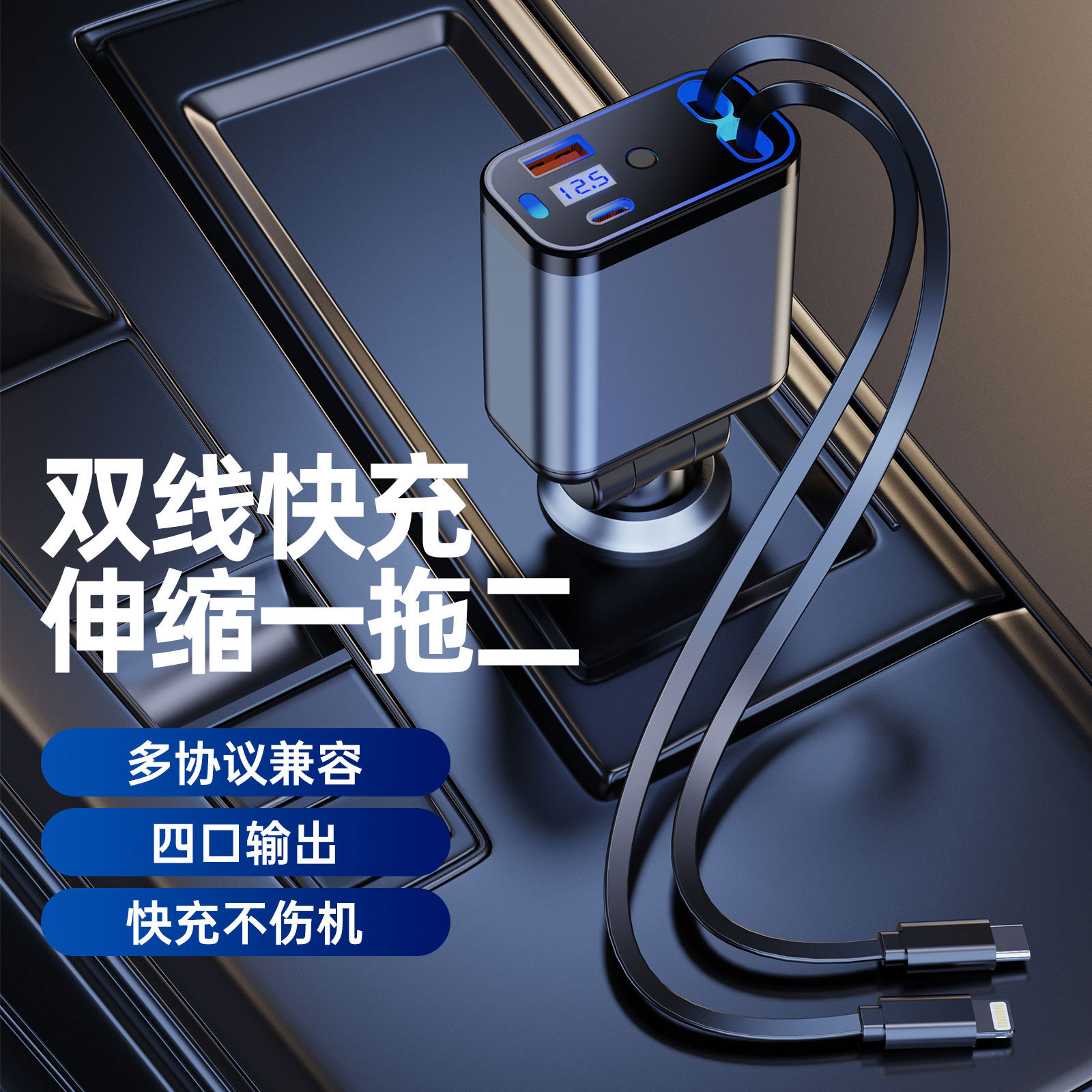 Трансграничное металлическое автомобильное зарядное устройство супер быстрая зарядка четыре в одном телескопическая линия PD быстрая зарядка прикуривателя автомобиля оптом